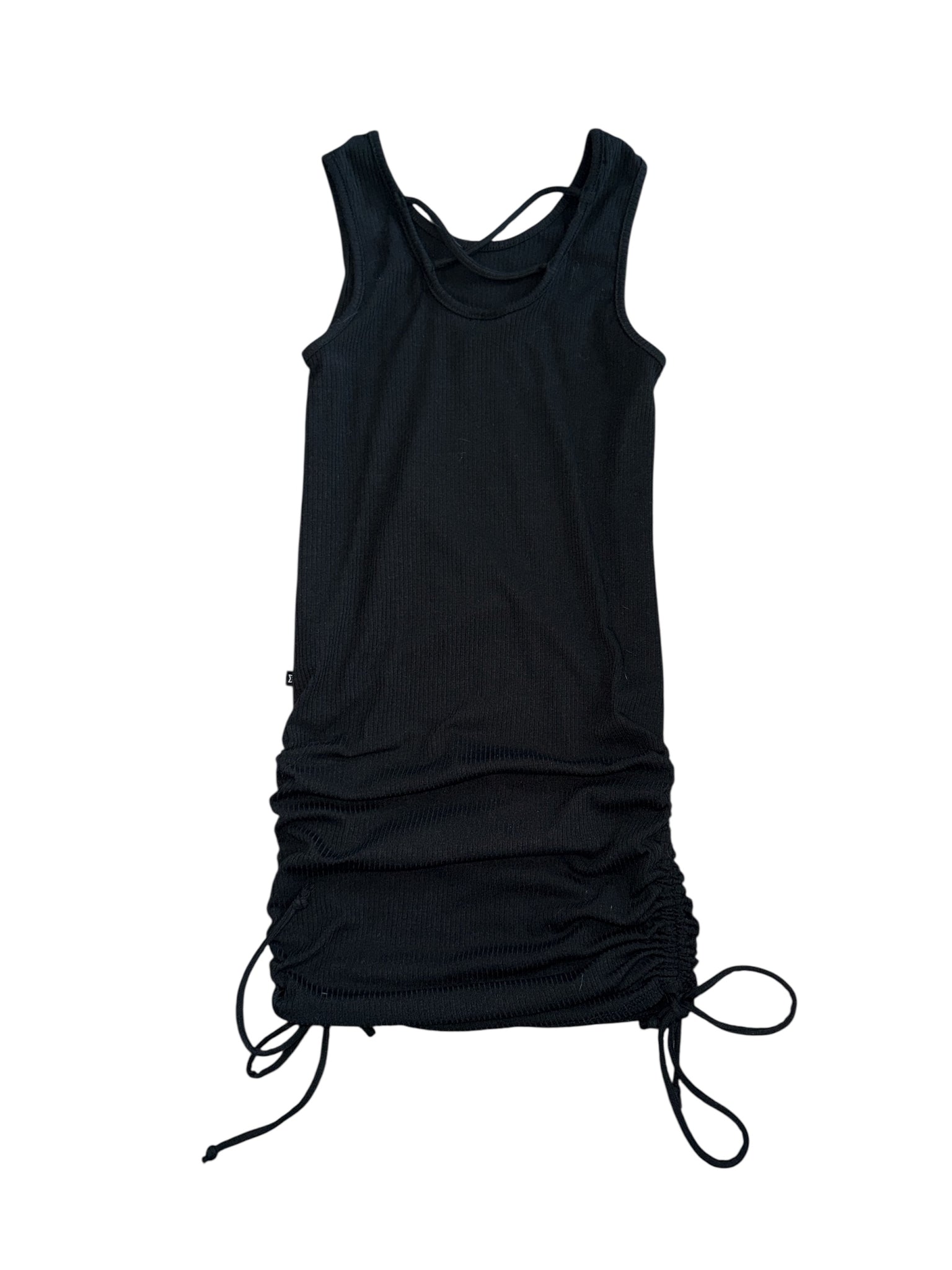 Pixie Lane girls black stretchy, ribbed tank dress with ruched sides that cinch and tie, size 11-12.