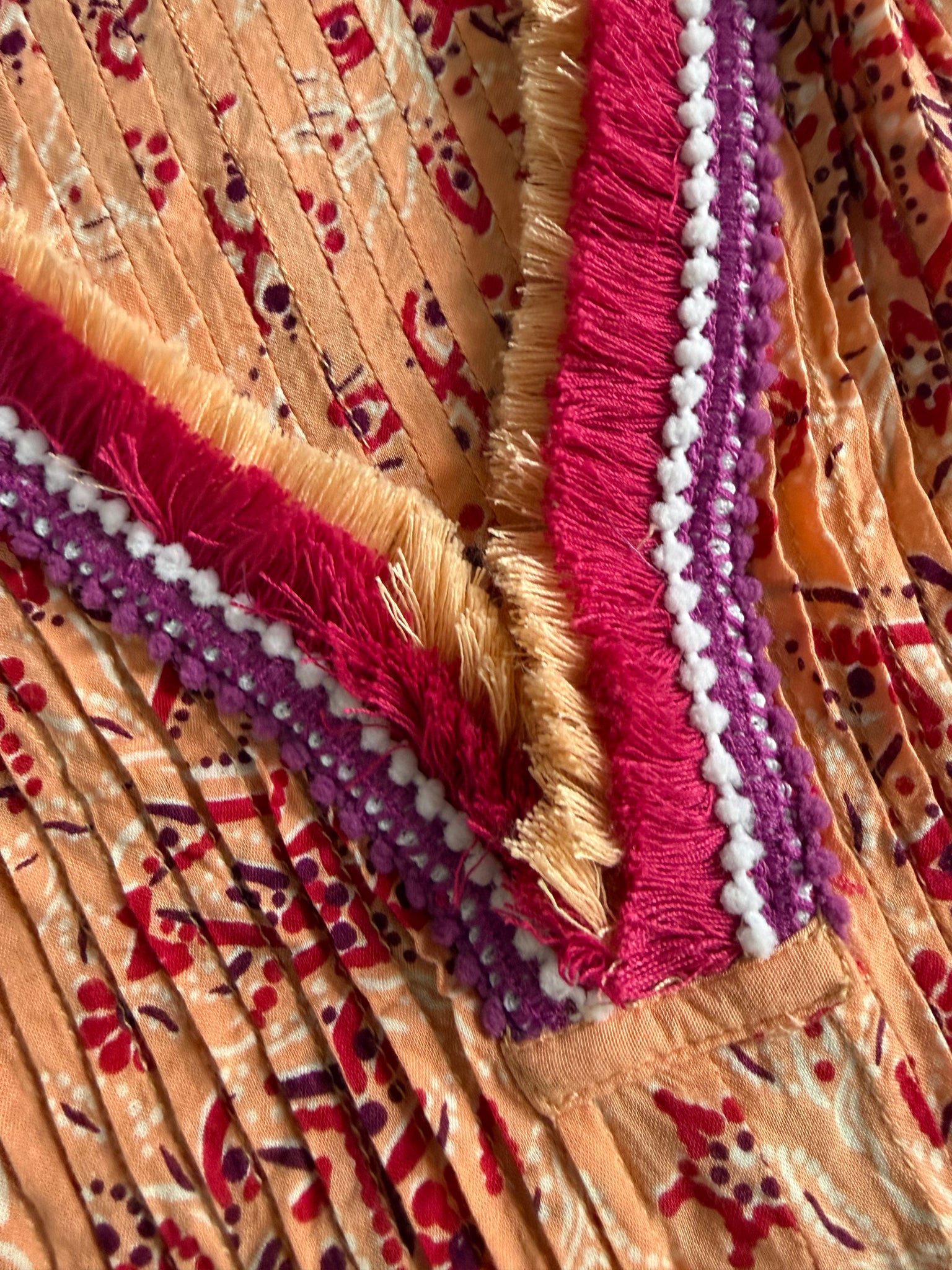 Poupette St Barth girls peach mini dress with flutter sleeve, colorful fringed neckline, and double lace trim hem with red printed pattern, size 10.