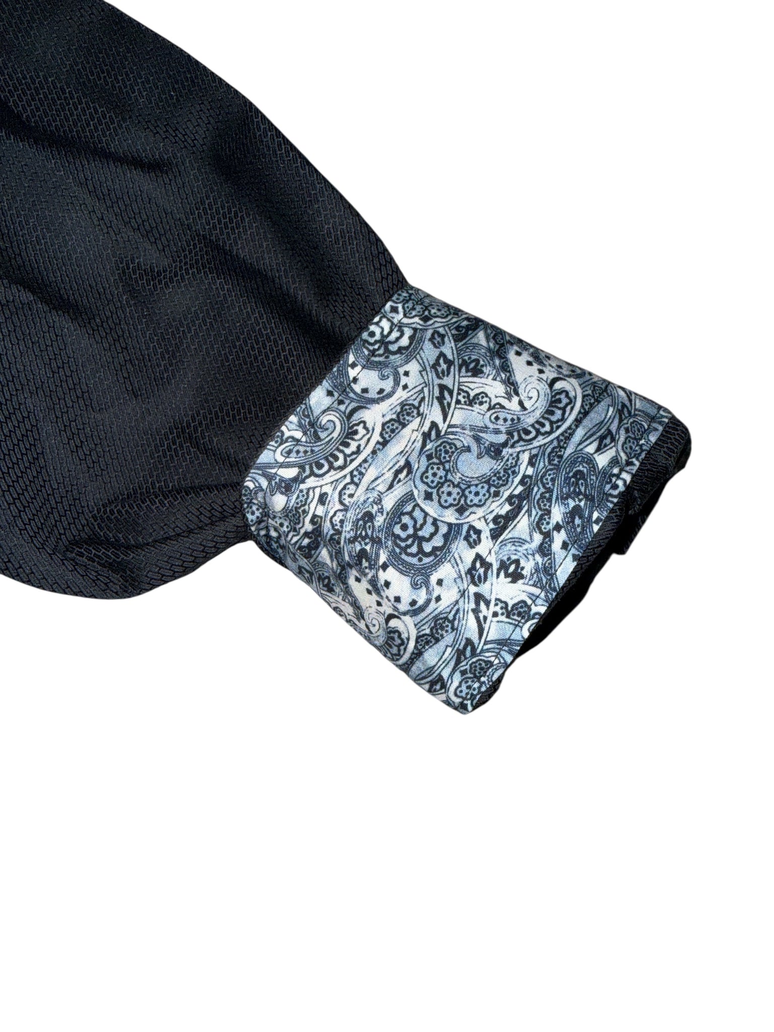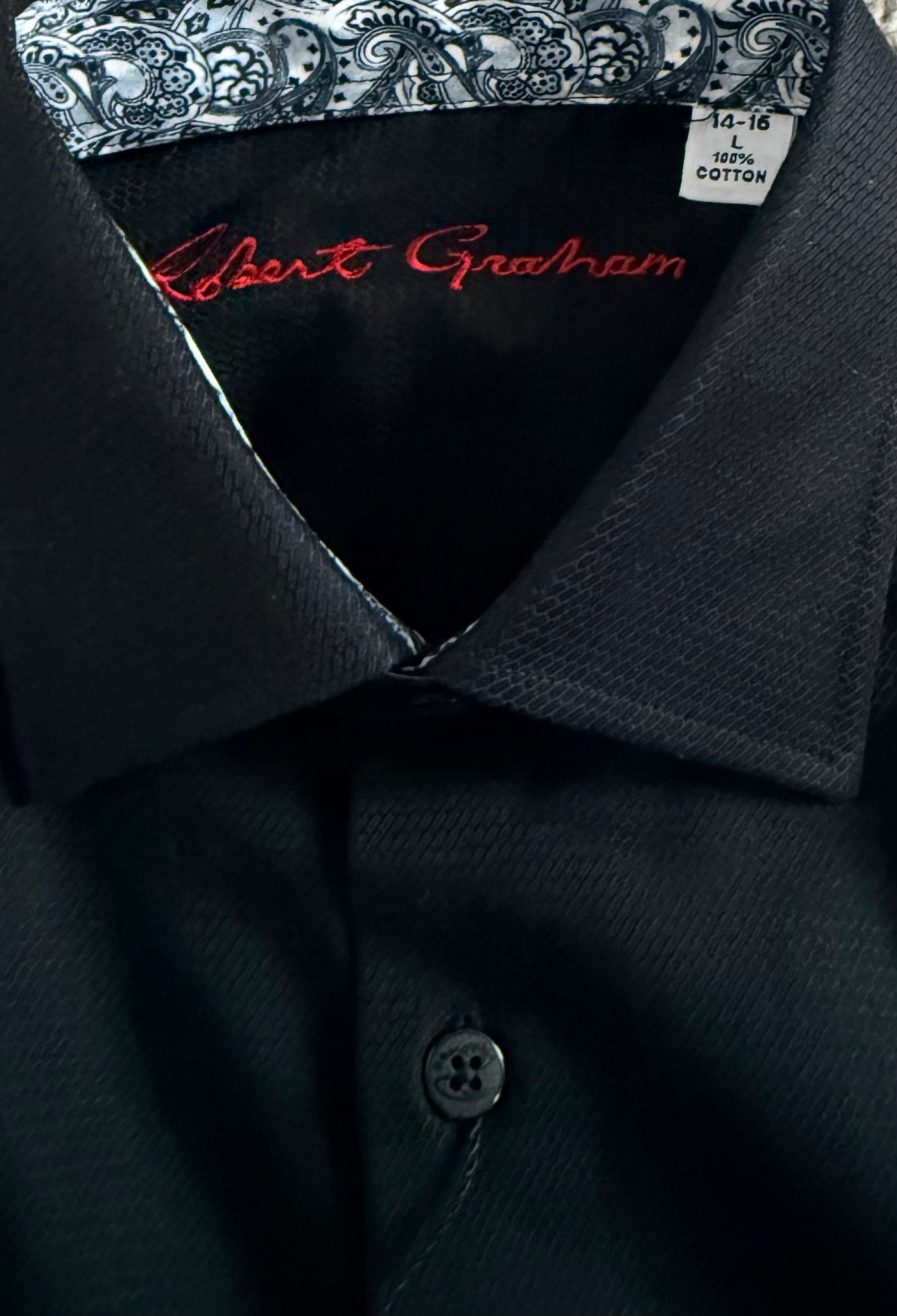 Robert Graham Boys black button down dress shirt with blue paisley design inside cuffs and collar, and on trims, size L(16).