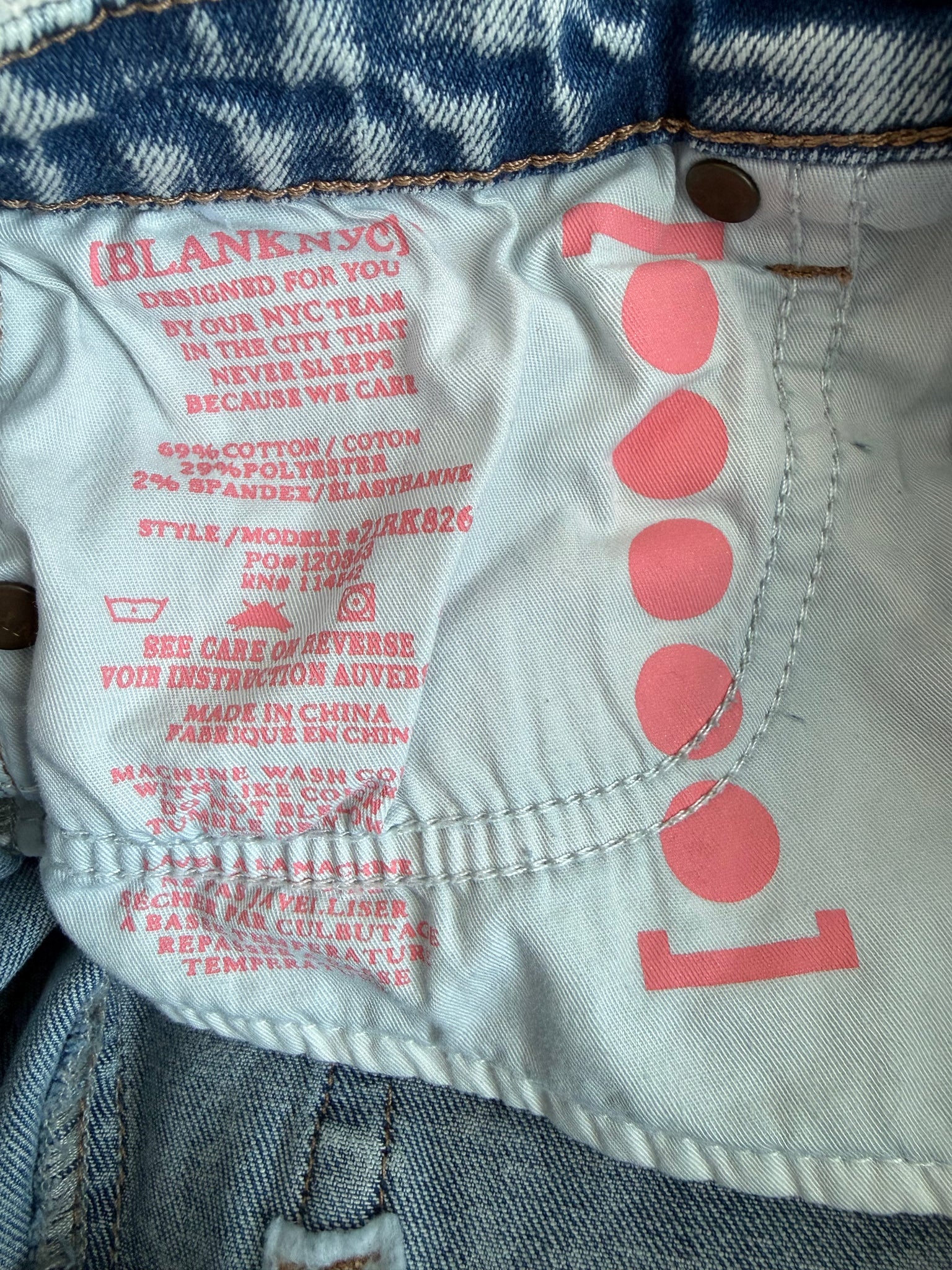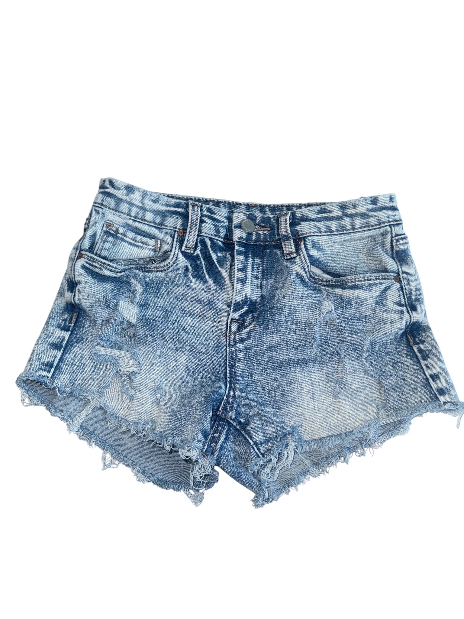 Blank NYC girls mid rise, ripped cutoff light wash denim jean shorts with slight high low hem, size 12.