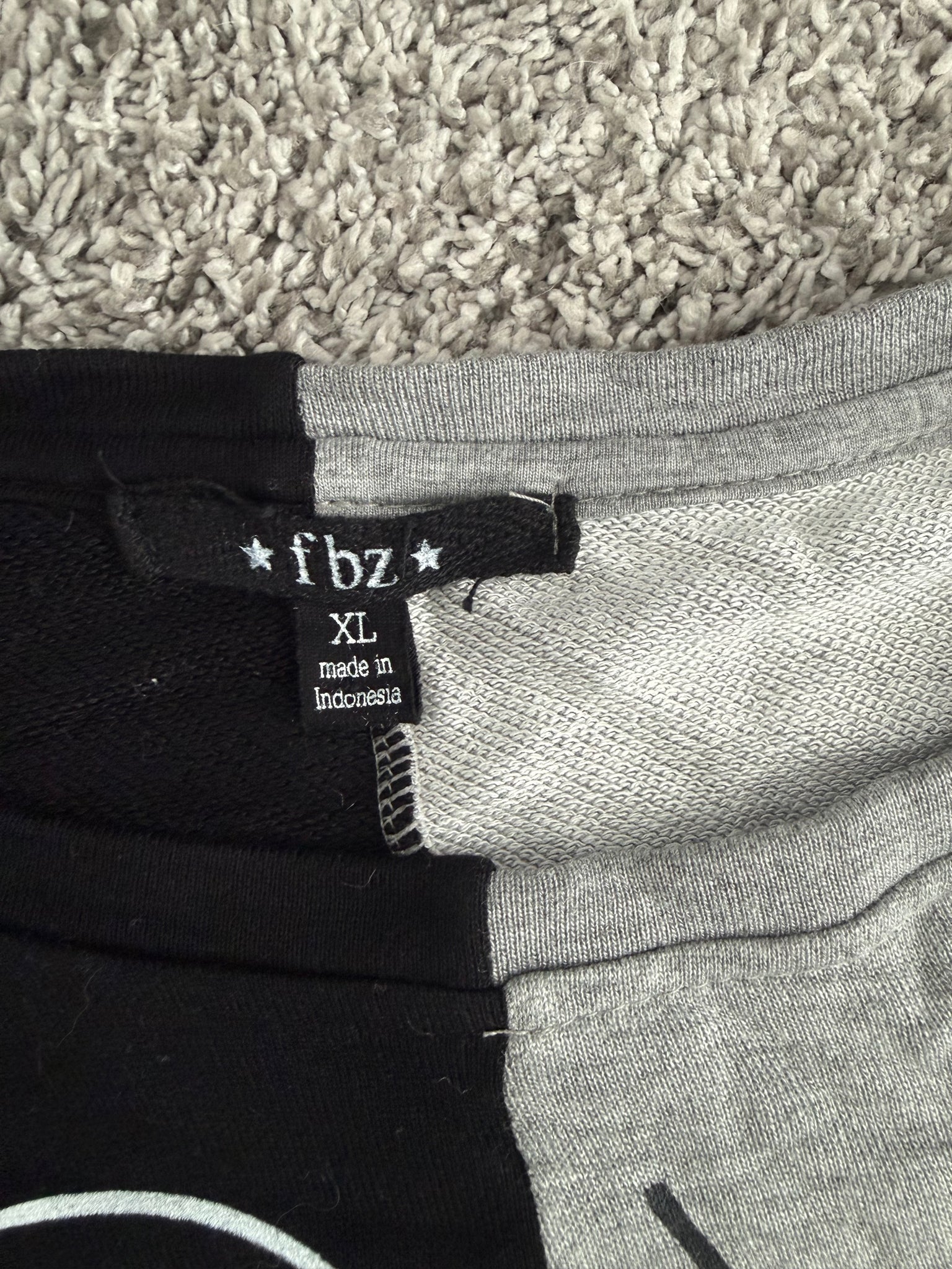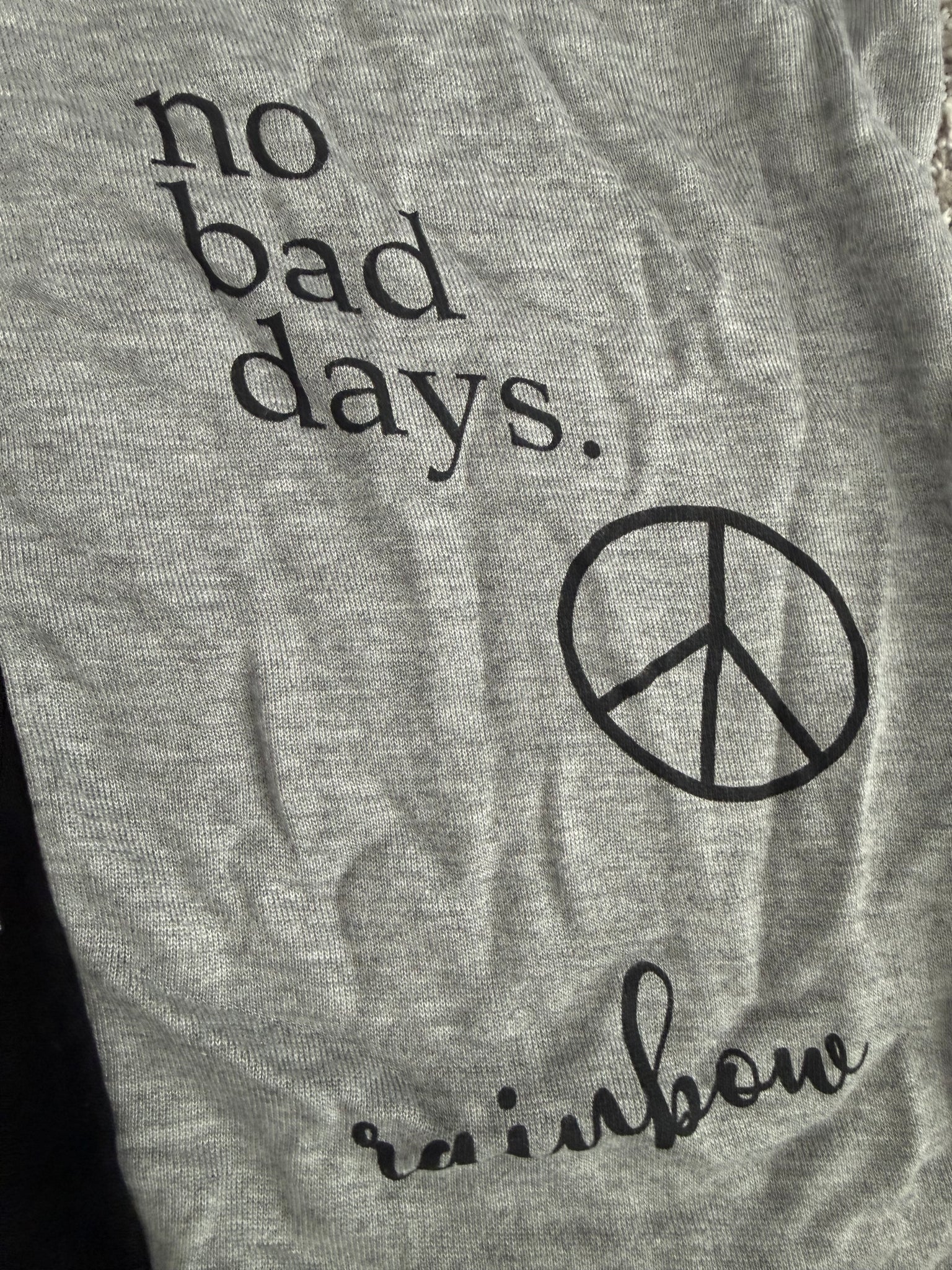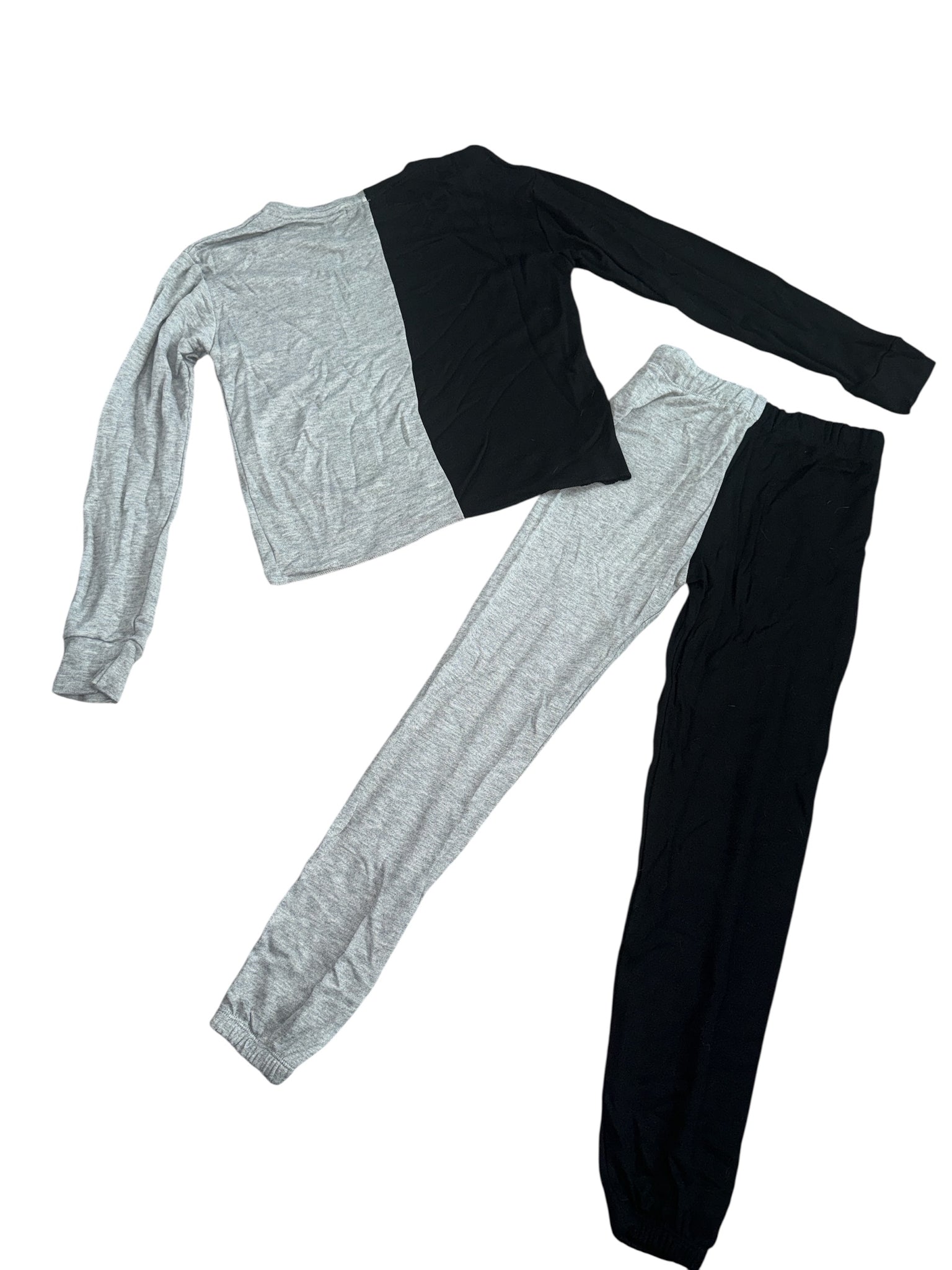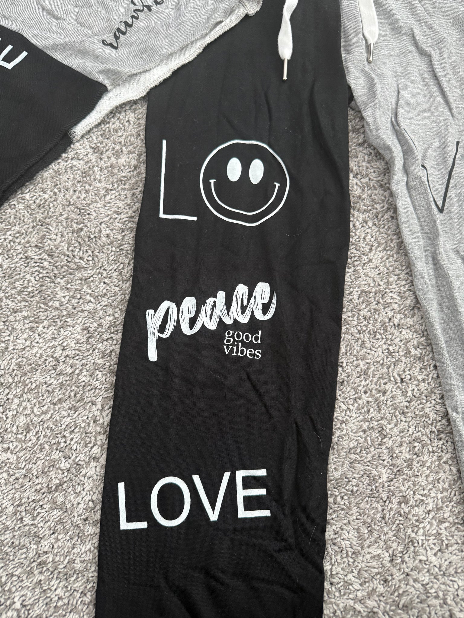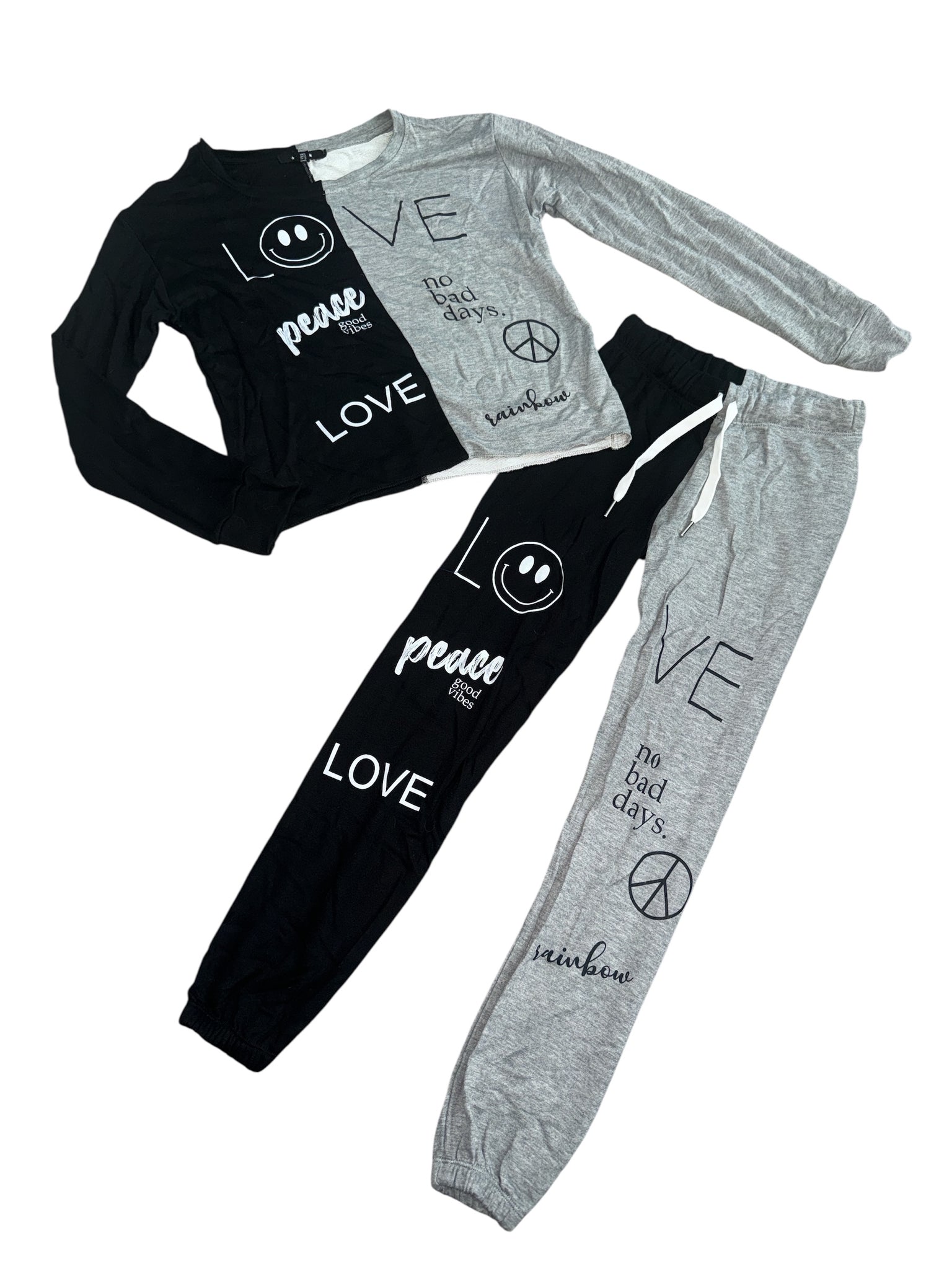 Flowers By Zoe girls 2pc sweatsuit - colorblock(black/heather gray), with Love, Peace, No Bad Days, Good Vibes, rainbow, and graphics, size XL(14).