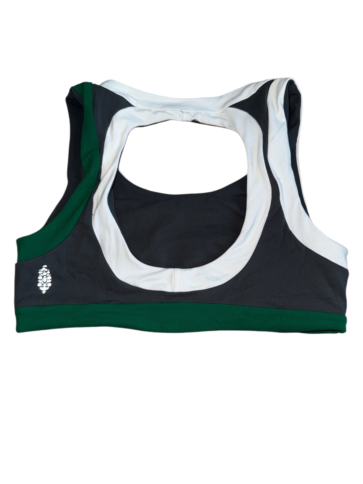 Free People Movement stretchy charcoal gray sports bra with dark green and white banding, and large circular cutout in back, size S -missing tag measurements below.
