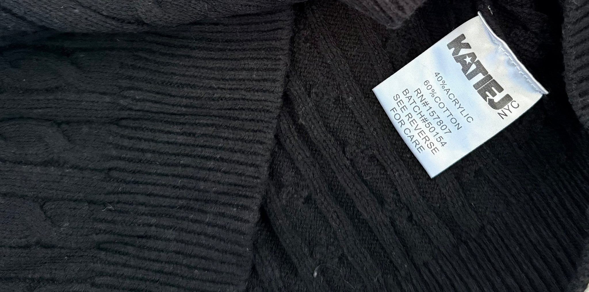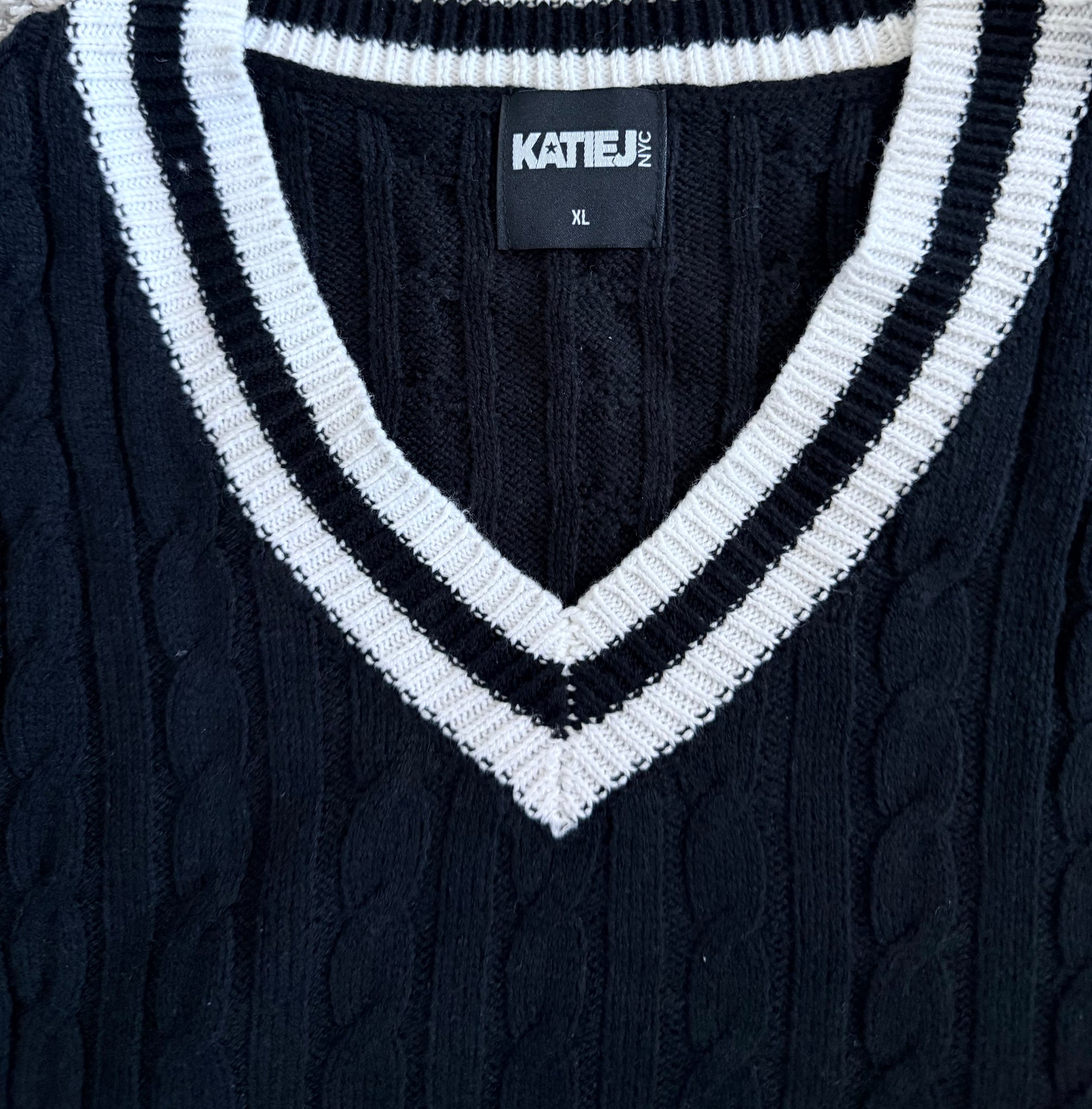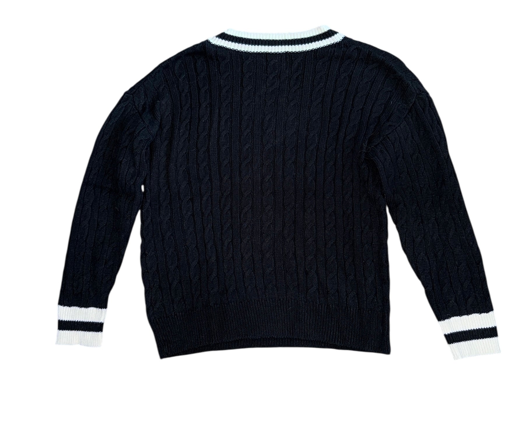 Katie J NYC tween girls soft Blair university black cable knit sweater with white trim around v-neck and wrist cuffs, size XL(14).