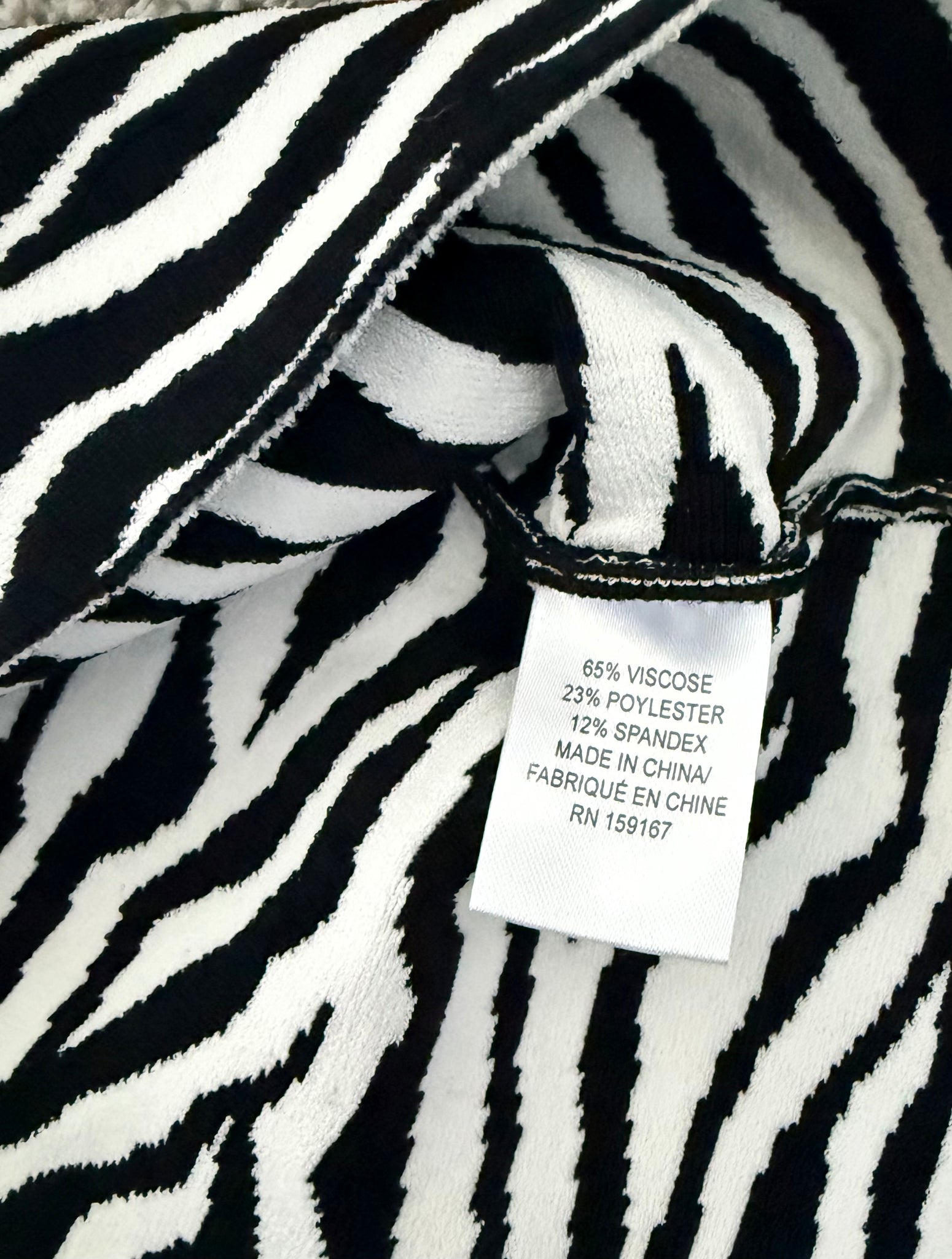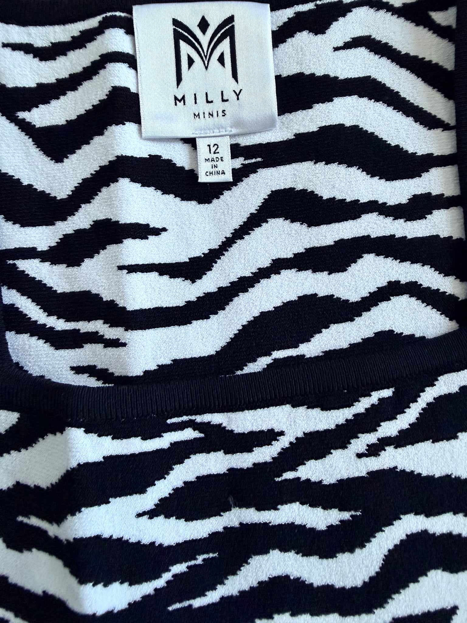 Milly Minis girls black and white zebra print heavy stretchy scuba knit square neck skater dress with black trim, size 12.