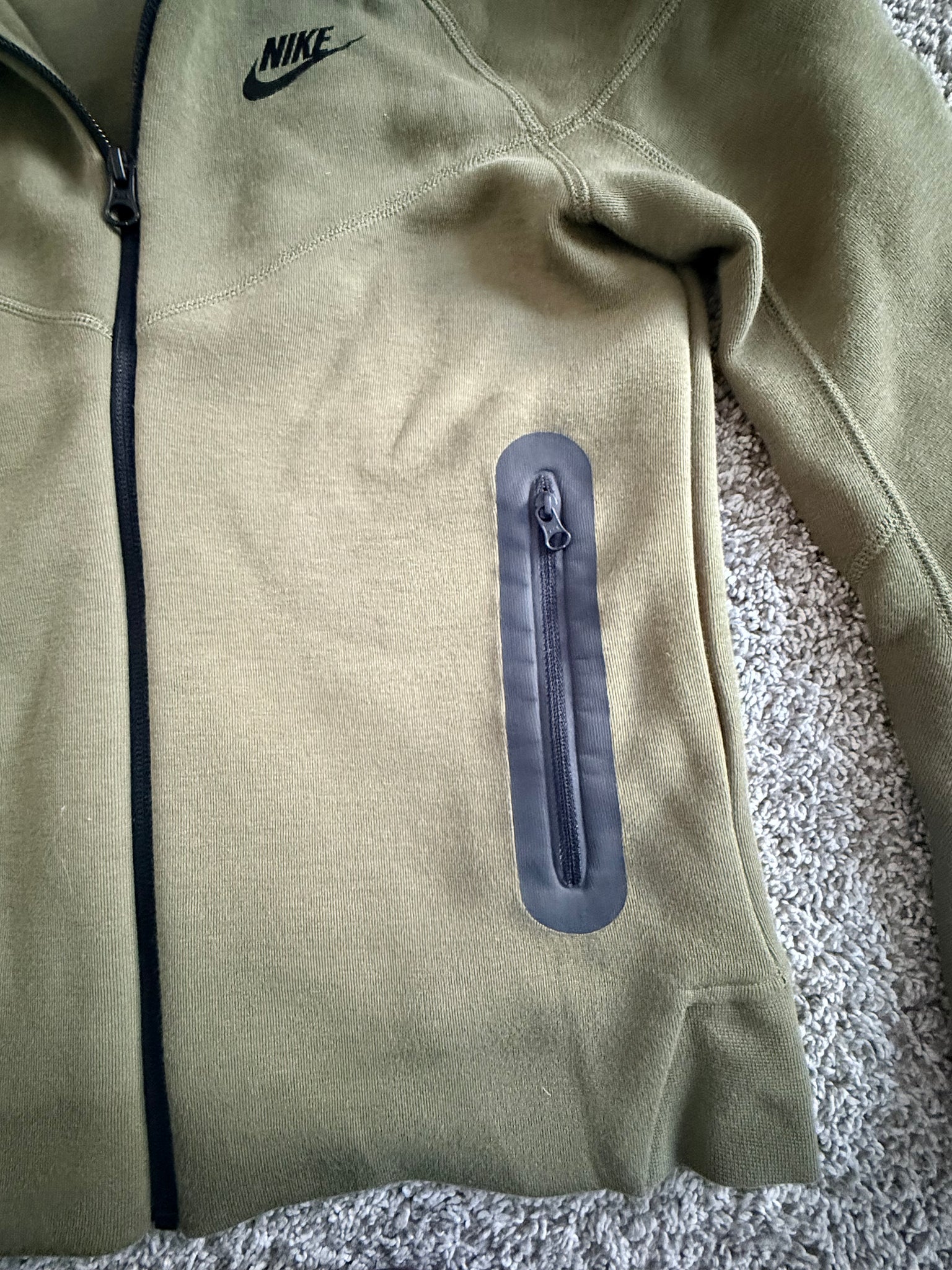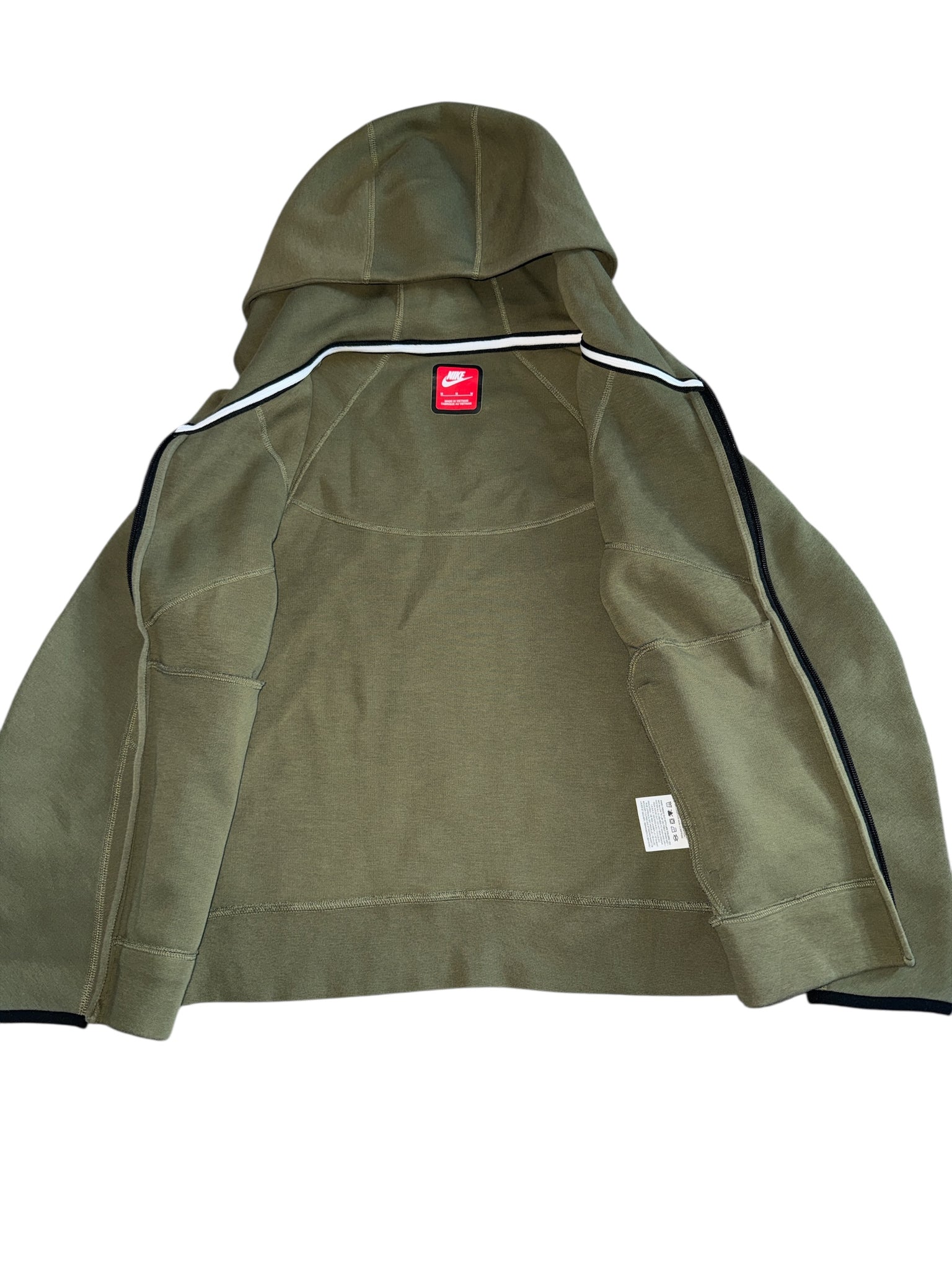 Nike boys thick tech fleece zip hoodie sweatshirt in olive green with black hardware and details, zip pockets at sides, size M(10-12).