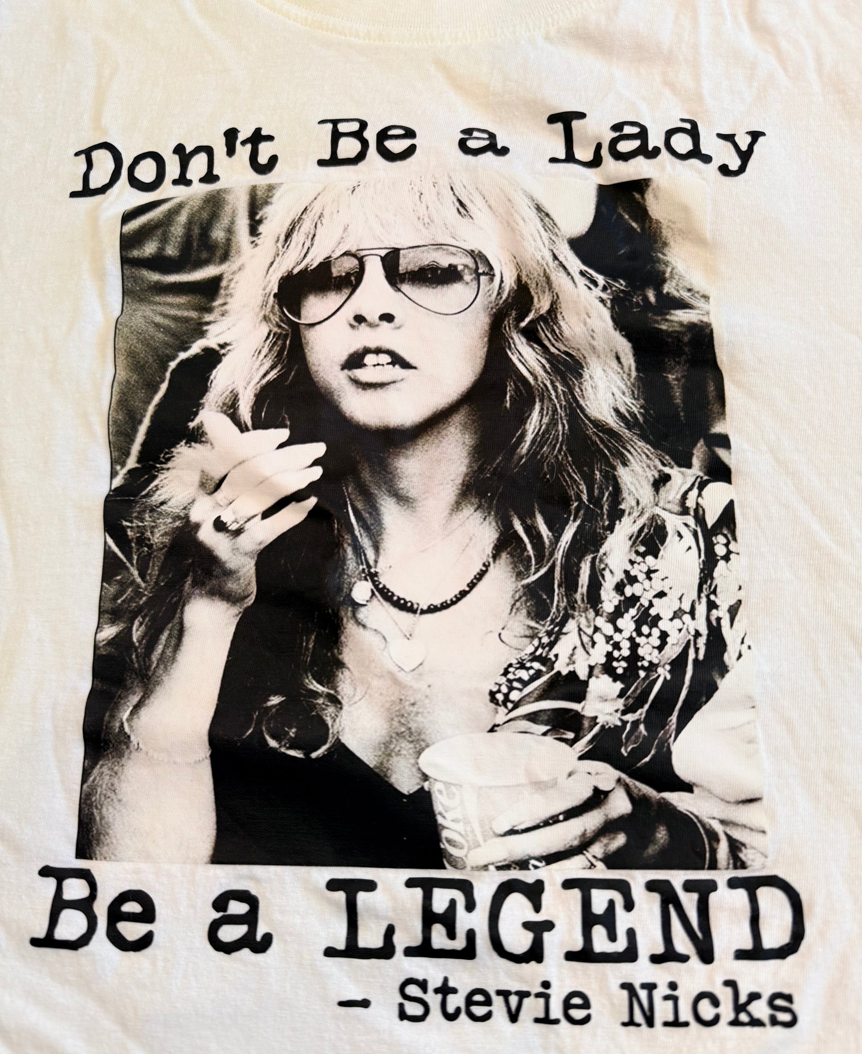 Women’s SUPER soft white crew neck tee shirt with Stevie Nicks“Don’t Be a Lady Be a Legend” graphic, size measures an adult small - read measurements below.