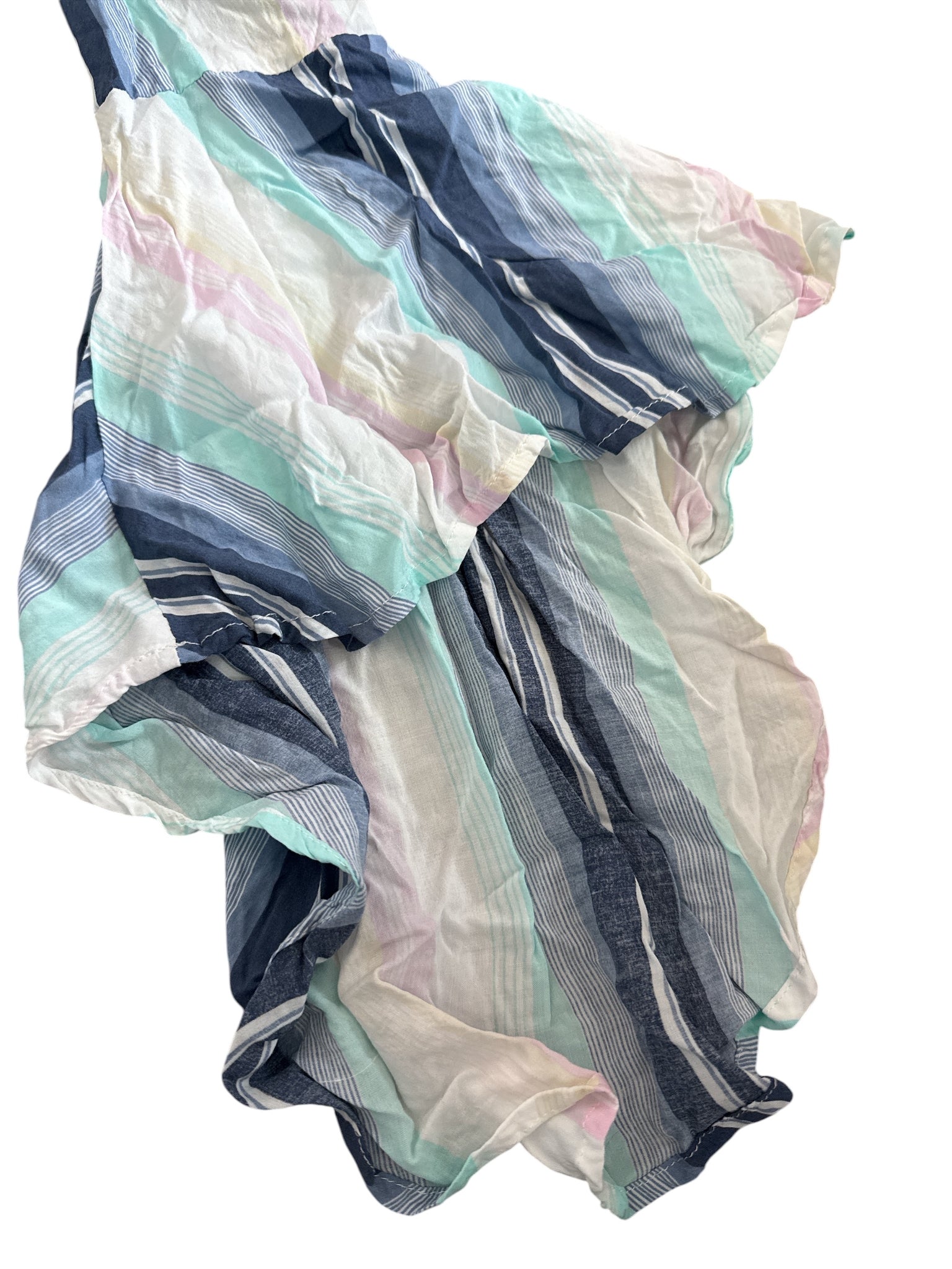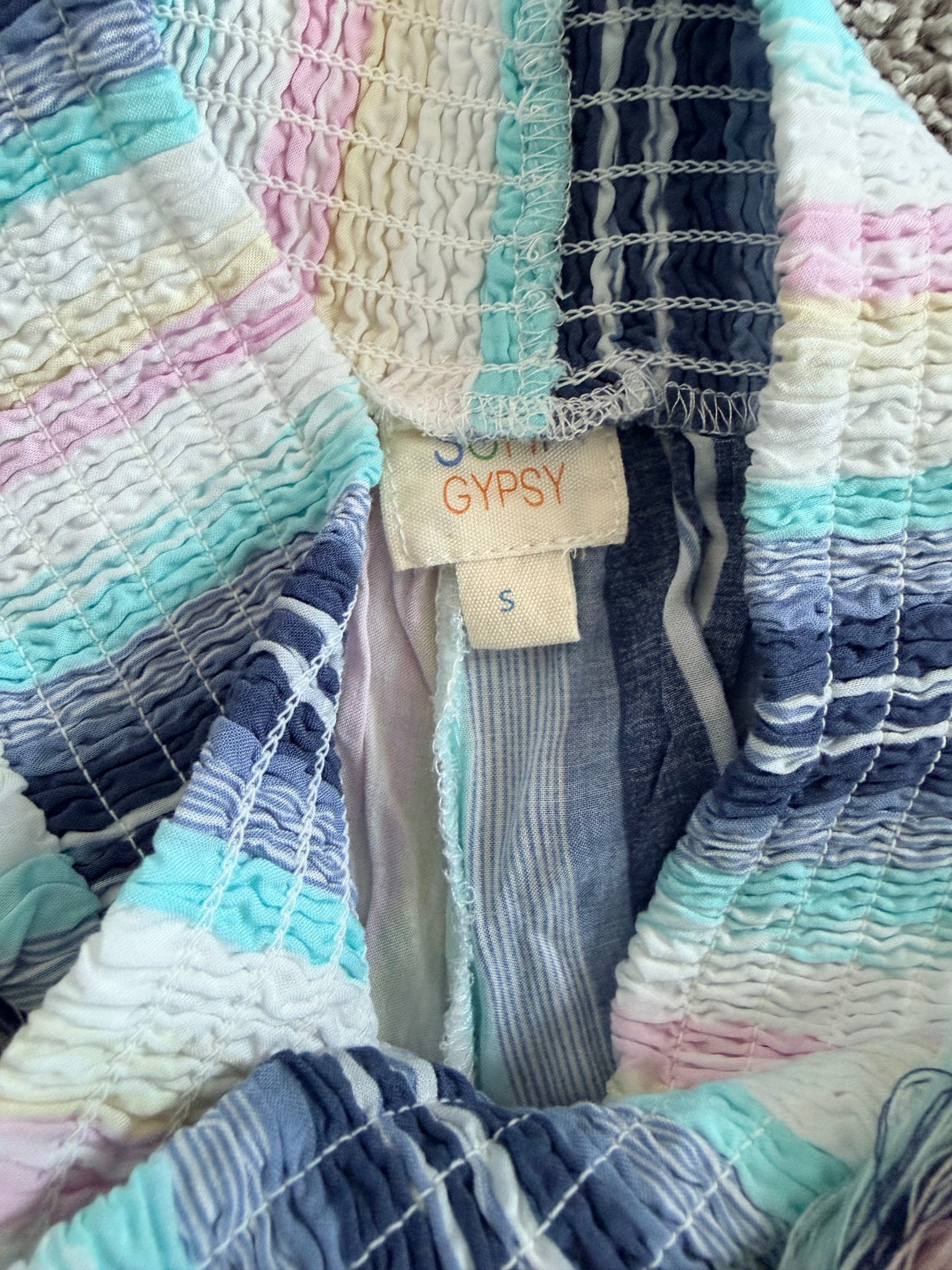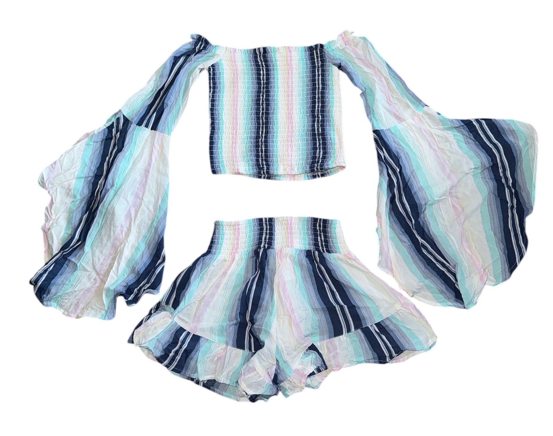 Surf Gypsy girls 2pc multicolor striped set - top is smocked off shoulder bell sleeve cropped blouse, and shorts smocked waist with tassel rope tie and ruffled hem, size S (looks about 8-10 read measurements).