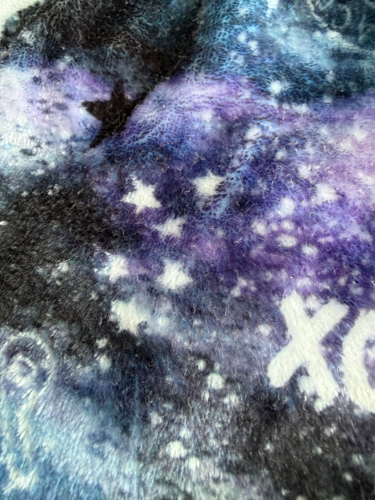 AMAZINGLY soft, plush blanket fleece shorts half black, half navy and purple galaxy tie dye with dripping happy faces, size likely 14/16 - no size tag read measurements.