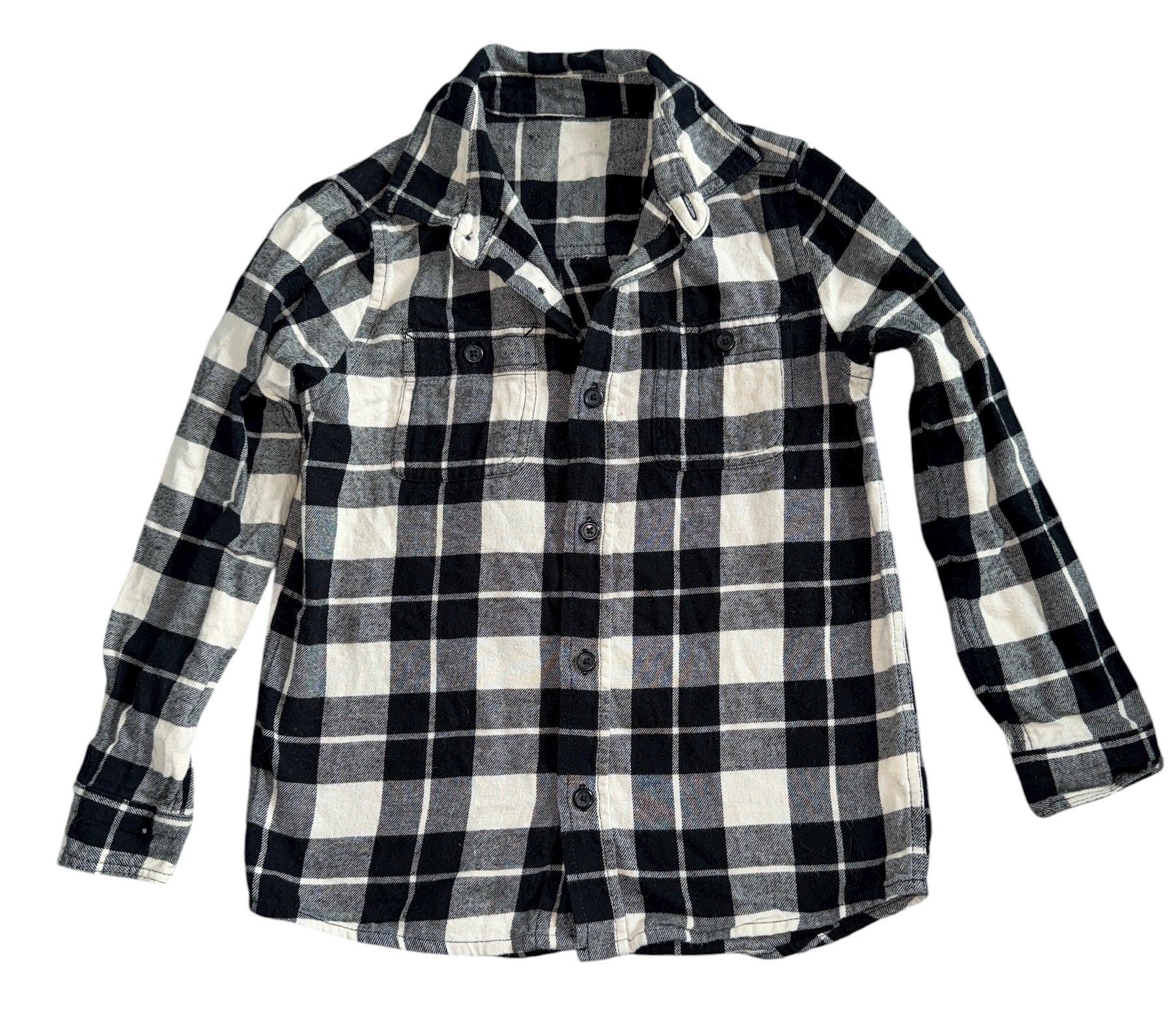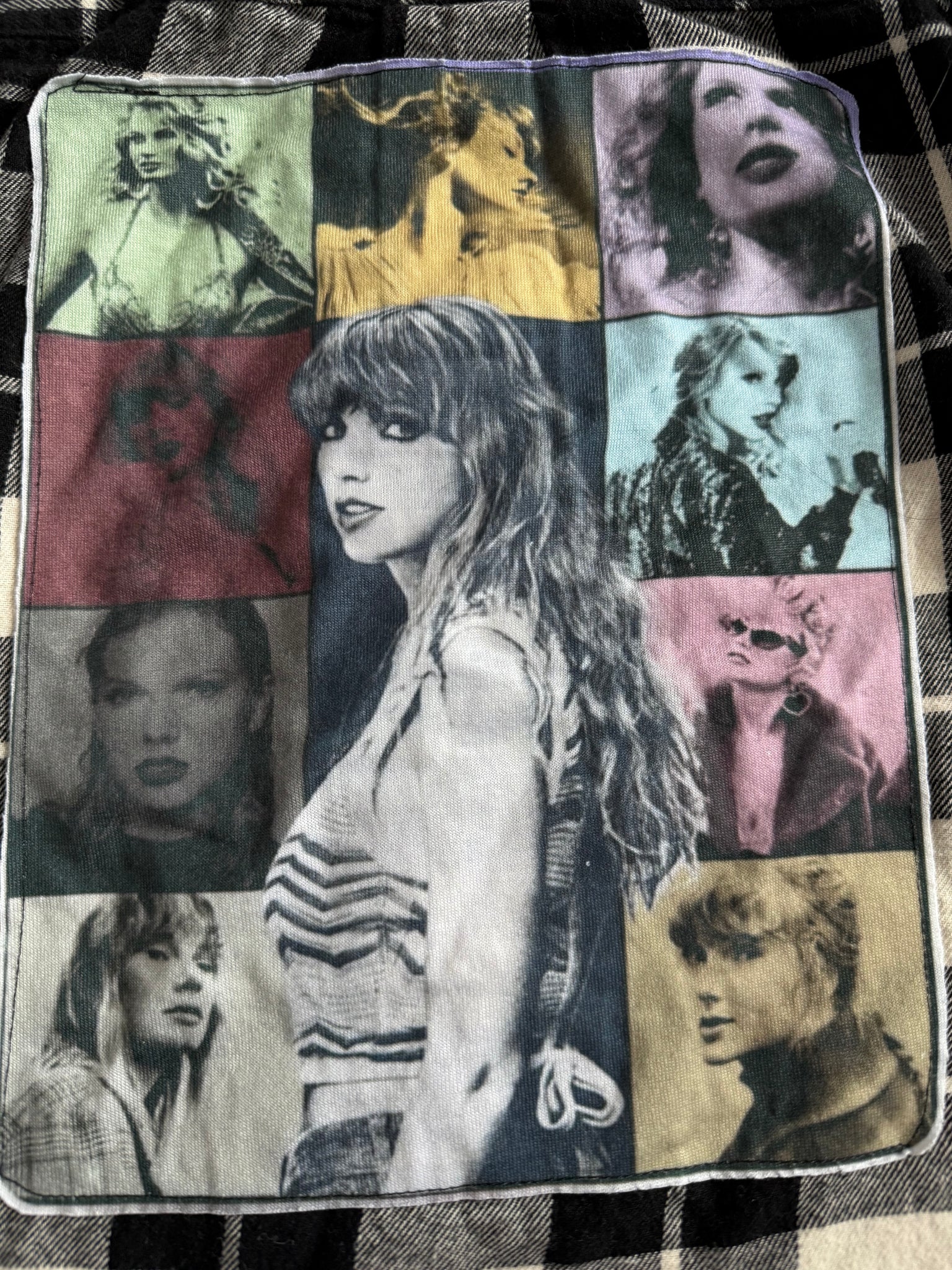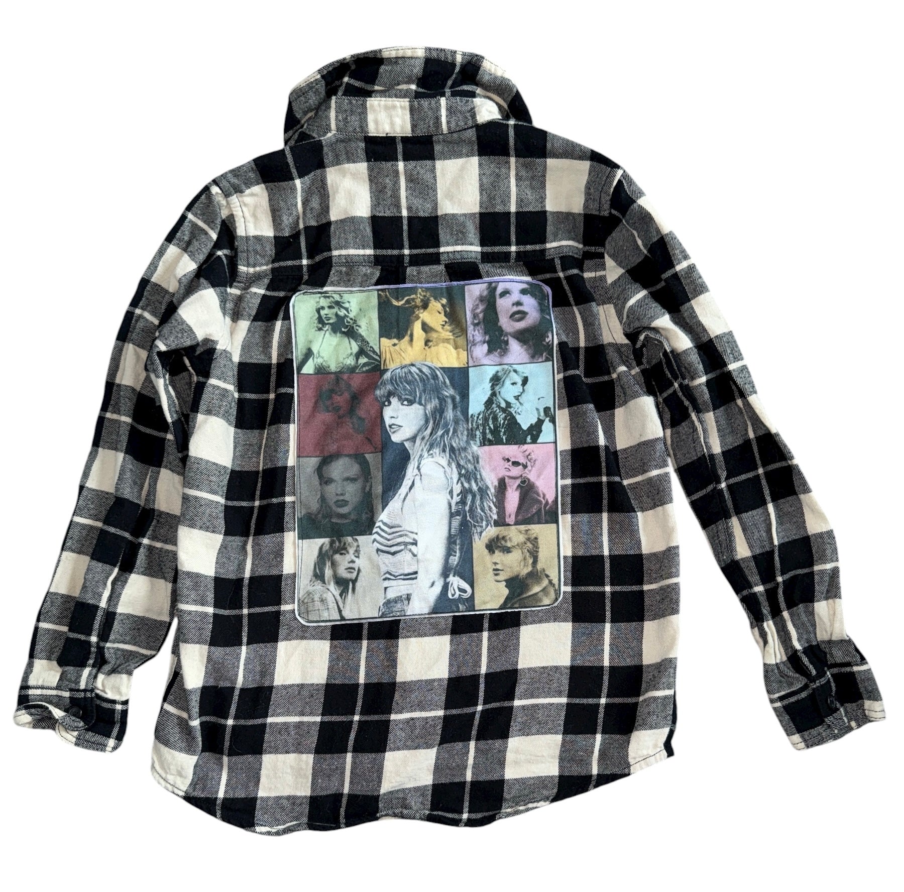 Unbranded girls super soft black and ivory plaid flannel button down shirt with colorful Taylor Swift photo collage graphic patch on back, size is removed however top measures about 7-8 (please read measurements below).