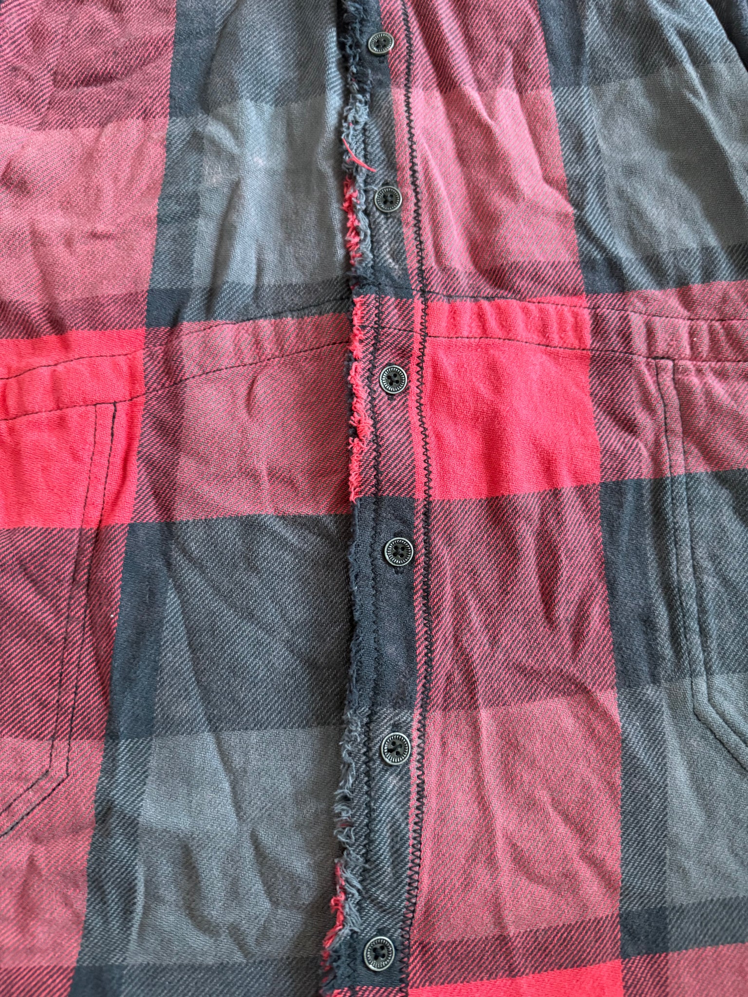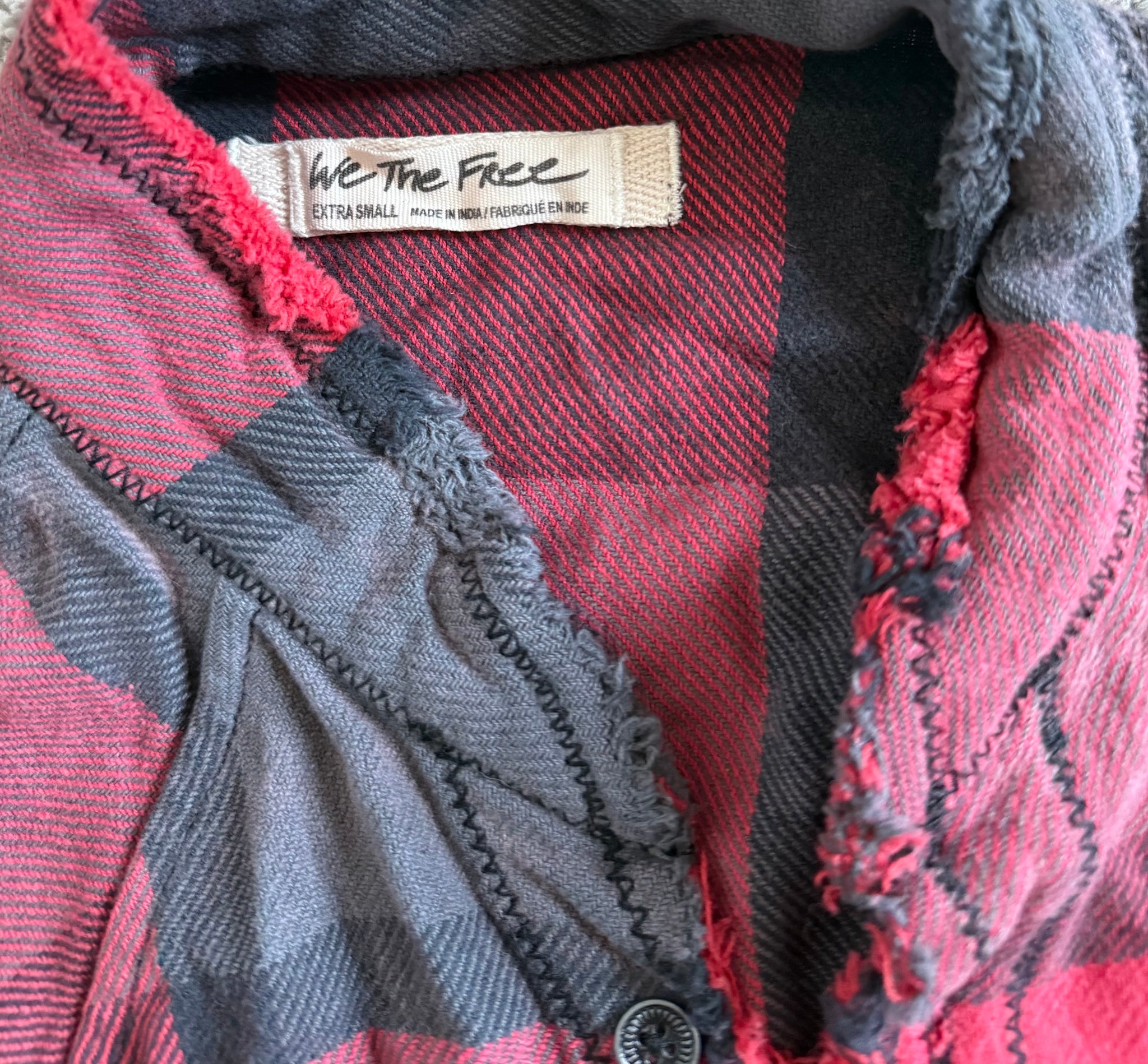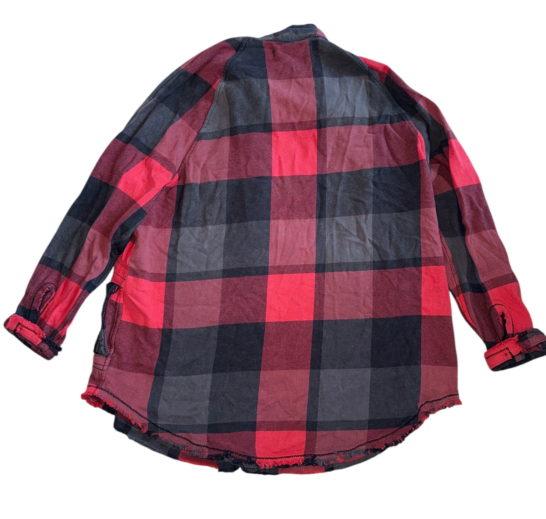 Free People x We The Free women’s Summer Daydream oversized button down flannel top in red and washed black plaid with frayed distressed edges and large front pockets, size XS.