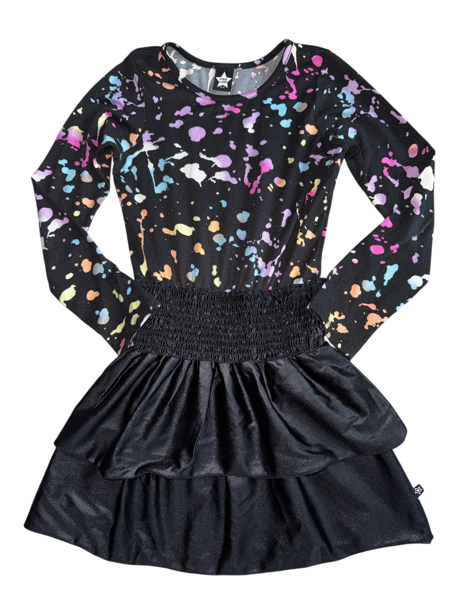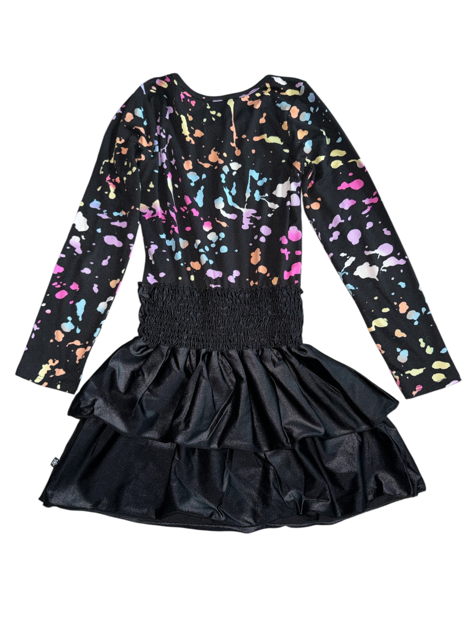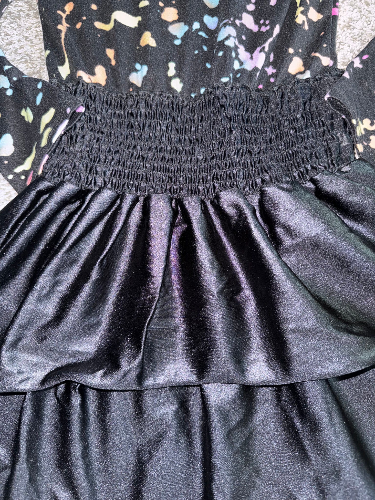 Pixie Lane girls long sleeve black dress with simply soft bodice, hi shine black ruffle skirt and colorful splatter graphic size 9-10.
