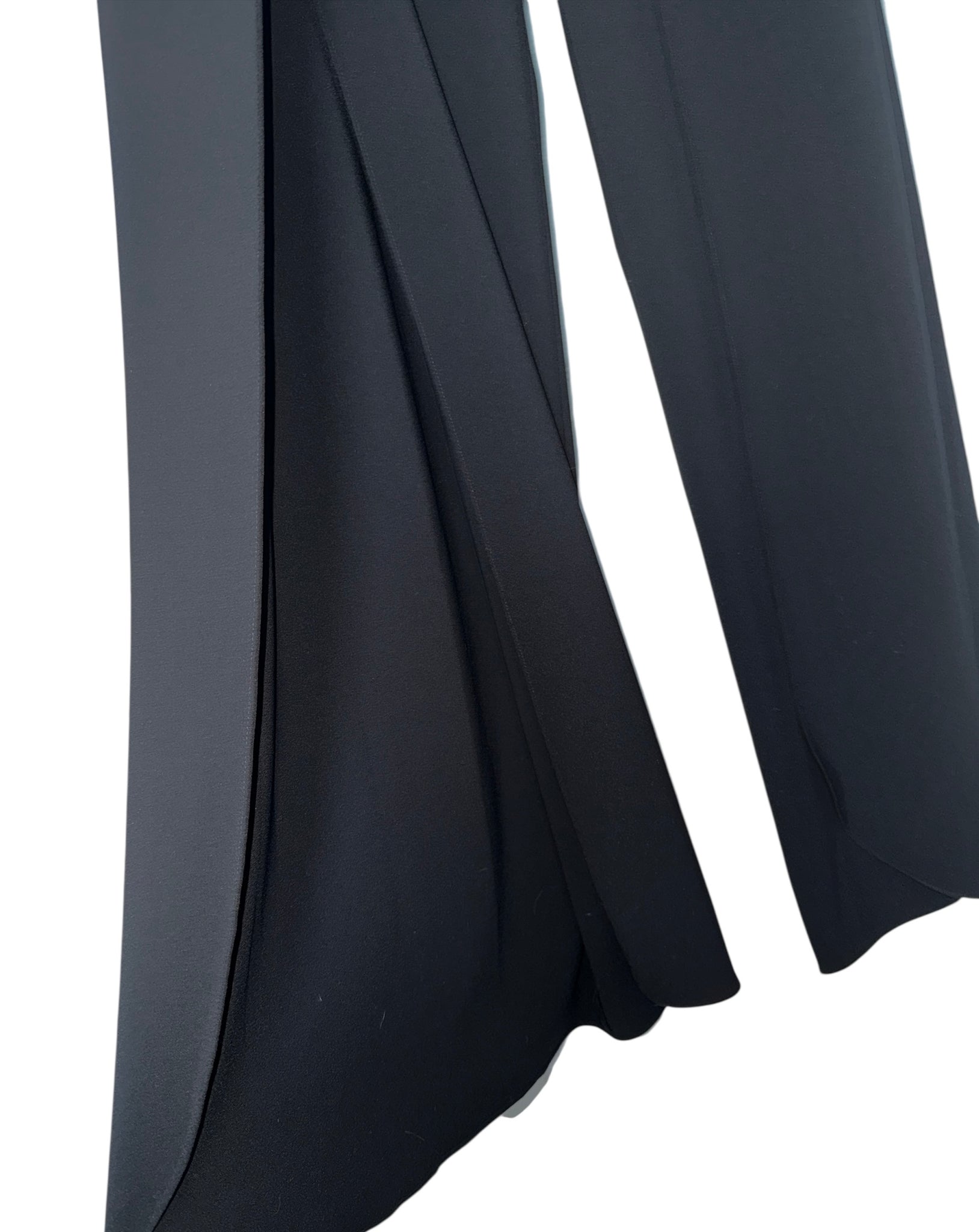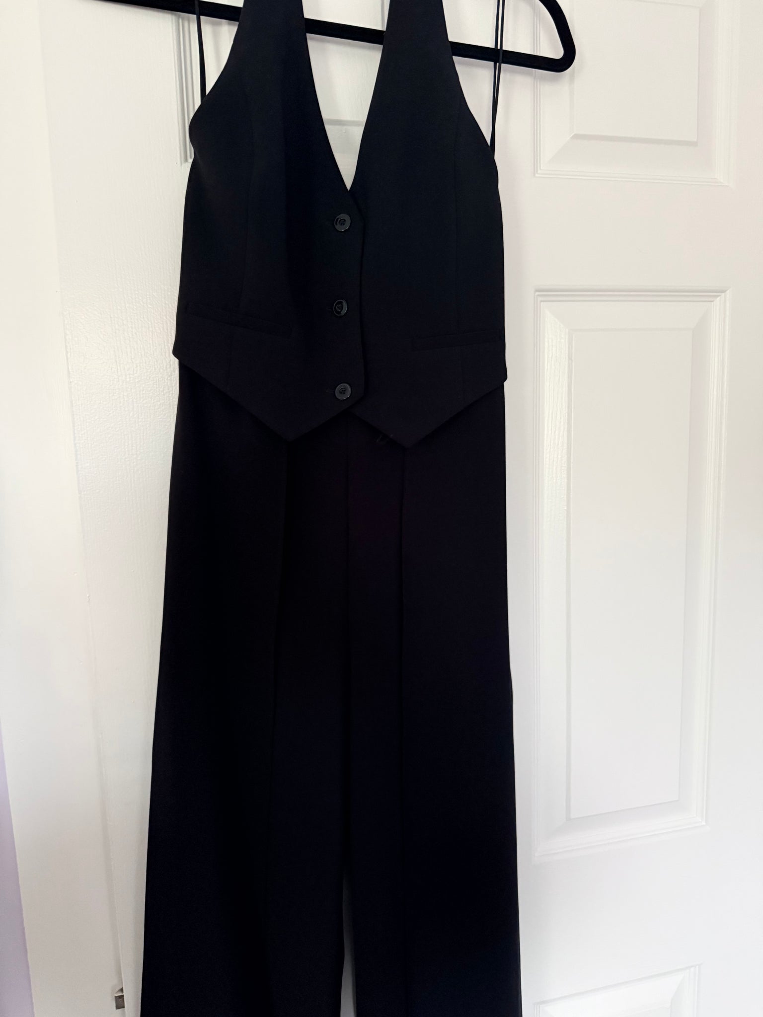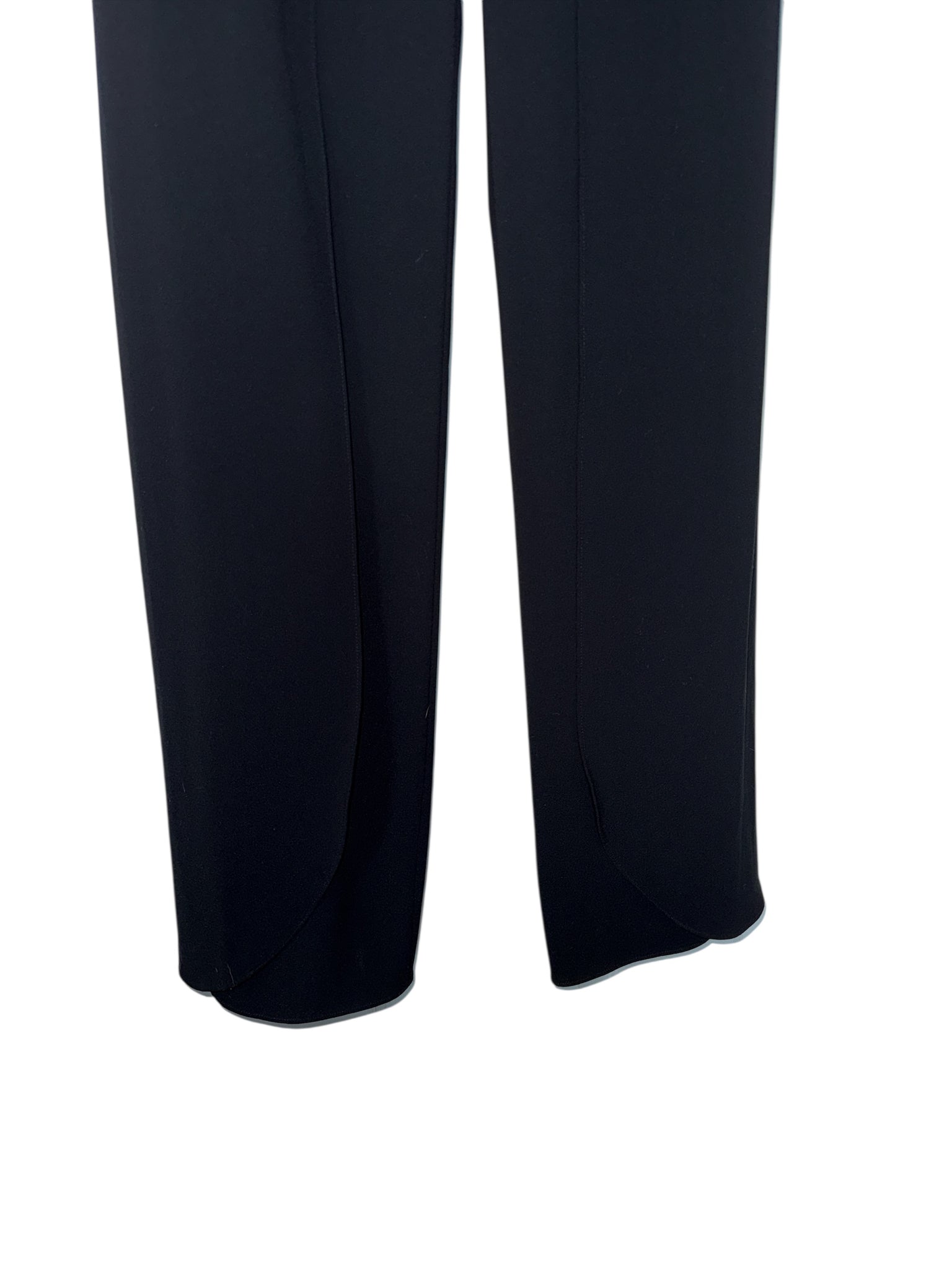 Alice + Olivia women’s black Robin tuxedo style halter jumpsuit with zipper/hook & eye closure, smocked elastic in back, wide legs with slits going all the way up. Size 0.