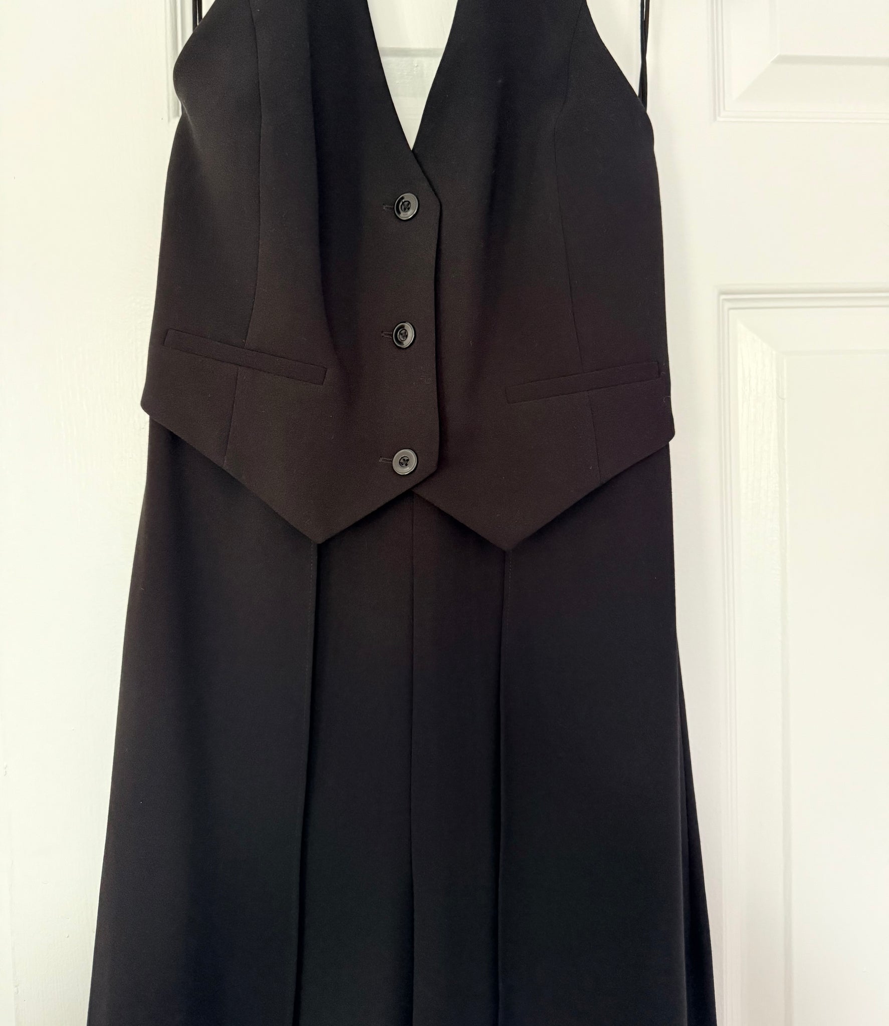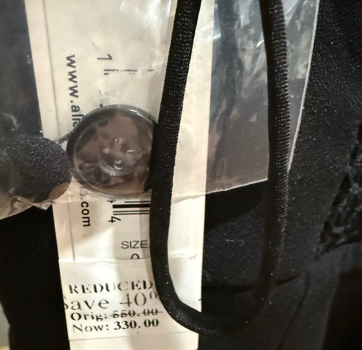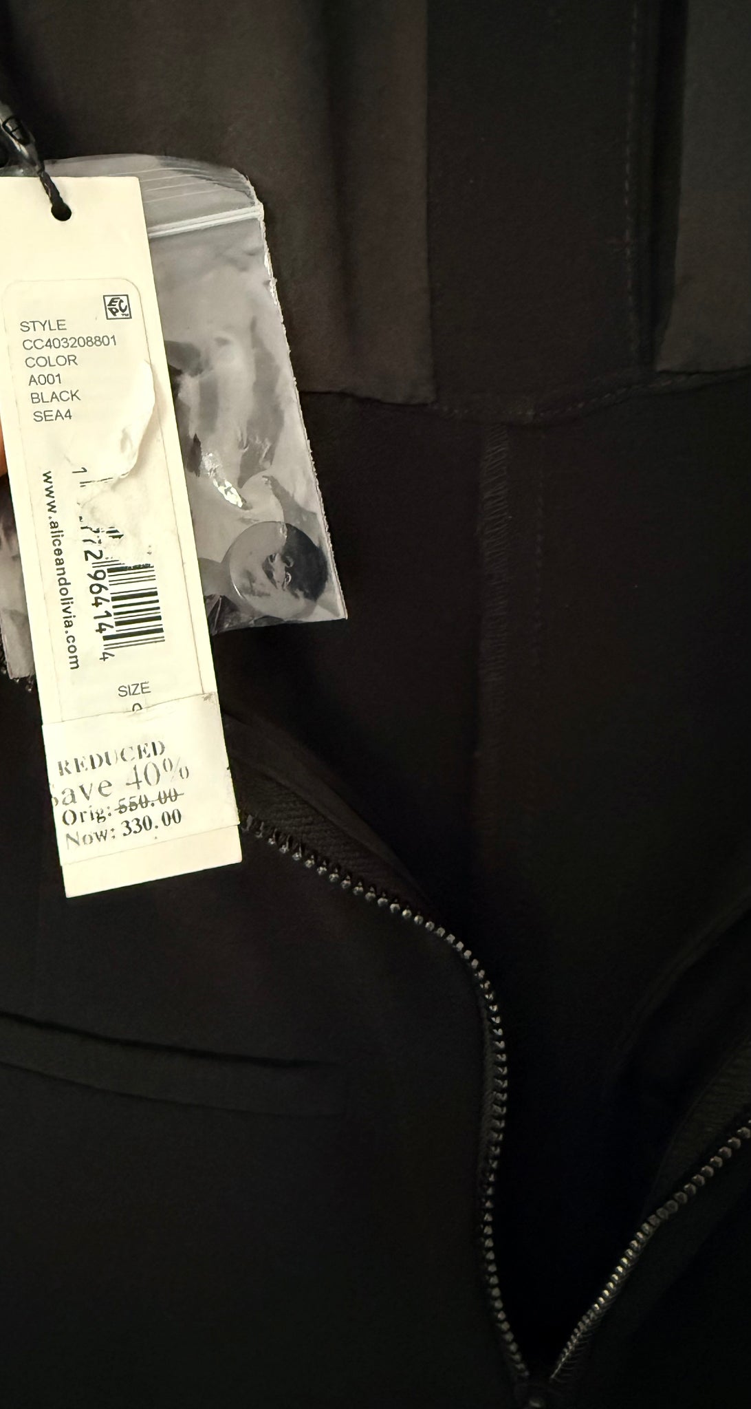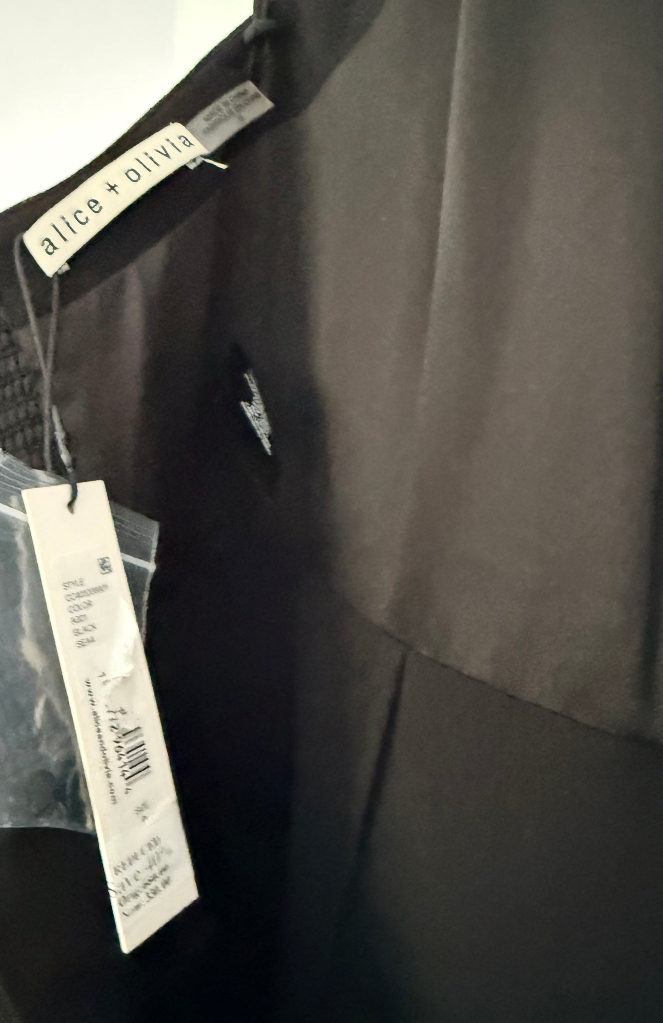 Alice + Olivia women’s black Robin tuxedo style halter jumpsuit with zipper/hook & eye closure, smocked elastic in back, wide legs with slits going all the way up. Size 0.