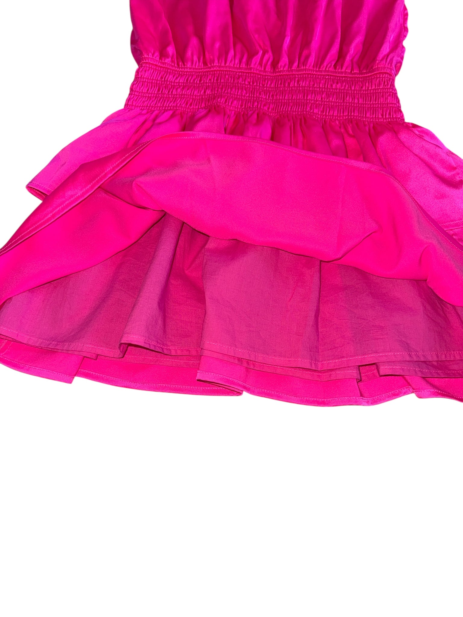 Katie J NYC juniors hot pink satin Becca dress with tiered skirt, smocked waist, and keyhole neckline with tie straps, size S.