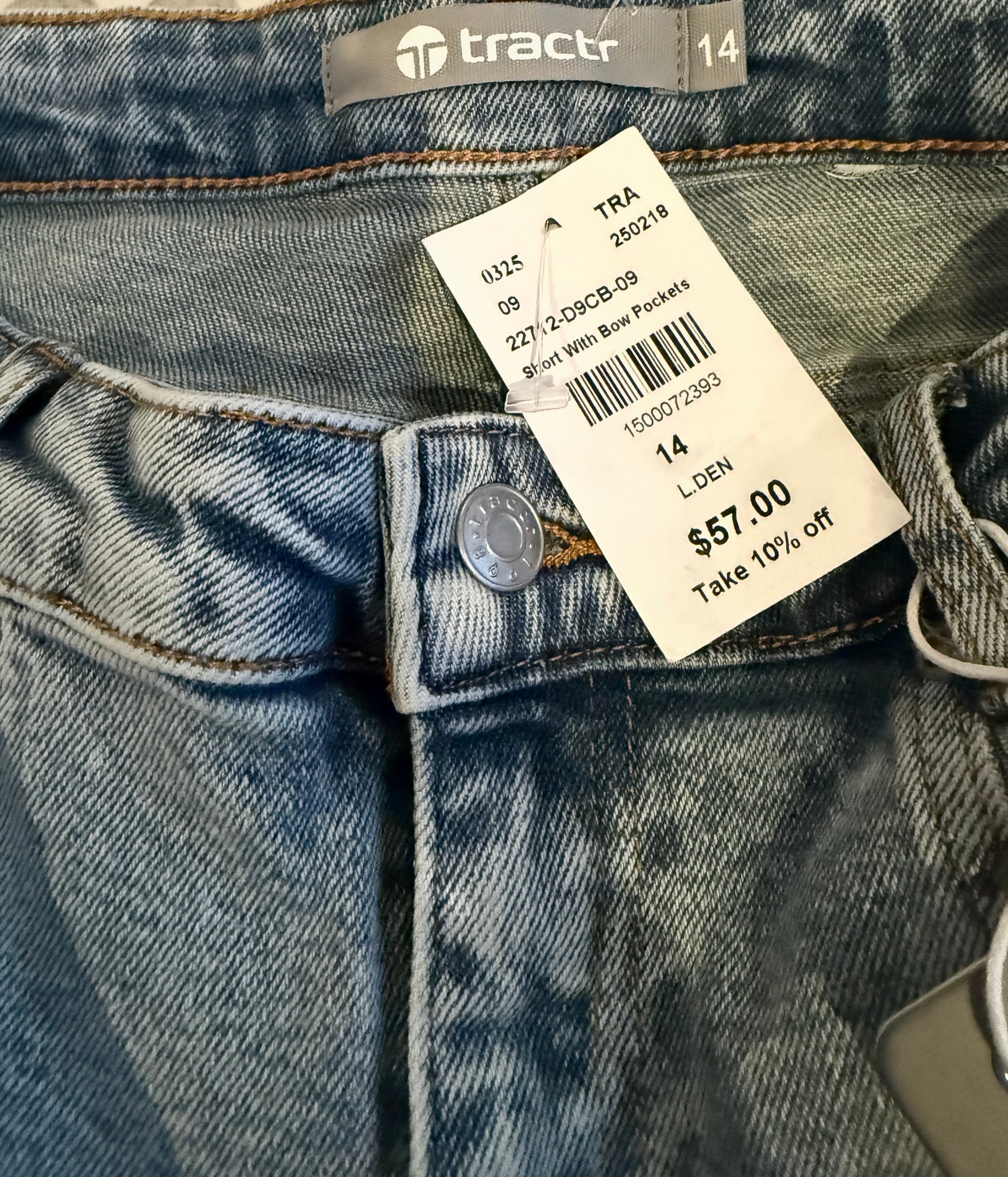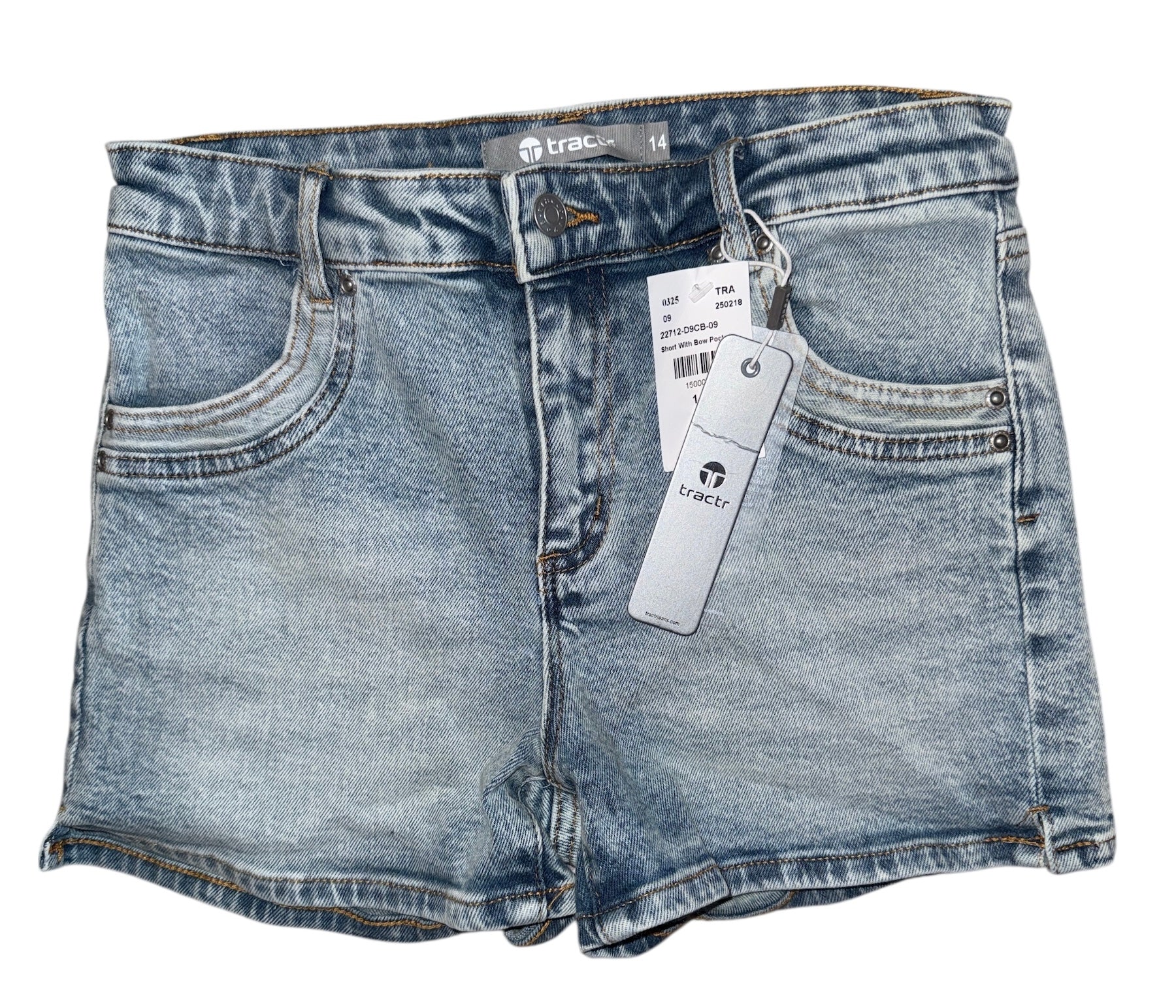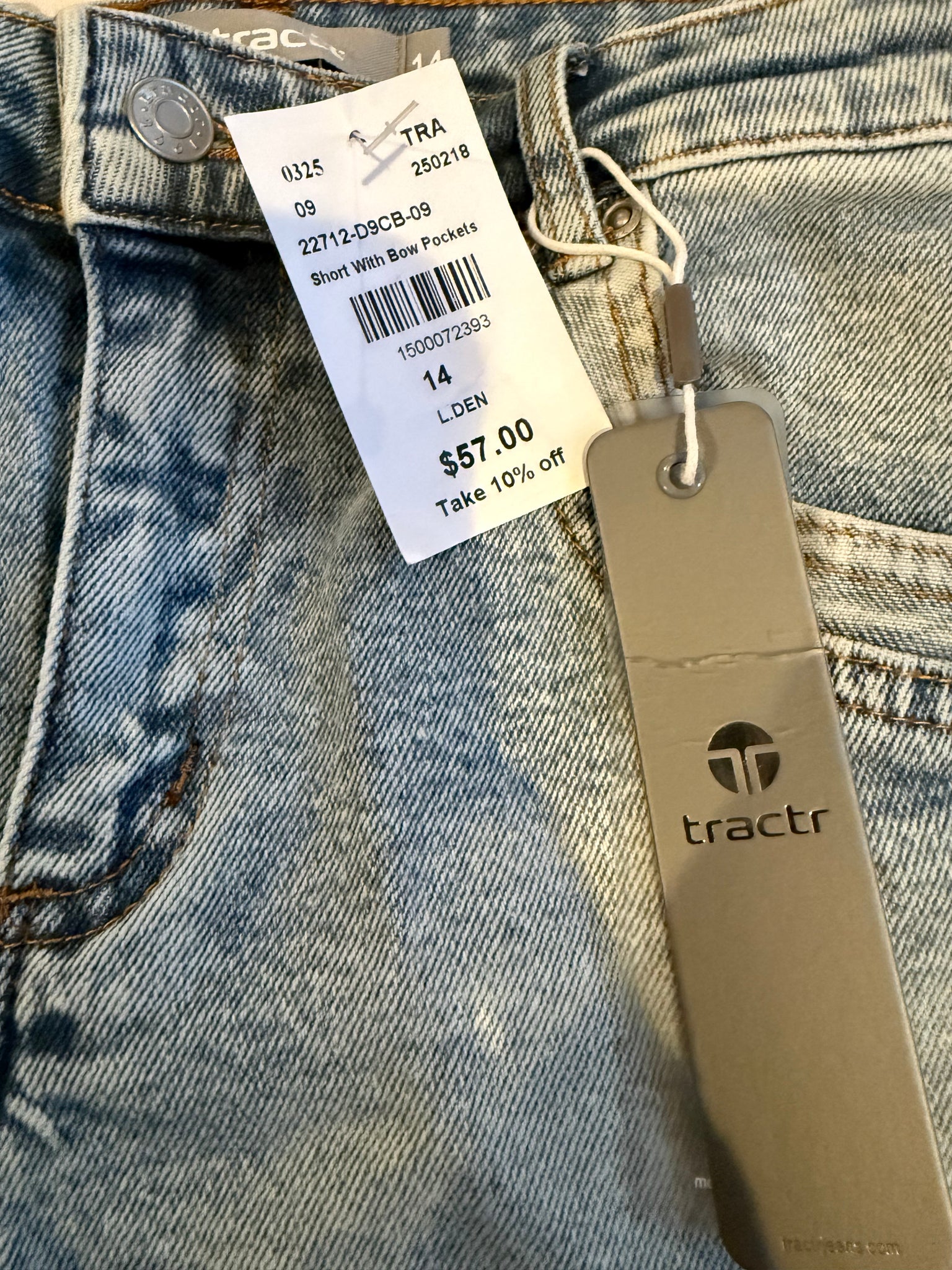 Tractr girls light denim jean shorts with little slits in hems and bows on back pockets, size 14.