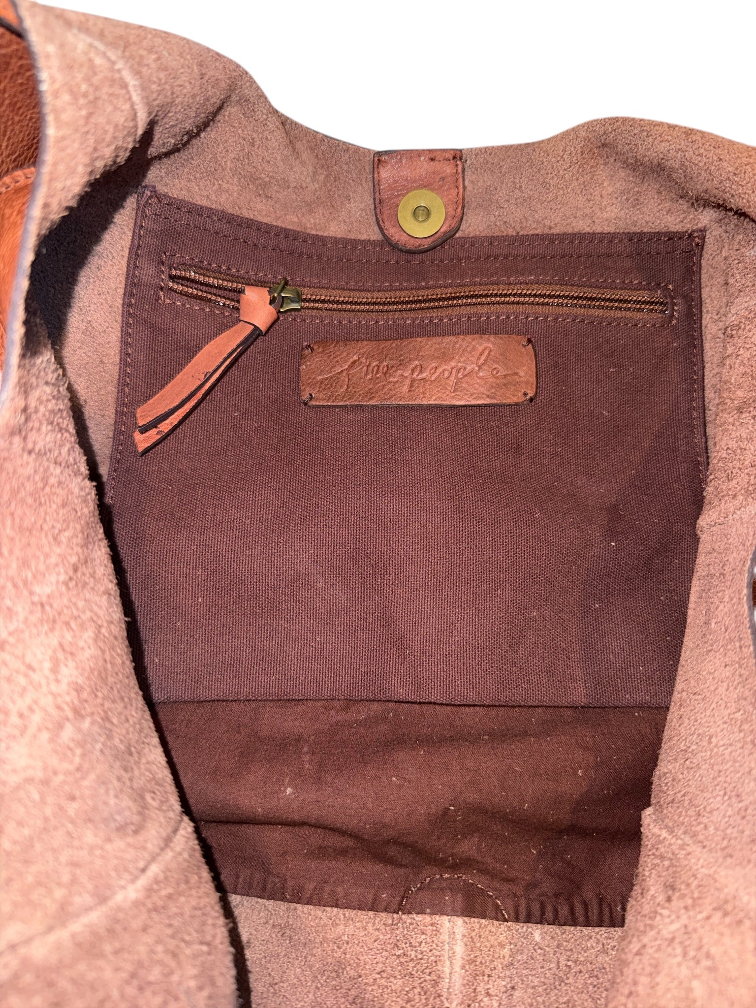 Free People cognac Tuscan leather tote bag with shoulder strap and suede front compartment, 19”W x 11.5” H x 5” D.