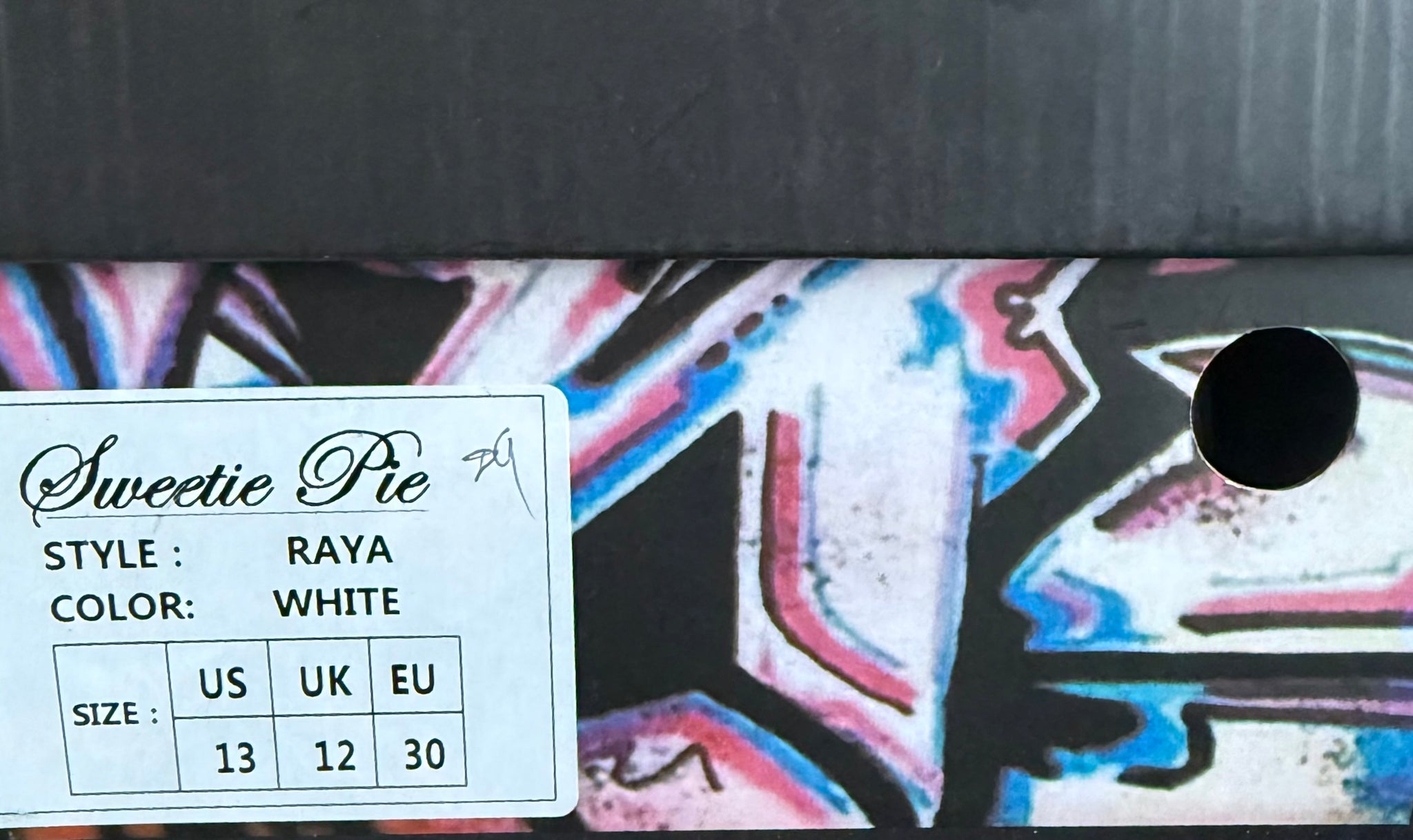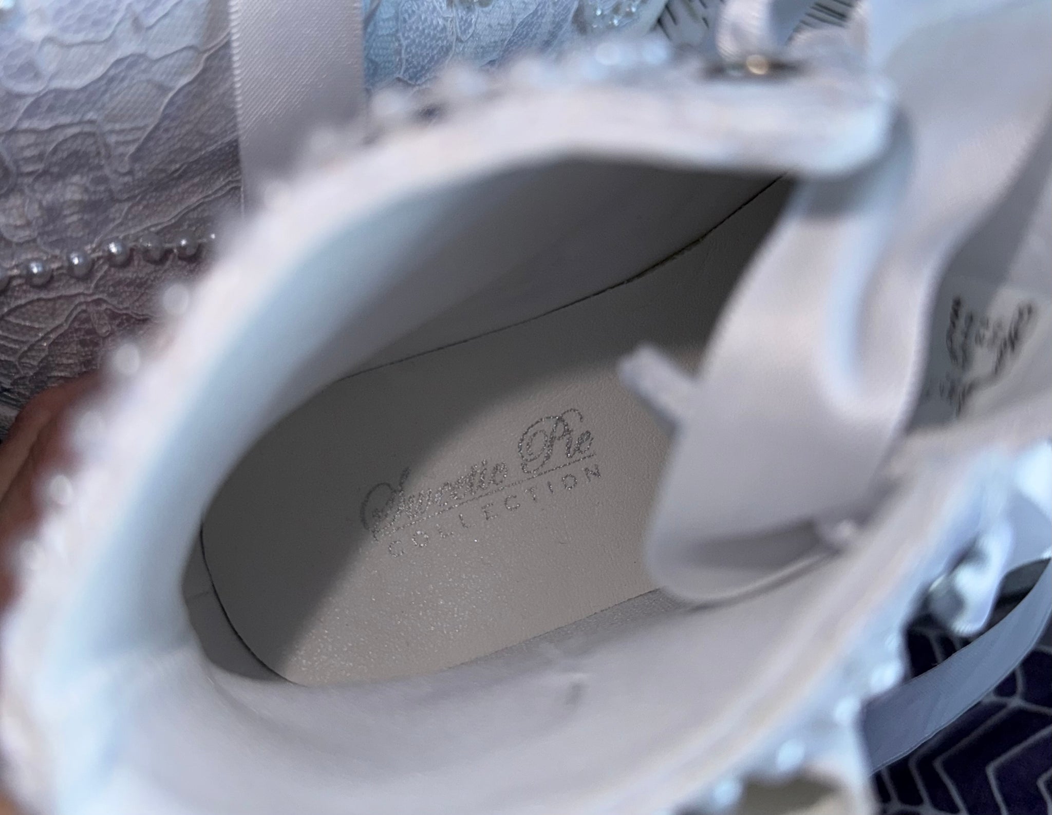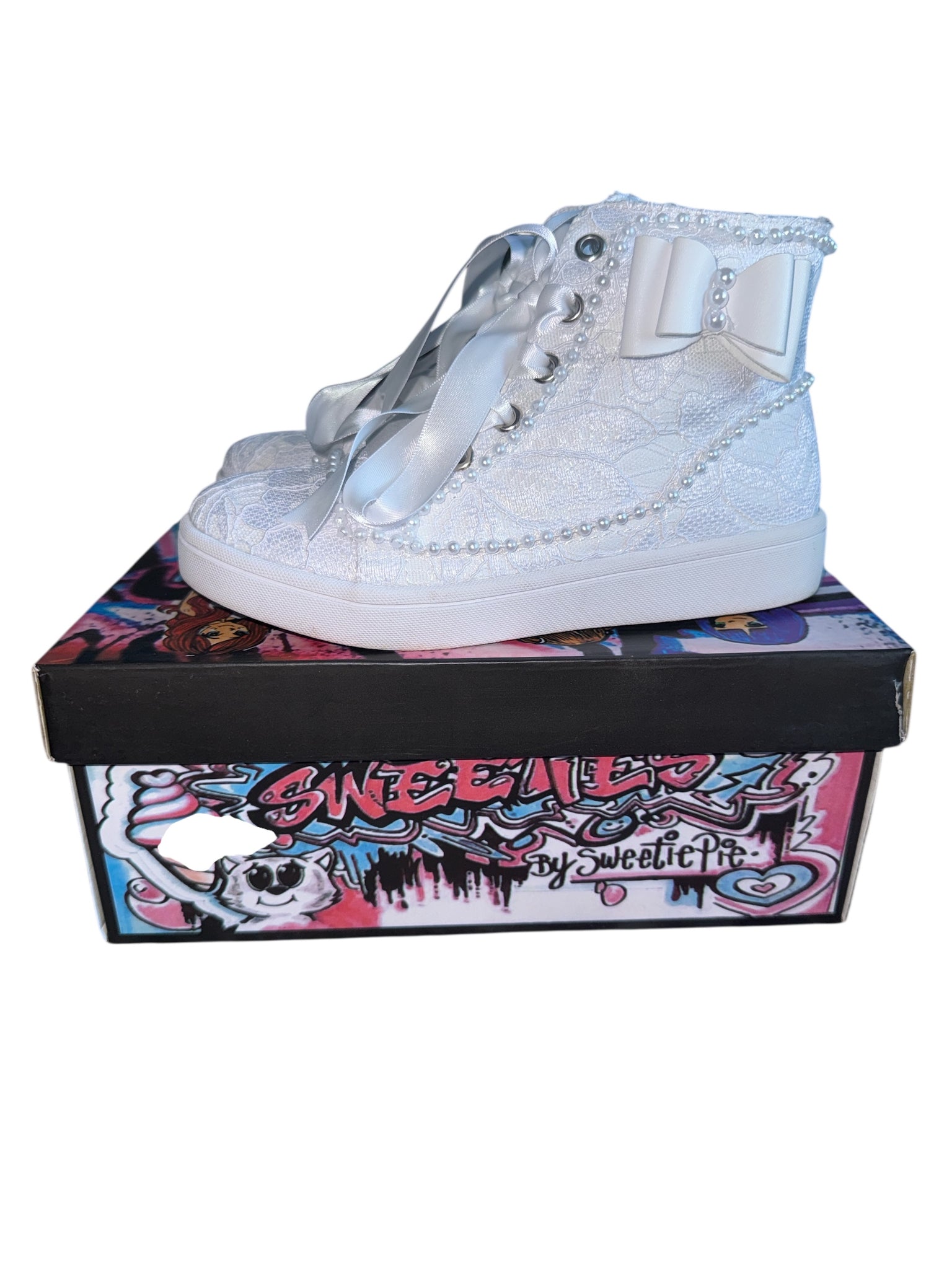 Sweetie Pie Collection girls beautiful white Raya hi top special occasion sneakers embellished with pearl beading, floral lace, bows, and ribbon laces, size 13.