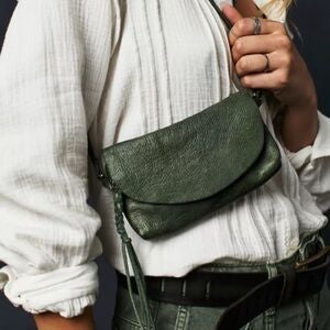 We The Free by Free People green leather mini Rider crossbody bag with adjustable strap (studs and holes), flap and zip compartment perfect for the essentials.