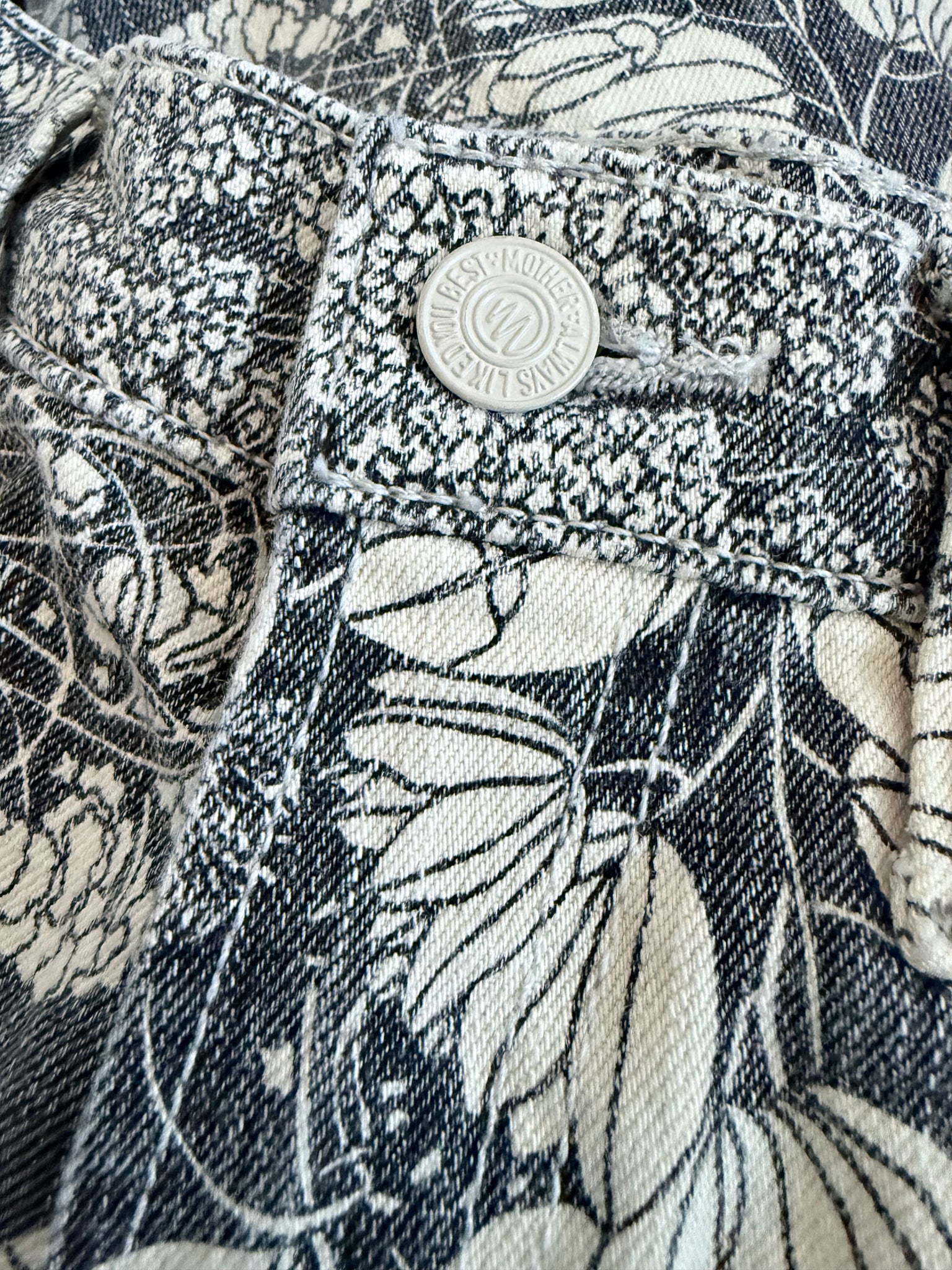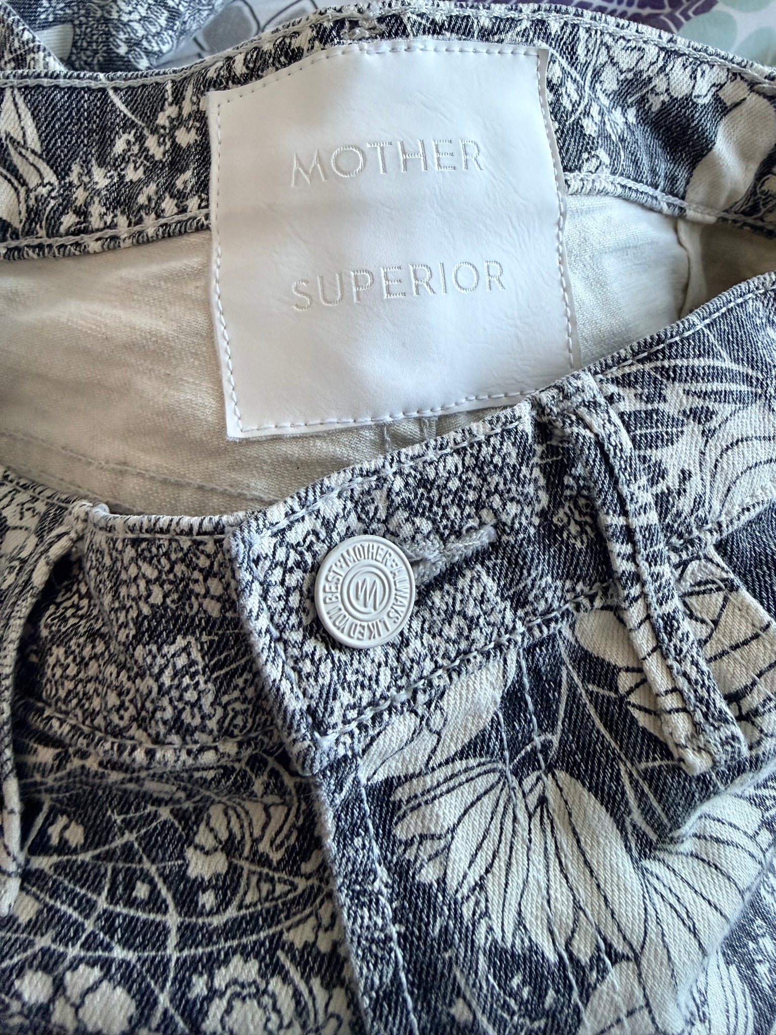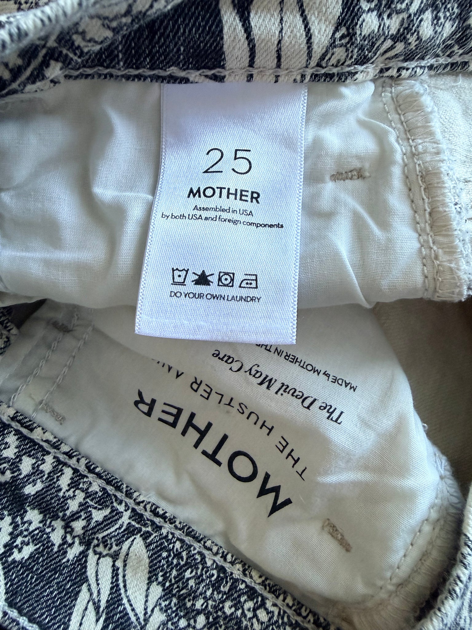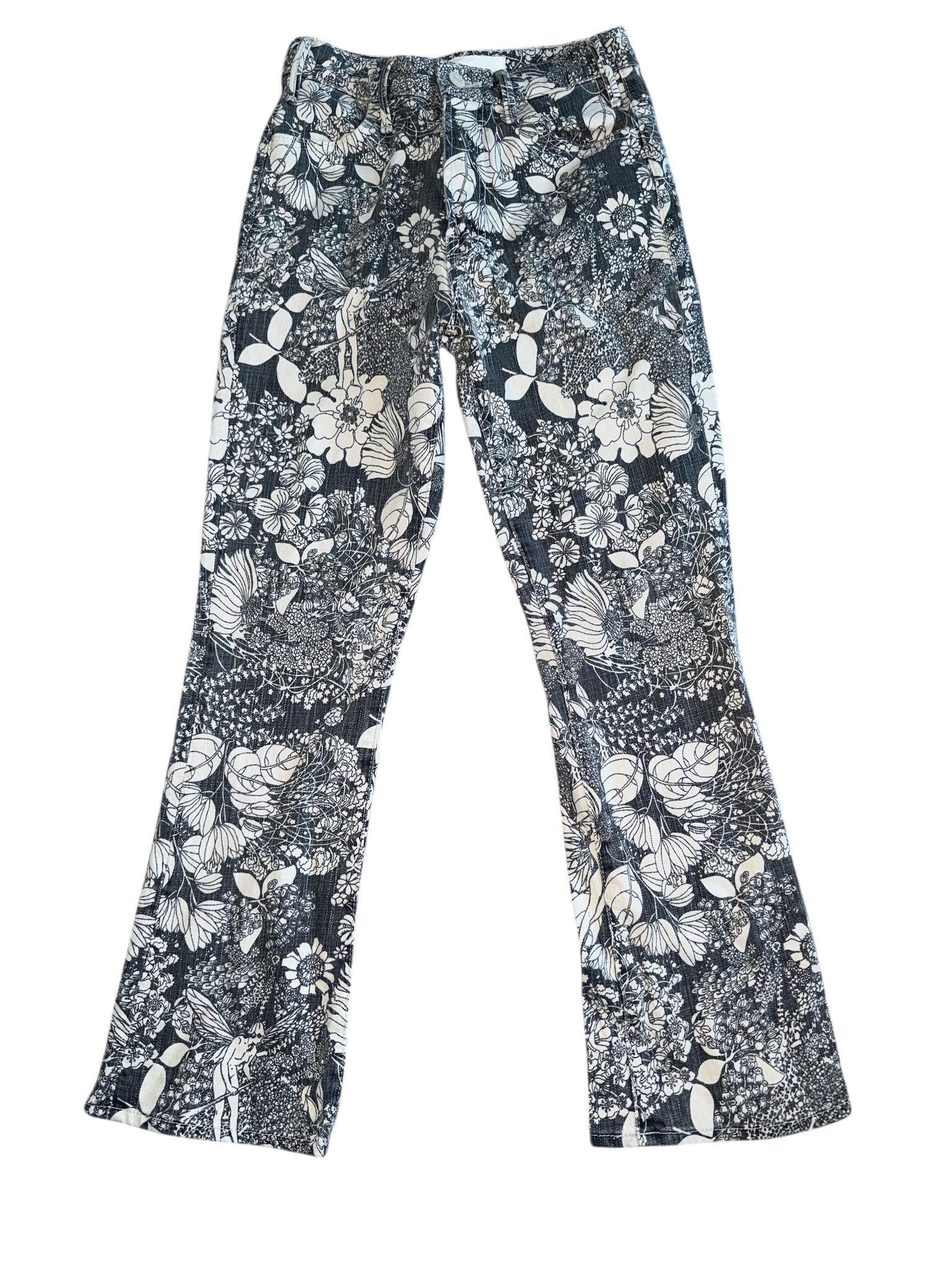 Mother Superior women’s Hustler cropped ankle flare jeans in ivory/gray(The Devil May Care wash) French Fairytale floral print, size 25.