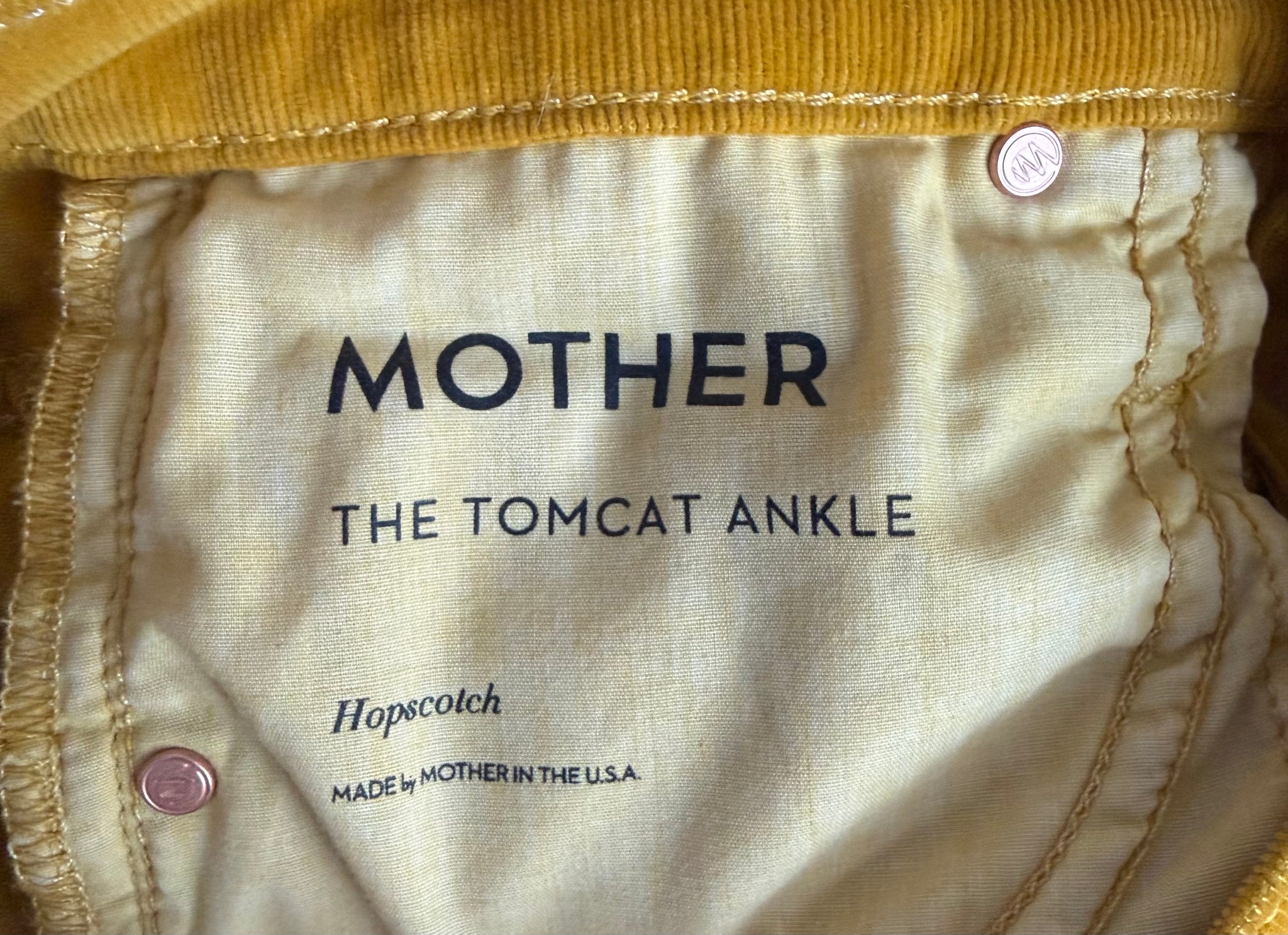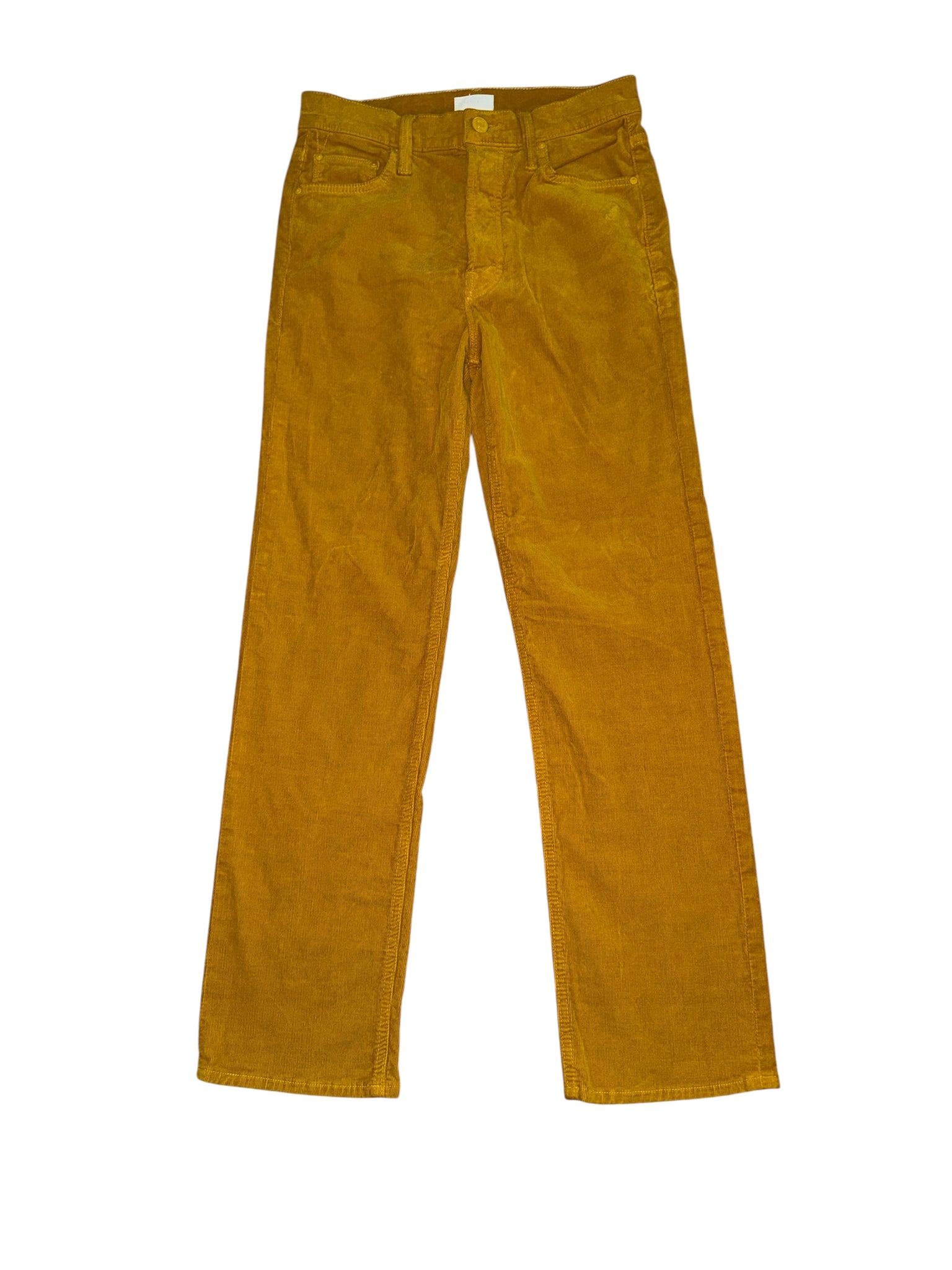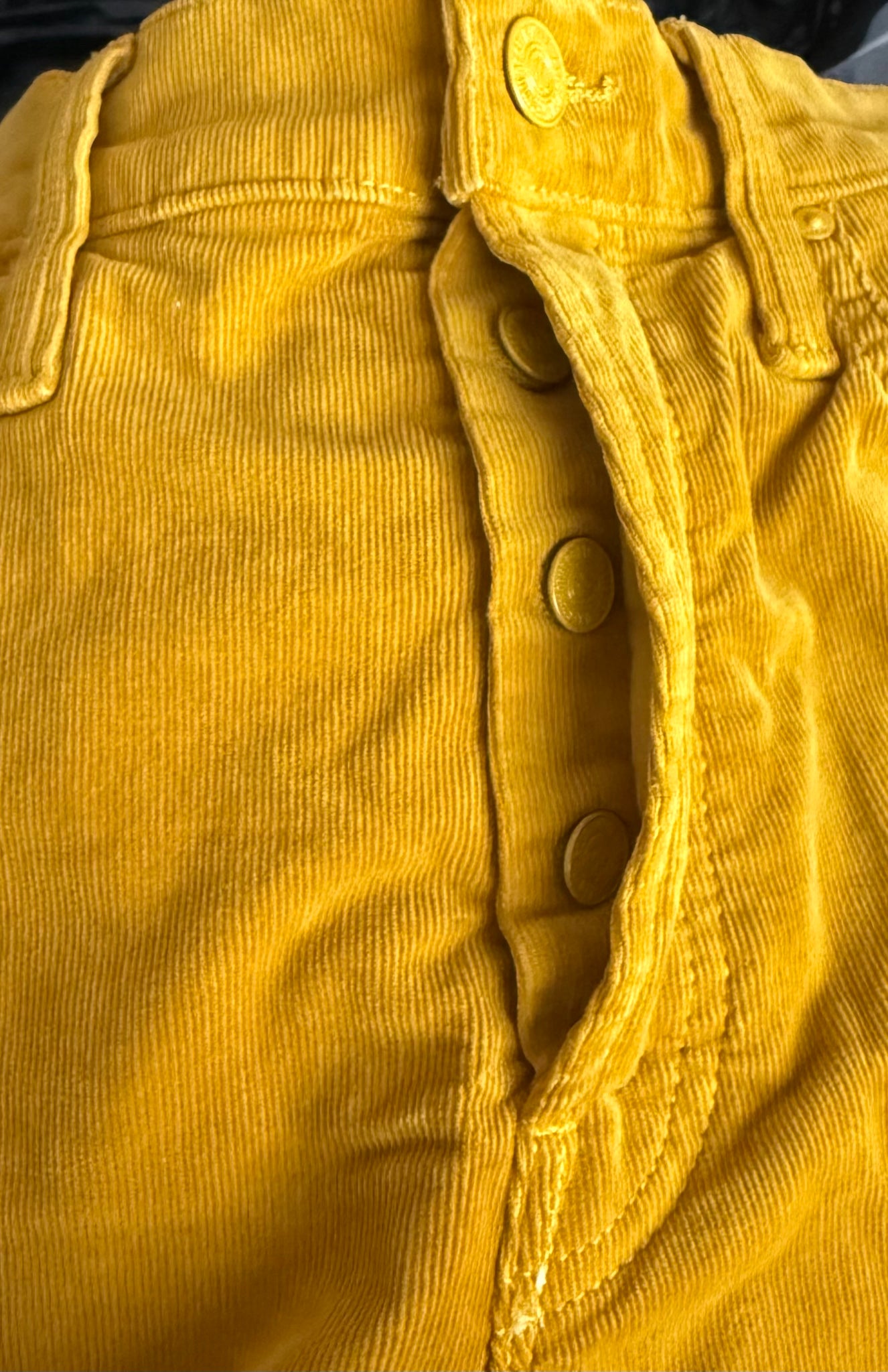 Mother women’s The Tomcat high rise button-fly straight leg ankle length stretch corduroys in Hopscotch (mustard), size 25.