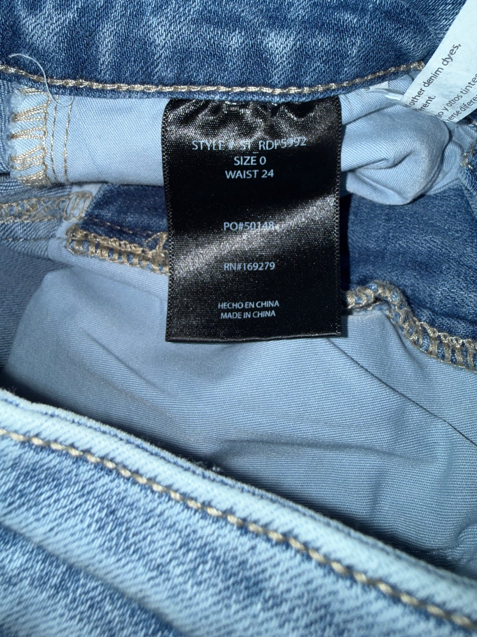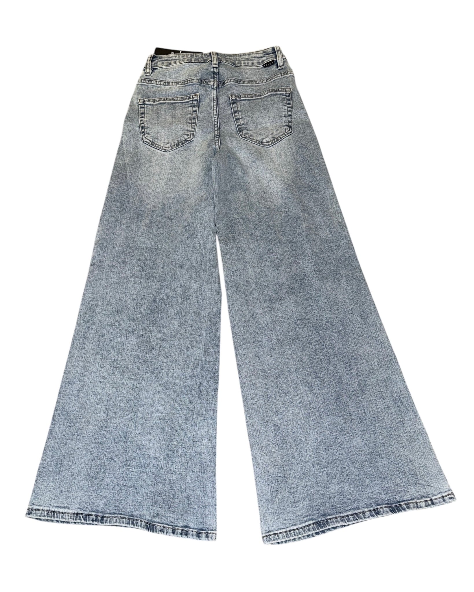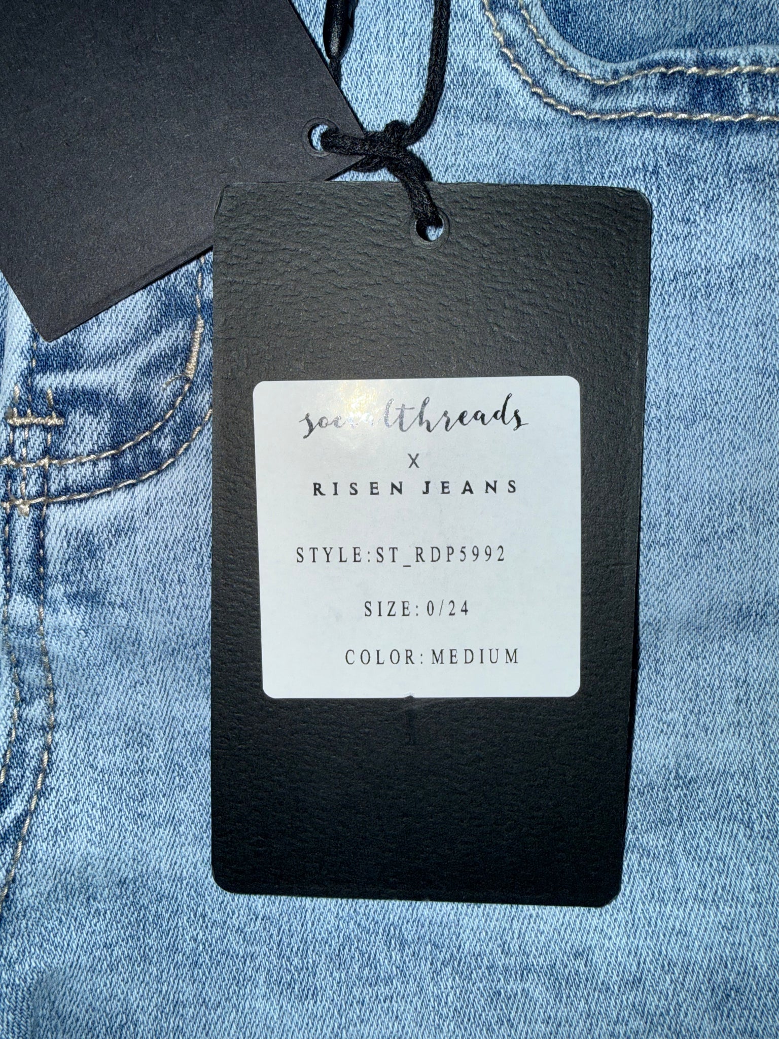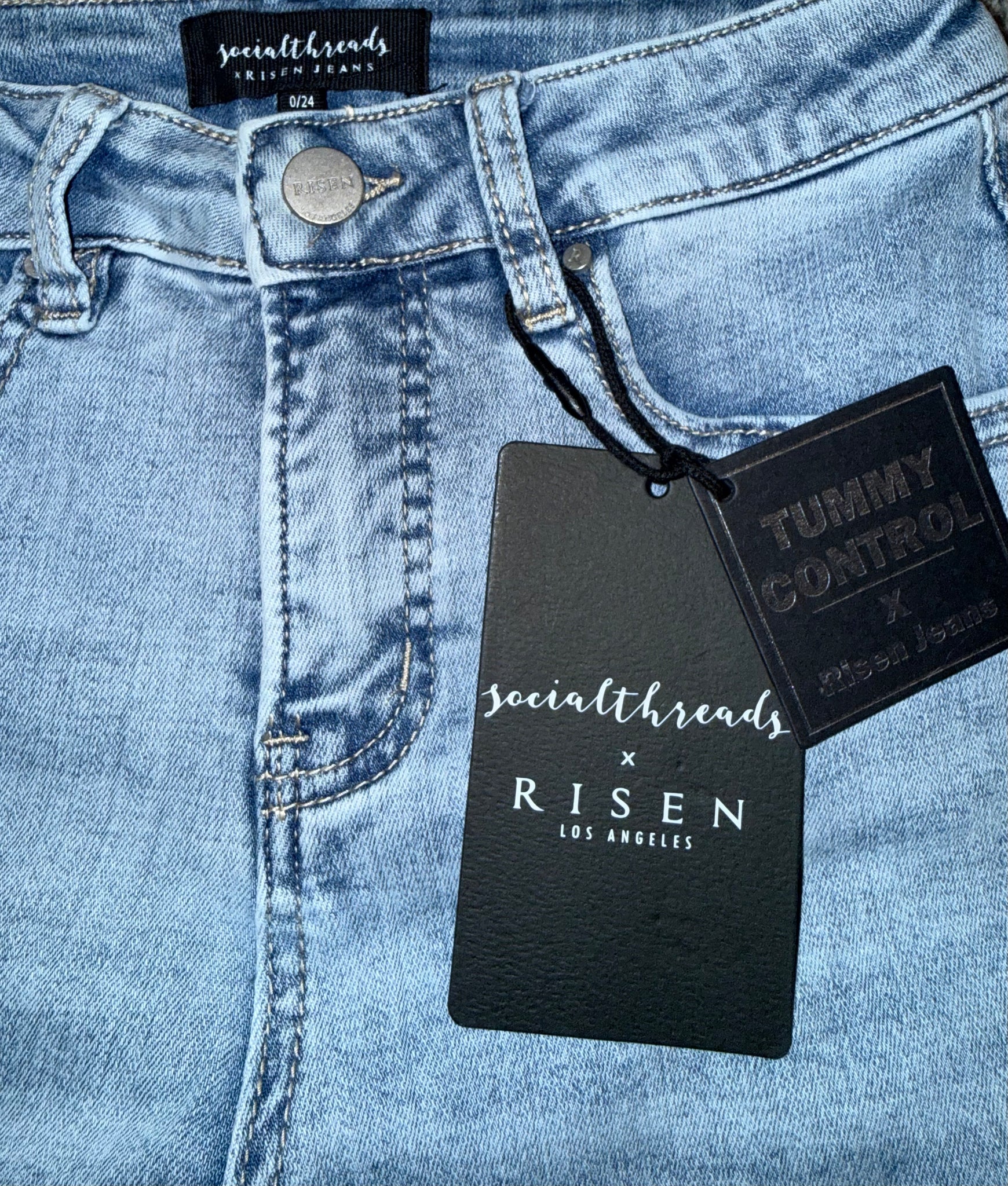 Social Threads x Risen women’s light wash stretch denim mid rise wide leg jeans with Tummy Control, size 0/24.