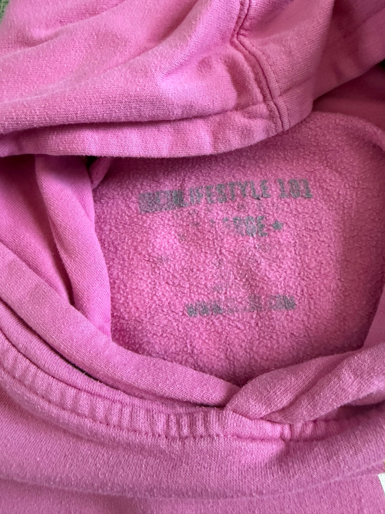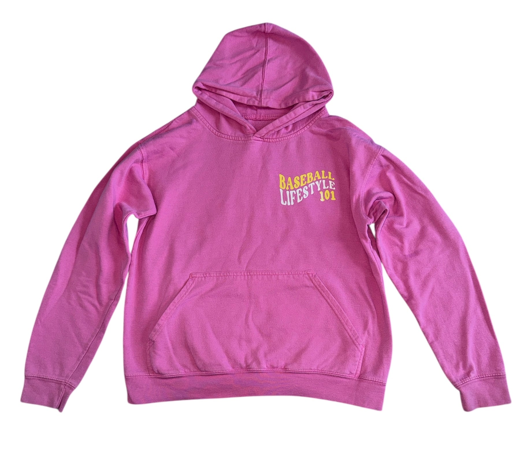 Baseball Lifestyle 101 bright pink pullover hoodie sweatshirt with Summer Nights and Ballpark Lights on back in white and yellow, size youth XL.
