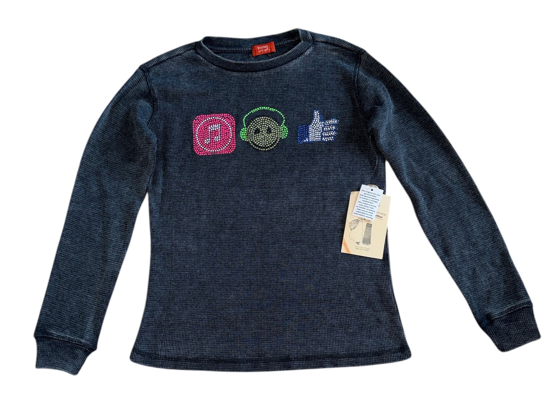 Butter Supersoft girls charcoal gray burnout thermal pullover top with bright, colorful, beaded emojis on front, size XL(16).