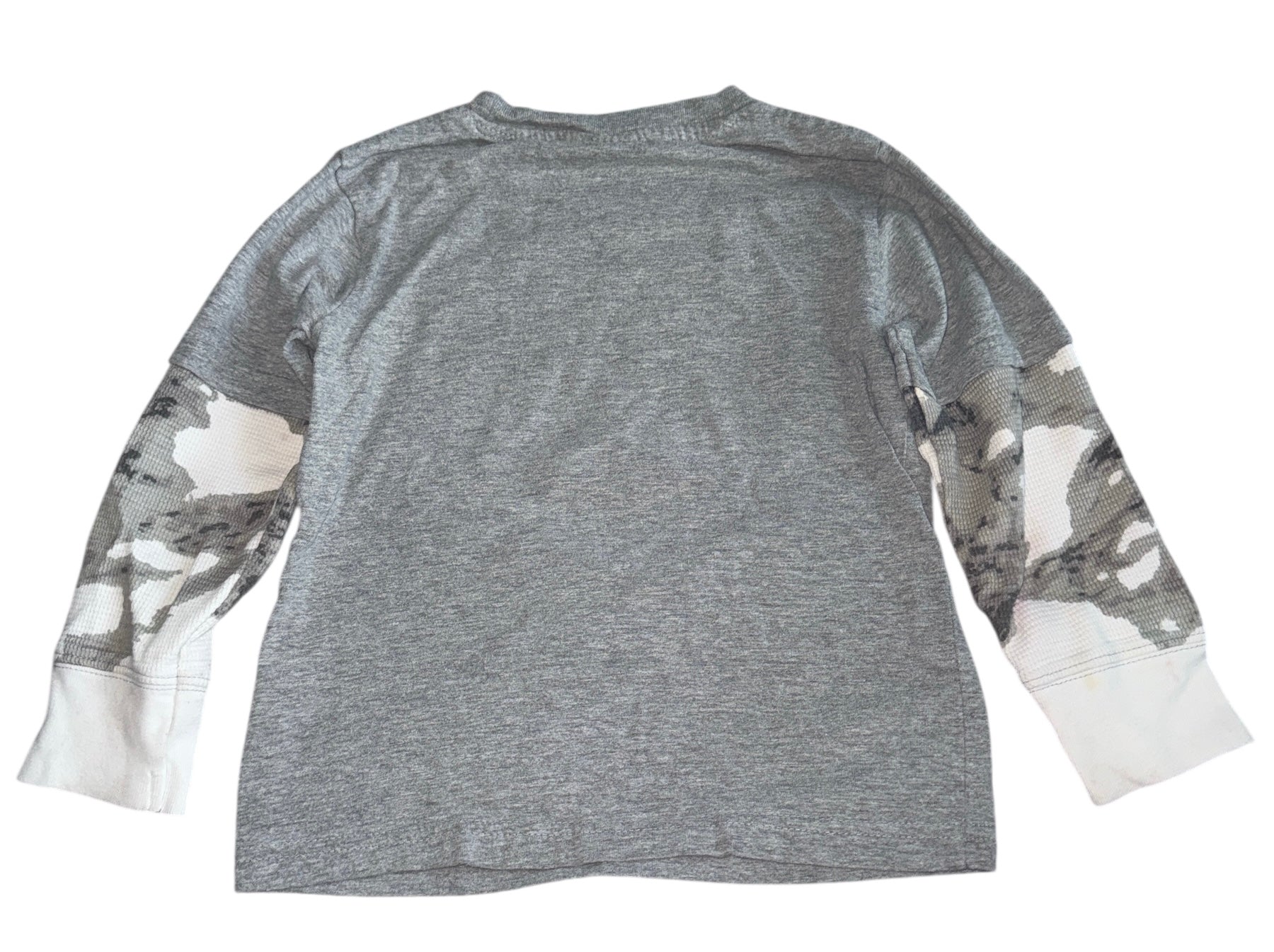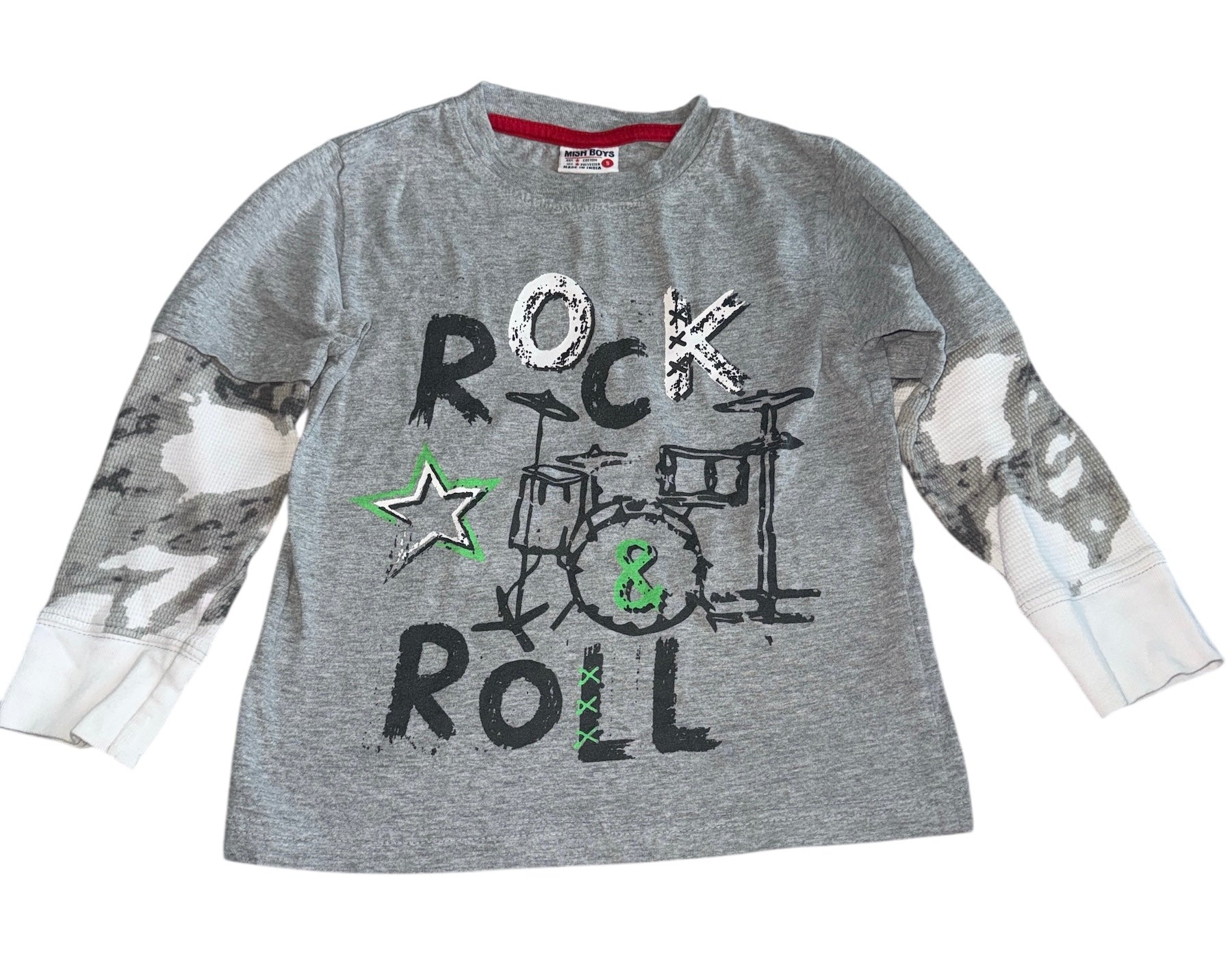 Mish boys light heather gray tee with camouflage thermal sleeves and Rock & Roll graphic, size 5.