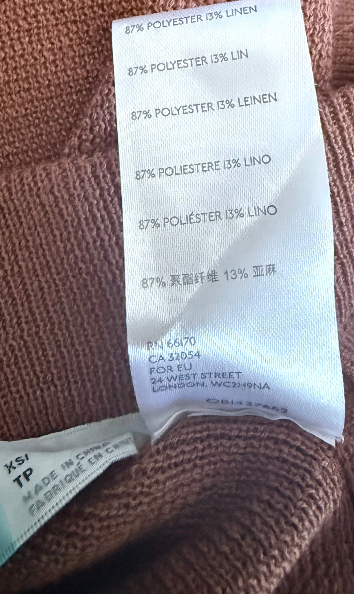 - Pants: 87% polyester, 13% linen