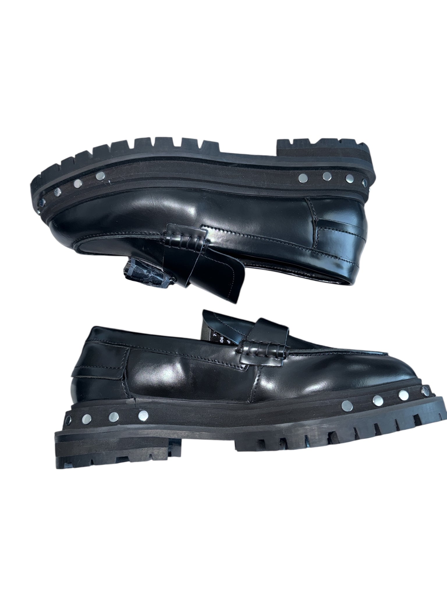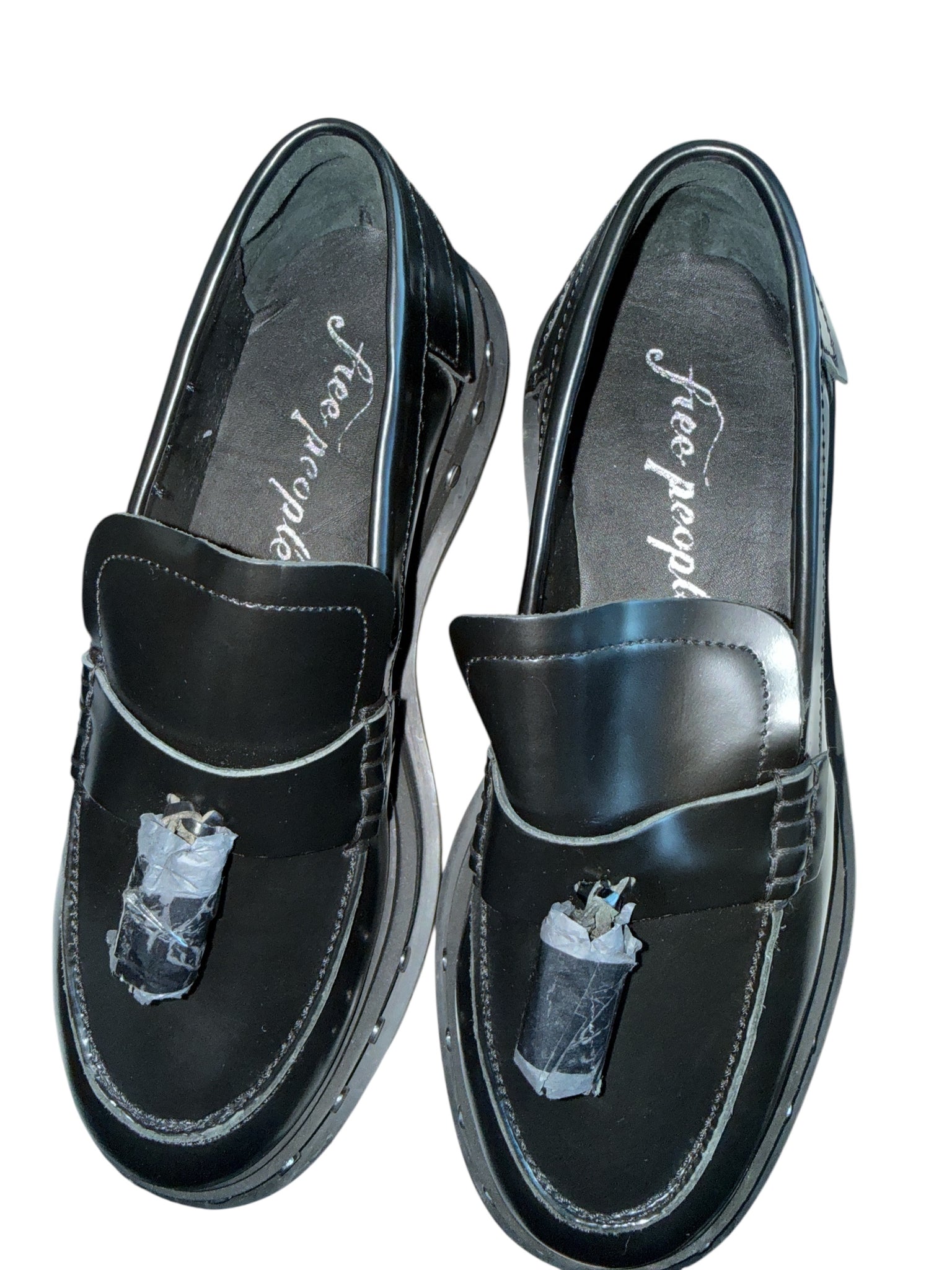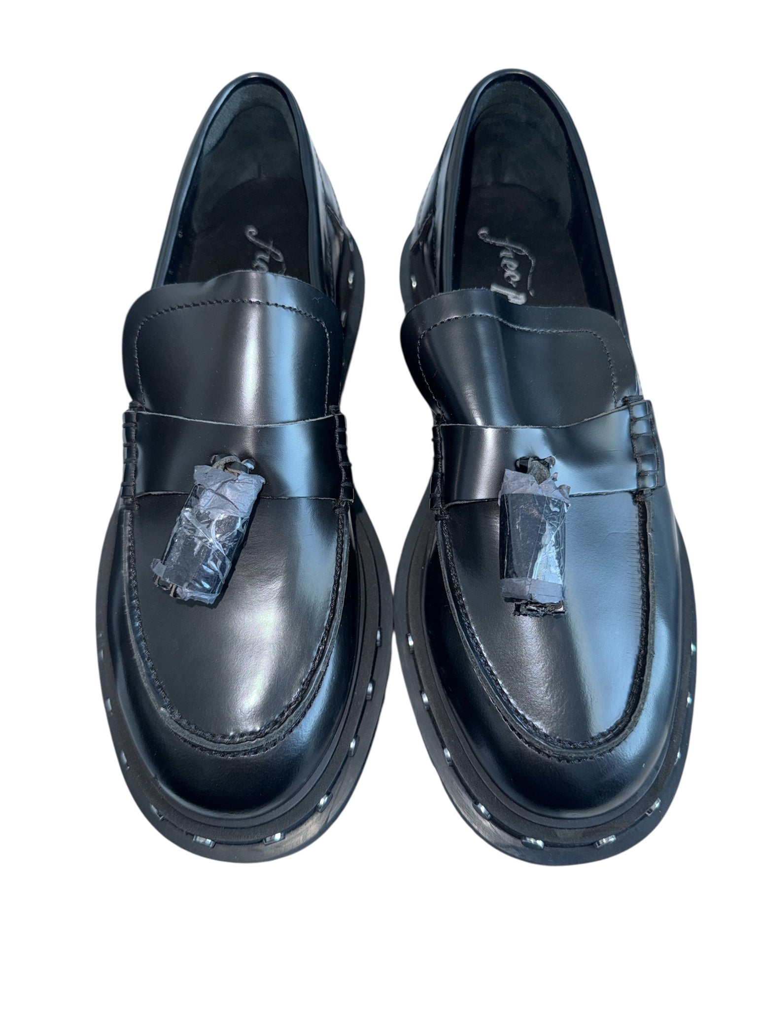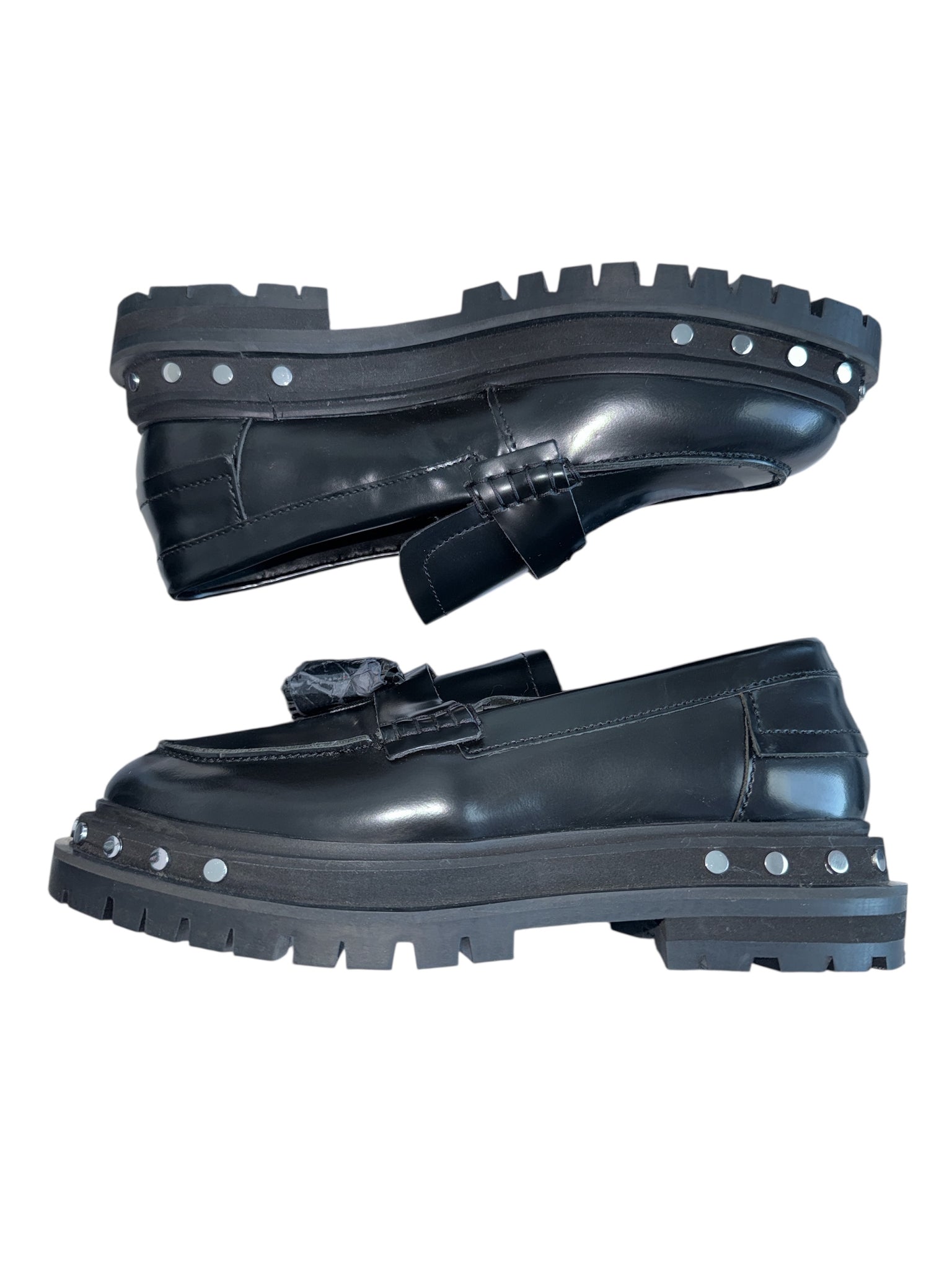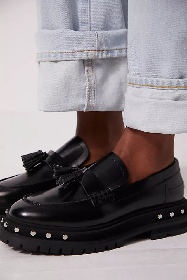 Free People women’s black Teagan tassel loafer with studded soles, size 7.5