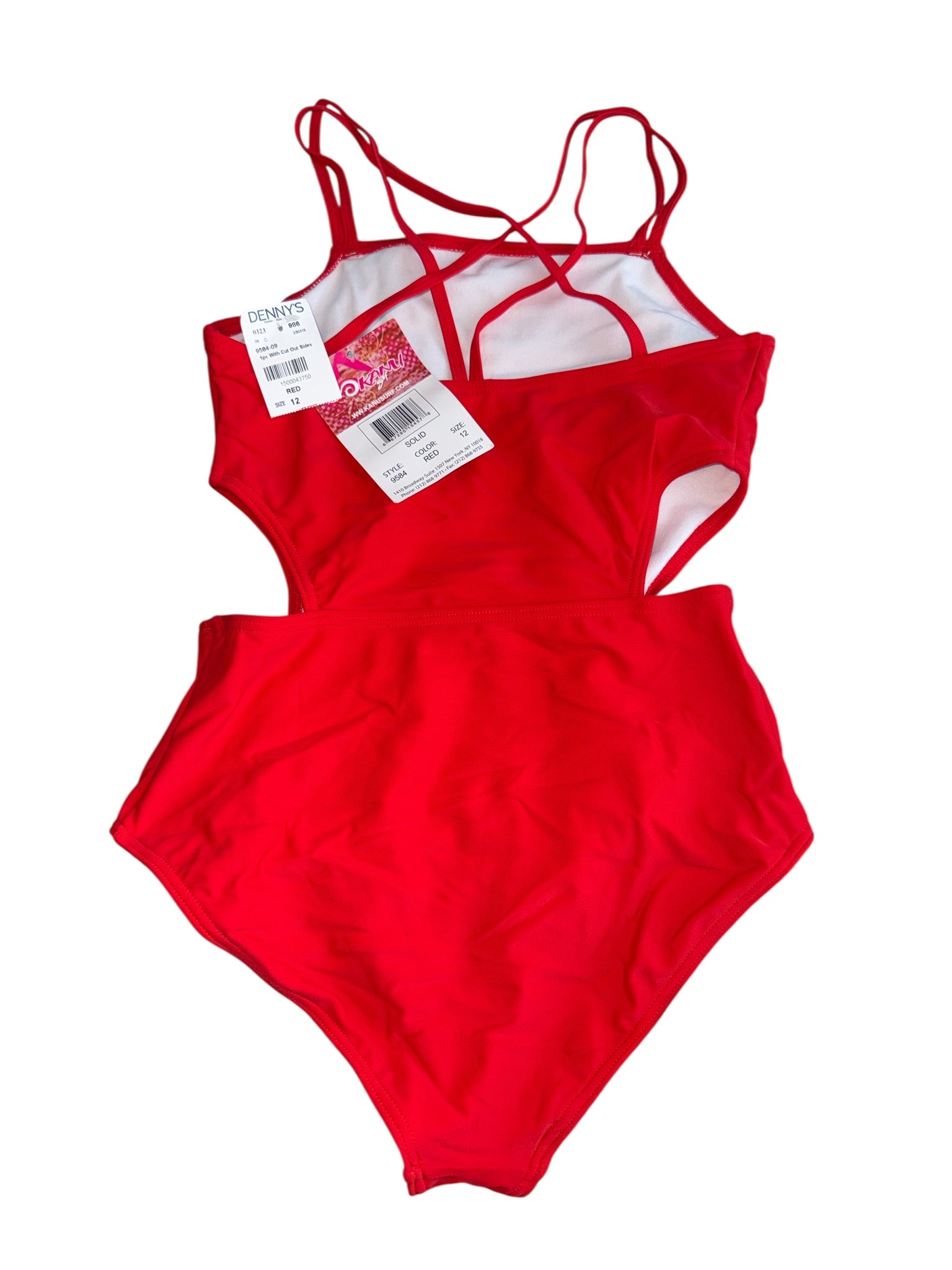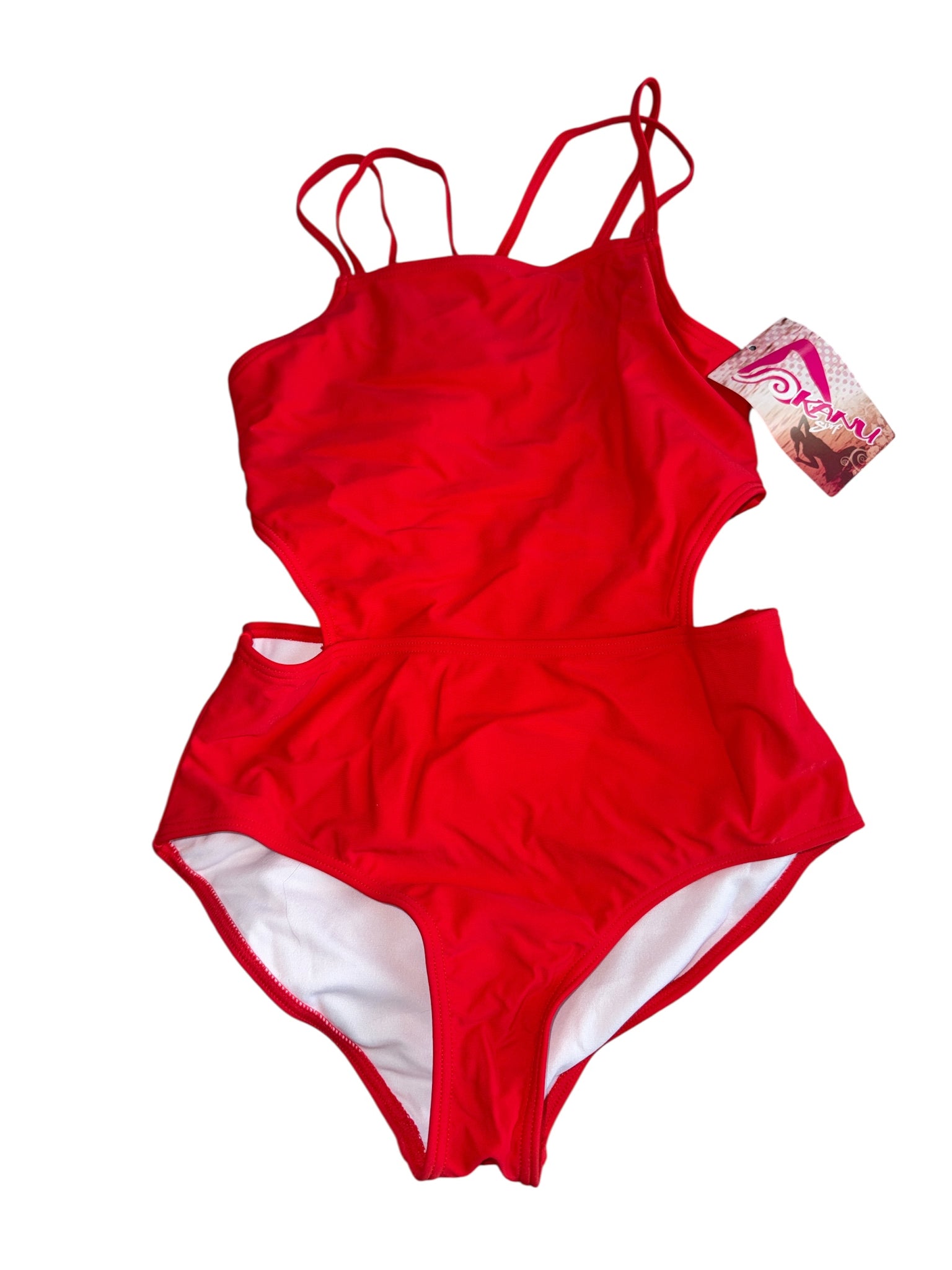 Kanu girls red one-piece bathing suit with criss cross spaghetti straps, size 12.