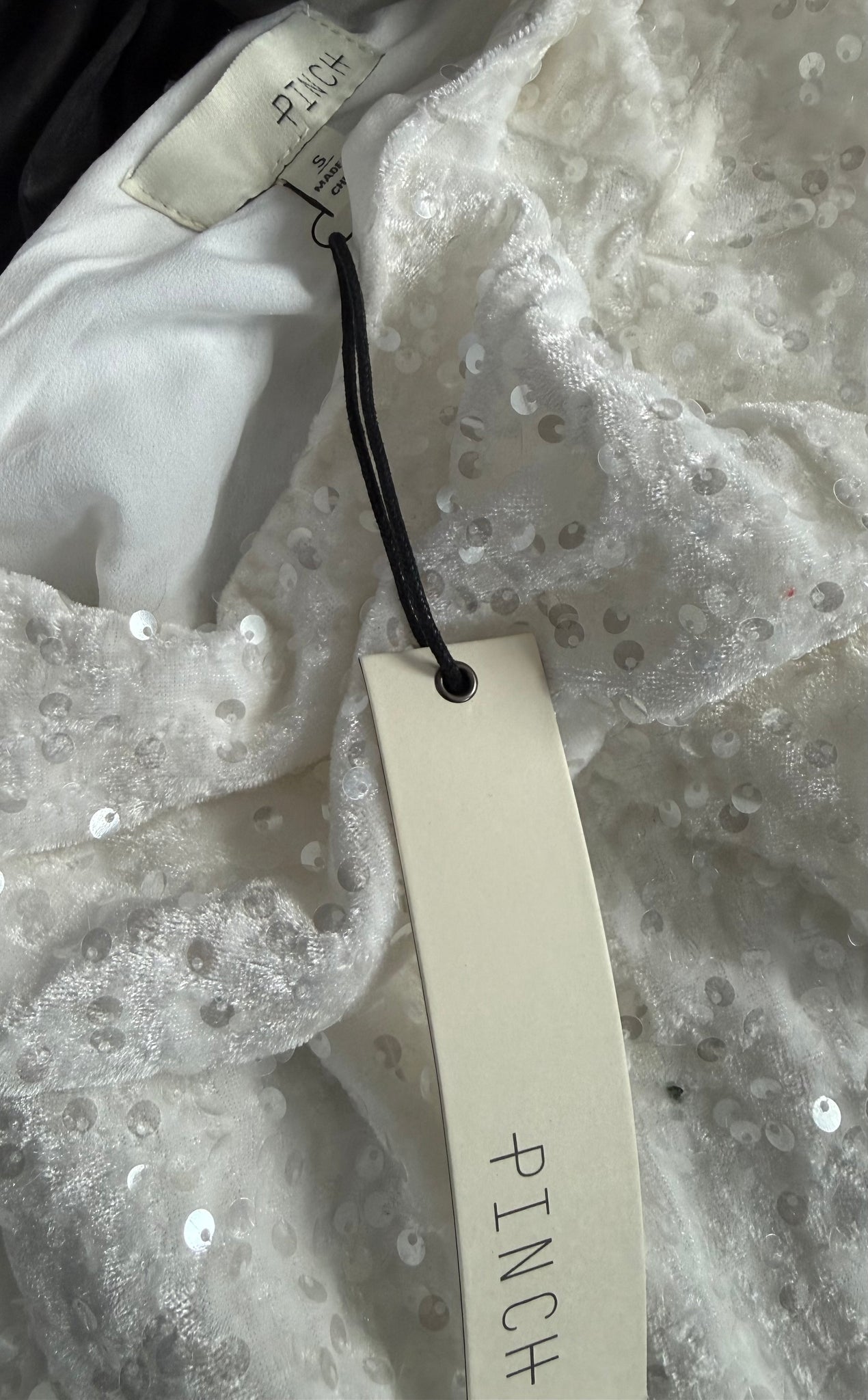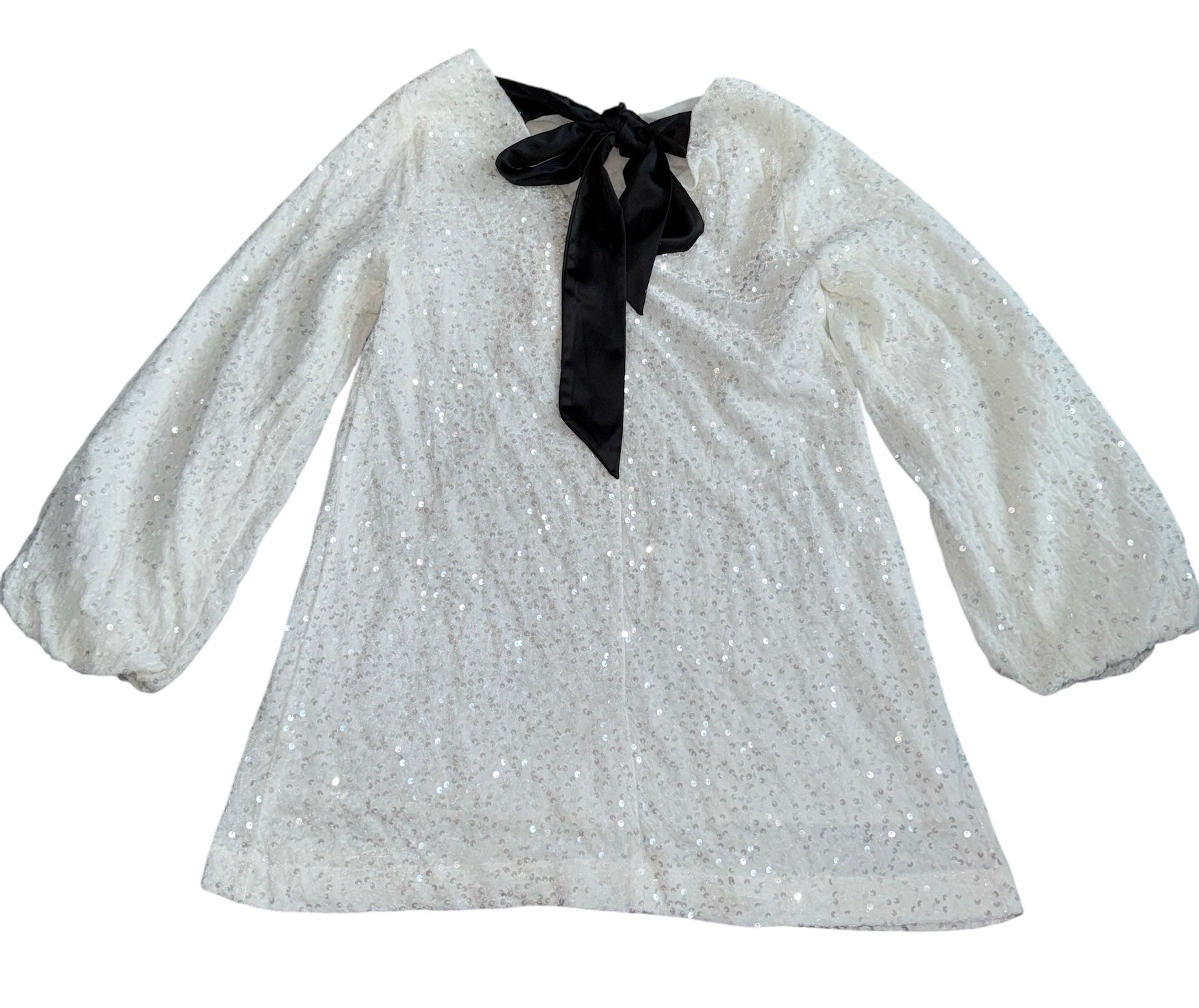 Pinch women’s winter white velvet mini dress with sequins and long balloon sleeves and black silky ties in back, size S.