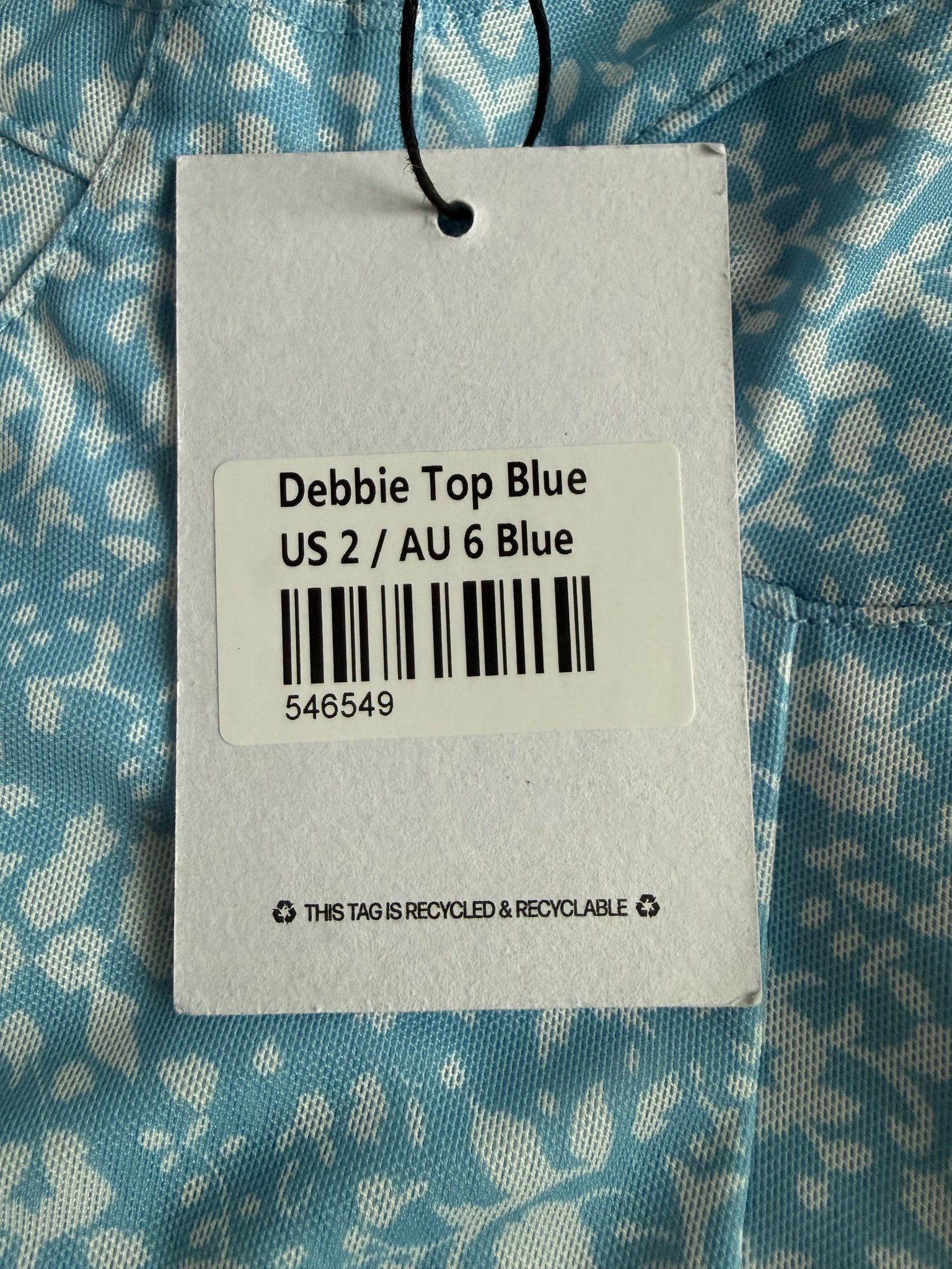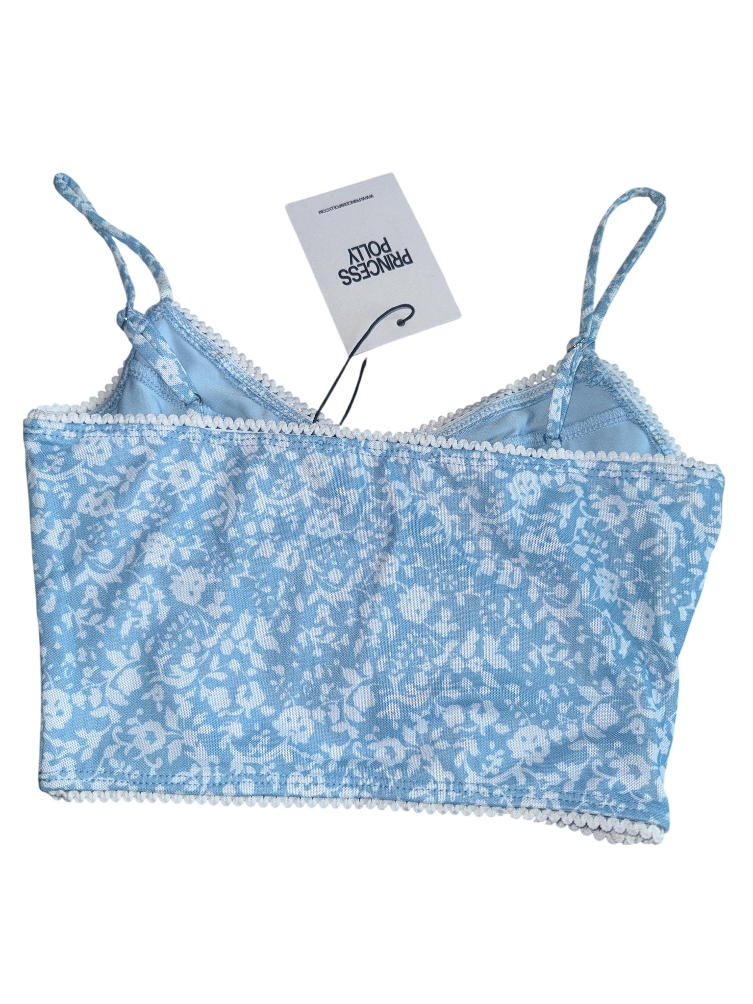 Princess Polly juniors mesh Debbie cropped tank in baby blue and white floral mesh with adjustable straps, size XS.