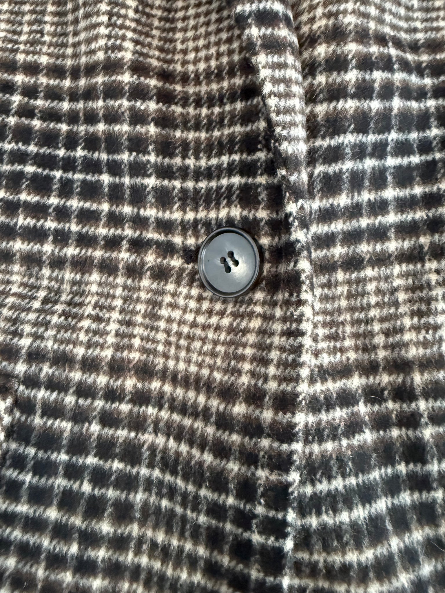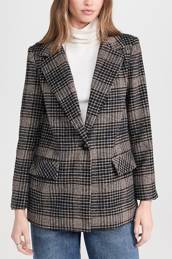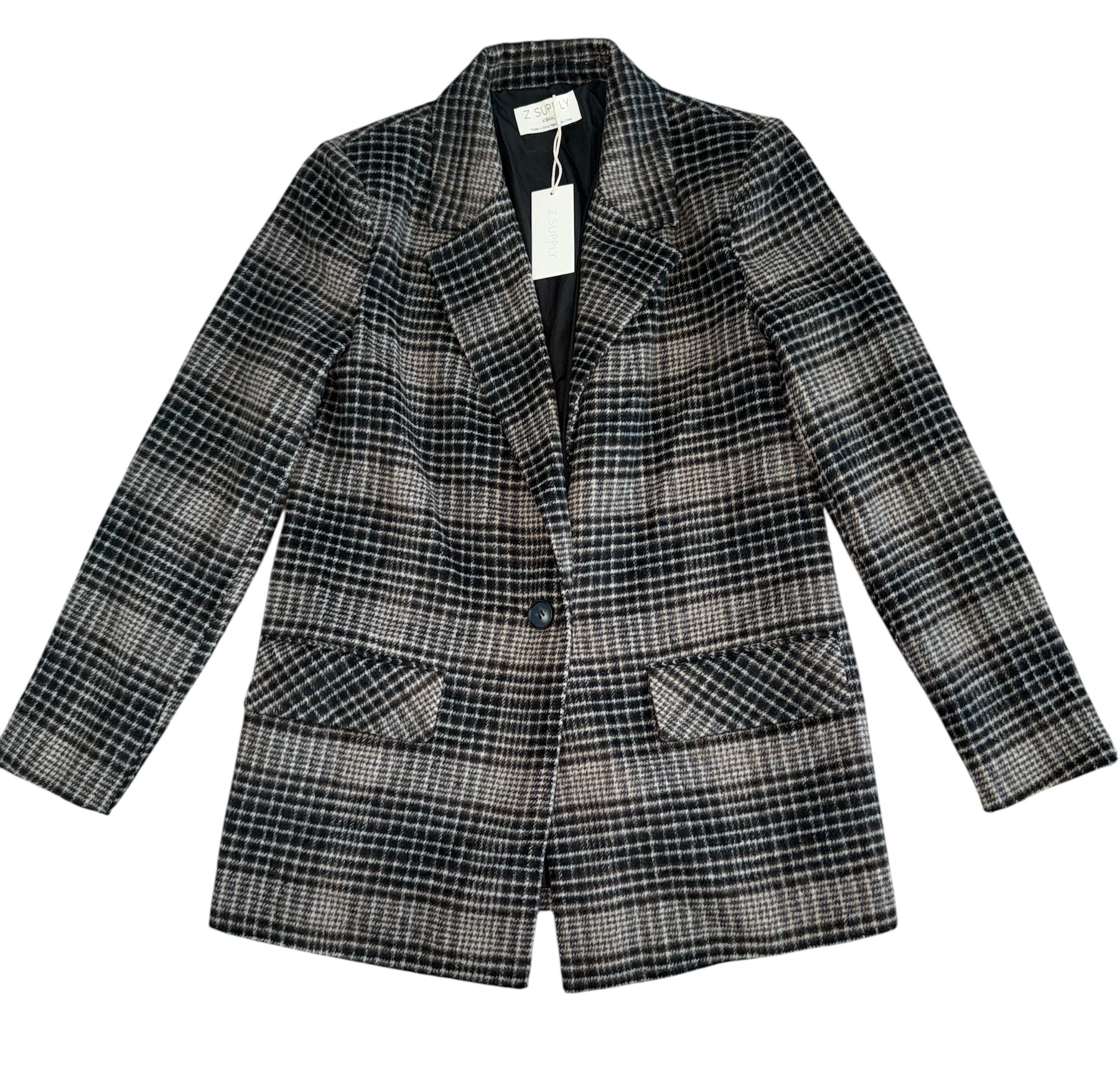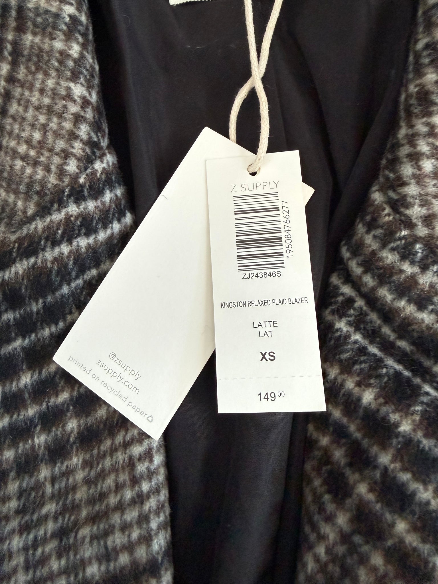 Z Supply women’s long brown plaid Kingston relaxed blazer with pockets and shoulder pads, size XS.