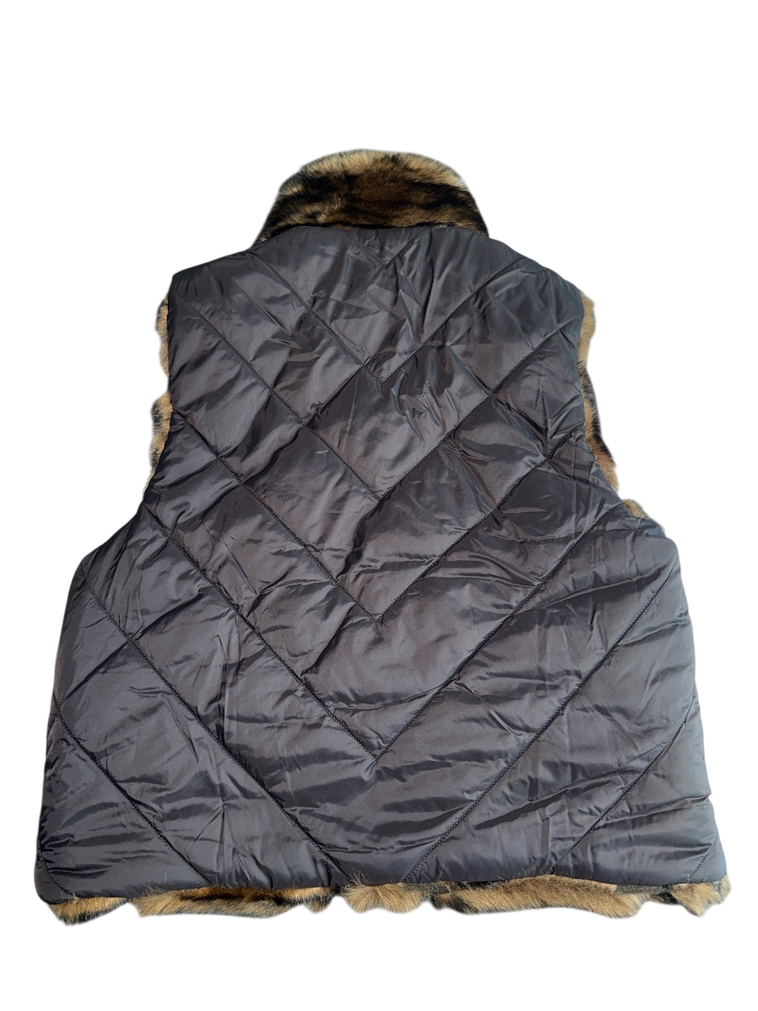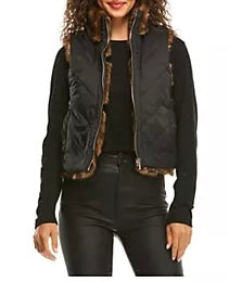 Donna Salyers women’s reversible shortie vest - dark mixed brown chevron faux fur on one side, black quilted on the other with pockets and zip closure, size S.