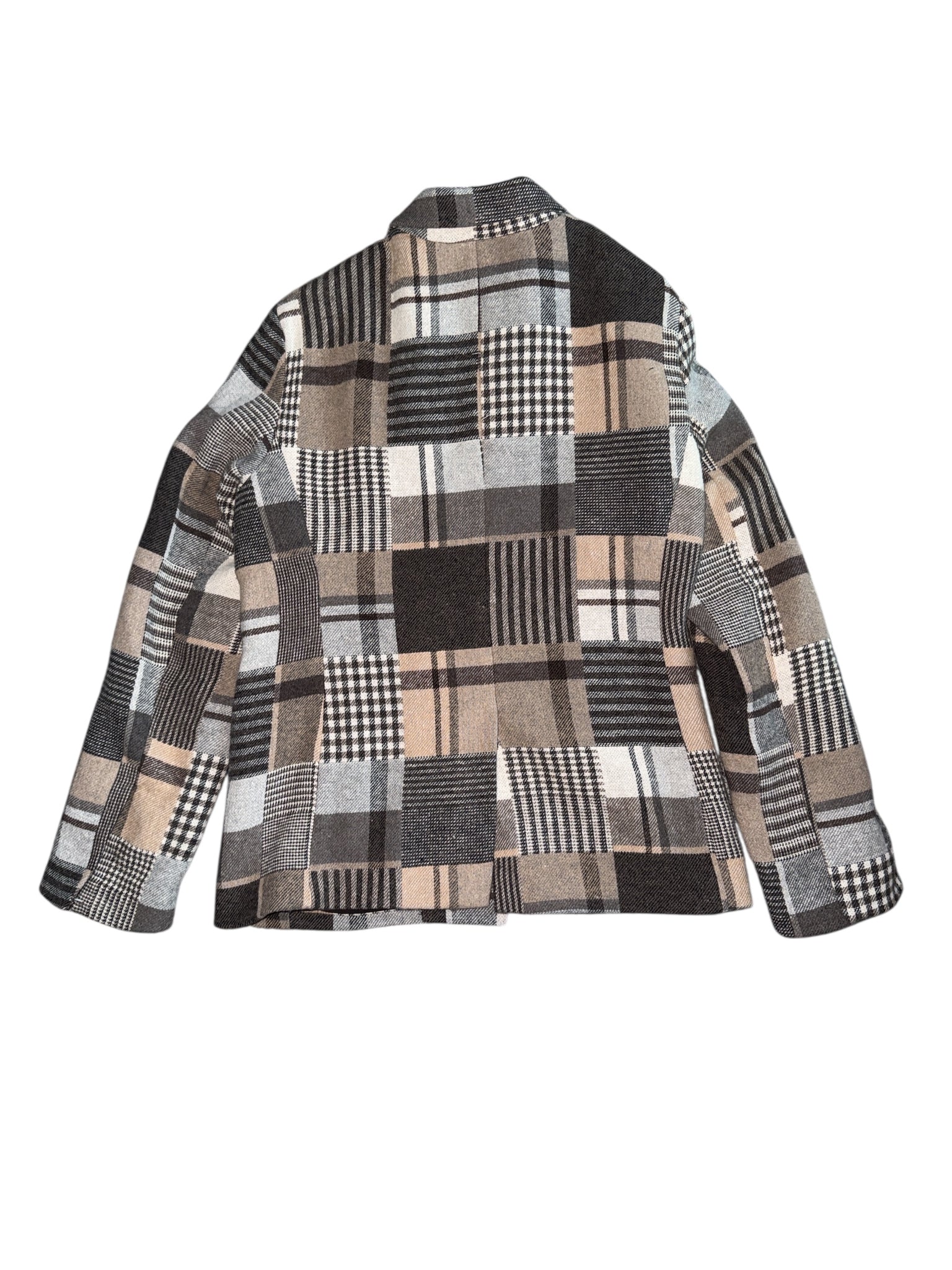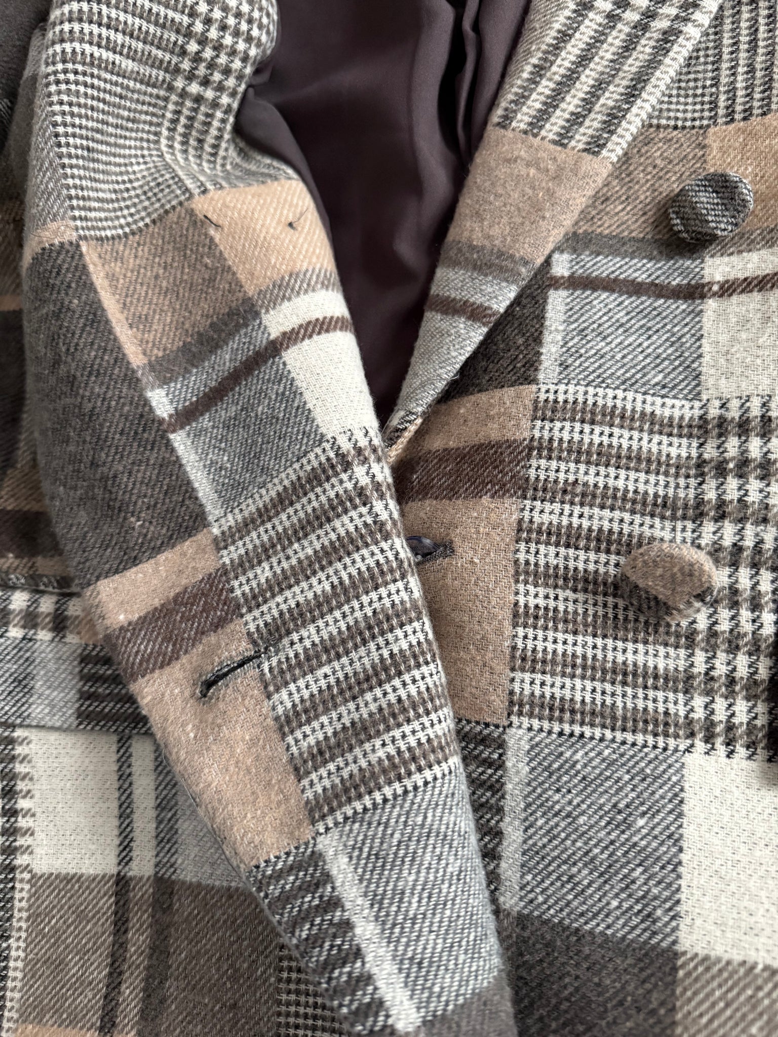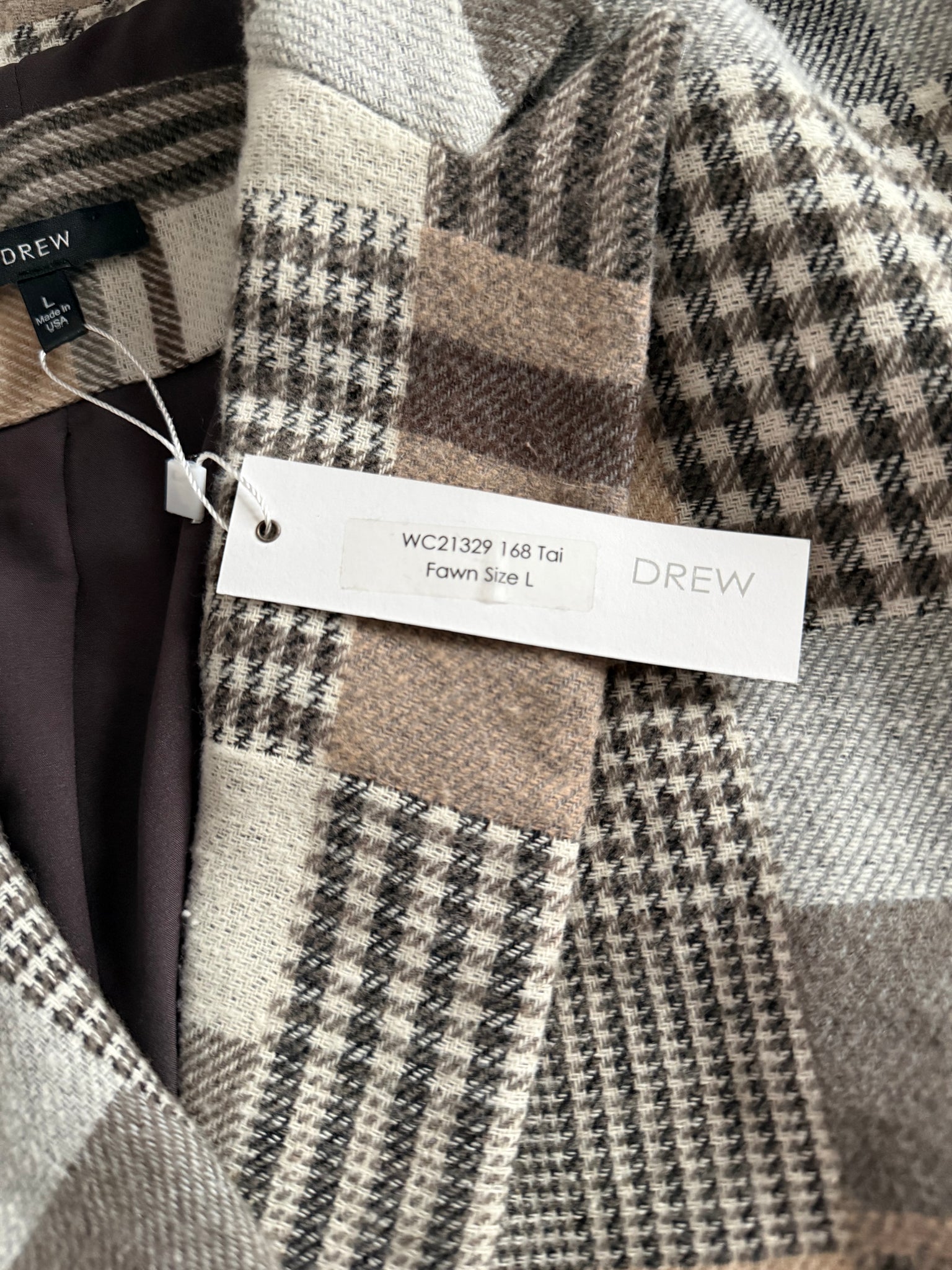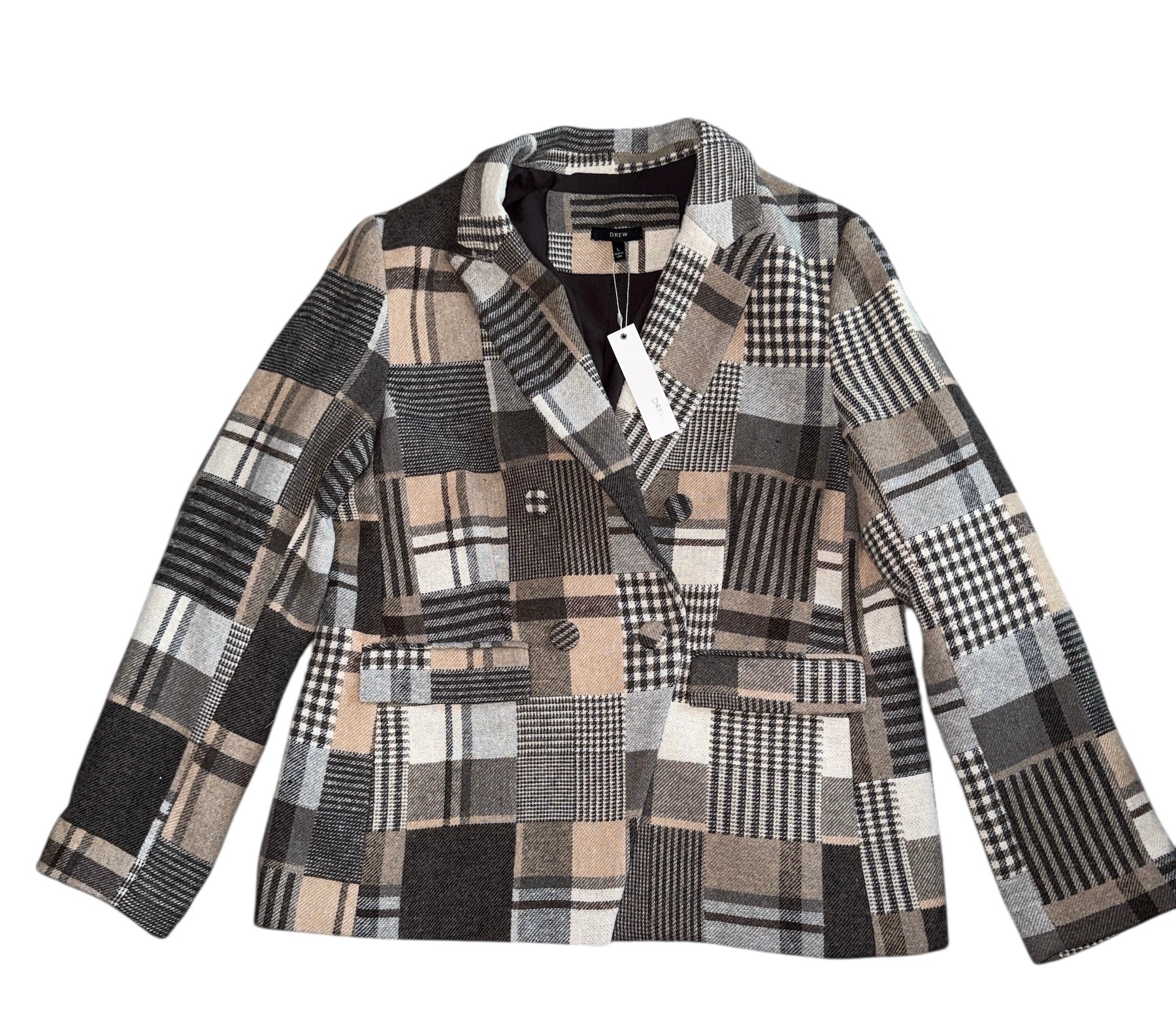 Drew women’s fawn plaid patchwork double breasted blazer jacket with fabric buttons, size L.