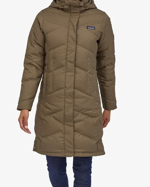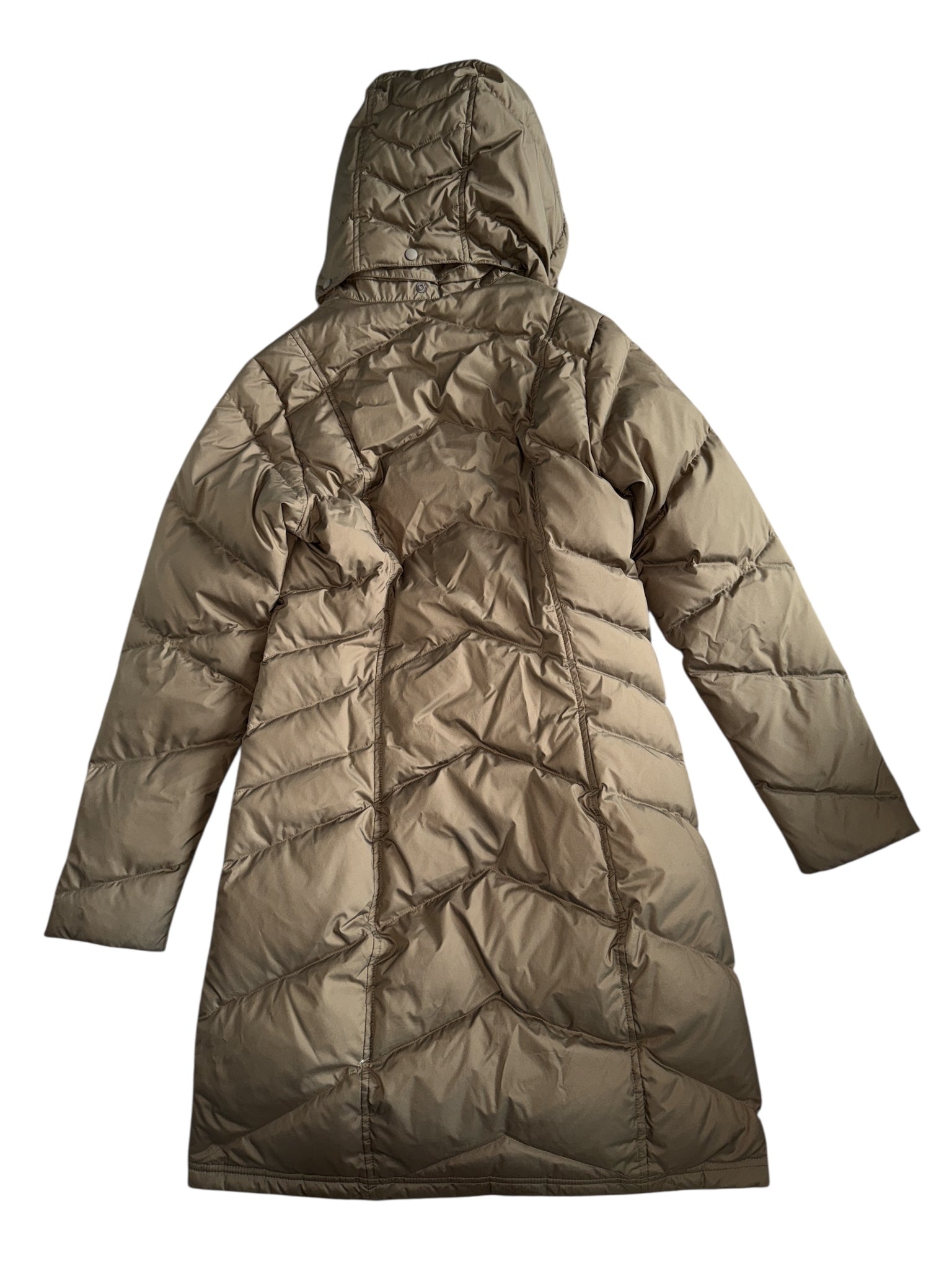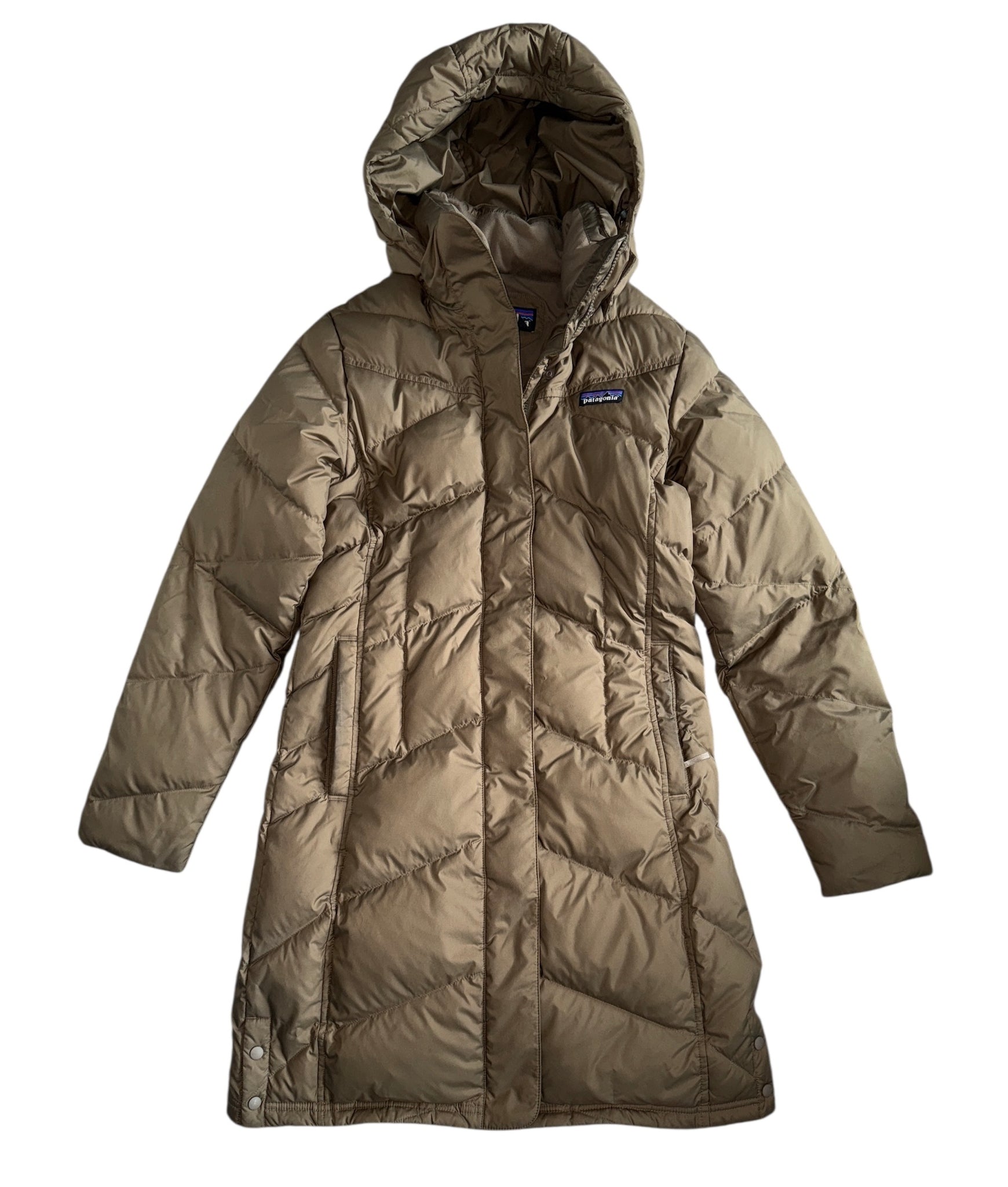 Patagonia women’s midi length Down With It down chevron quilted parka jacket in mocha, with snap off removable hood, zip/snap closure and pockets, size S.