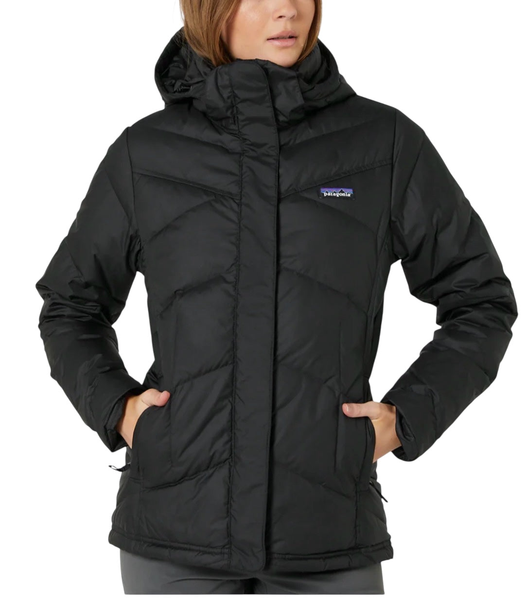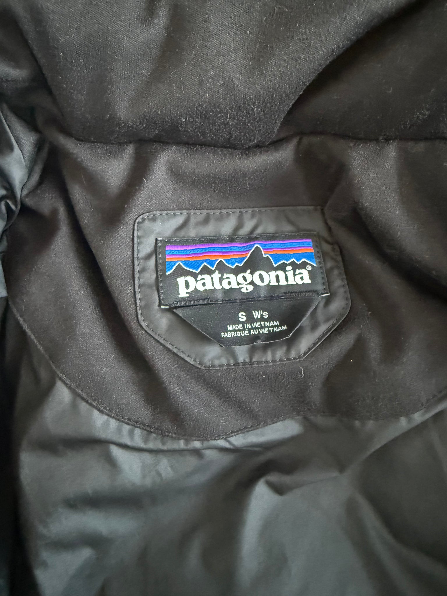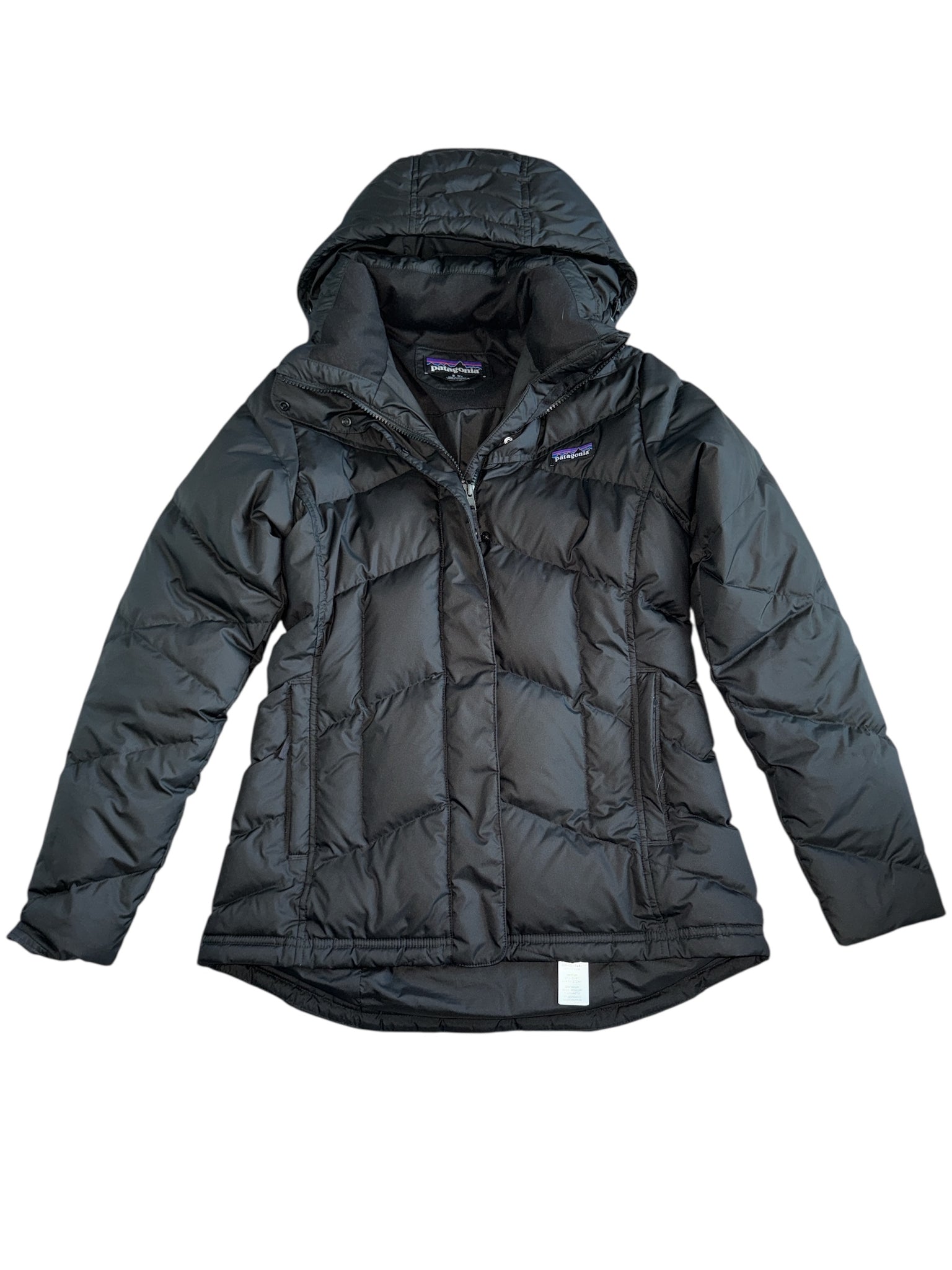 Patagonia women’s Down With It removable hooded winter jacket in black with zippered pockets, and zip/snap closure, size S.