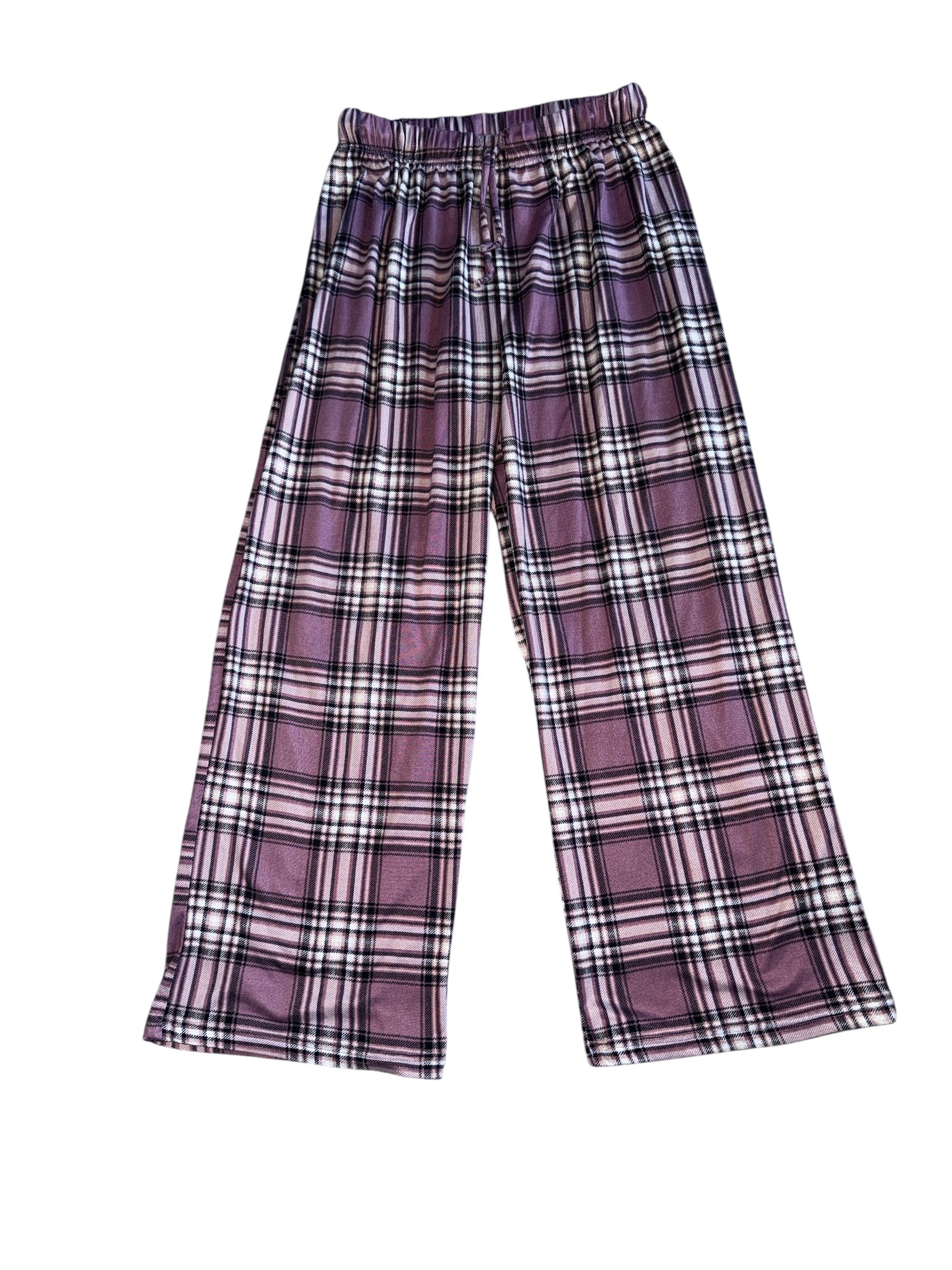 Pixie Lane girls super soft 2pack of karate lounge pants with drawstrings - one red and black plaid, one mauve, black, and white plaid, both size 8.