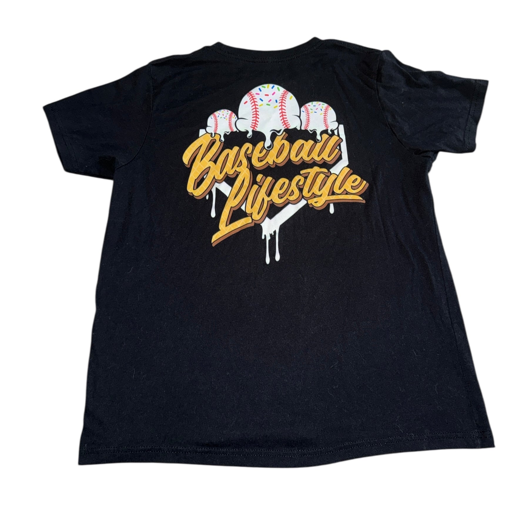 Baseball Lifestyle B101 boys soft black crew neck tee with colorful melting ice cream graphic, size youth XL.