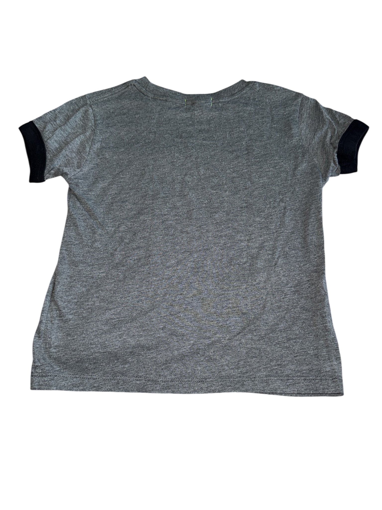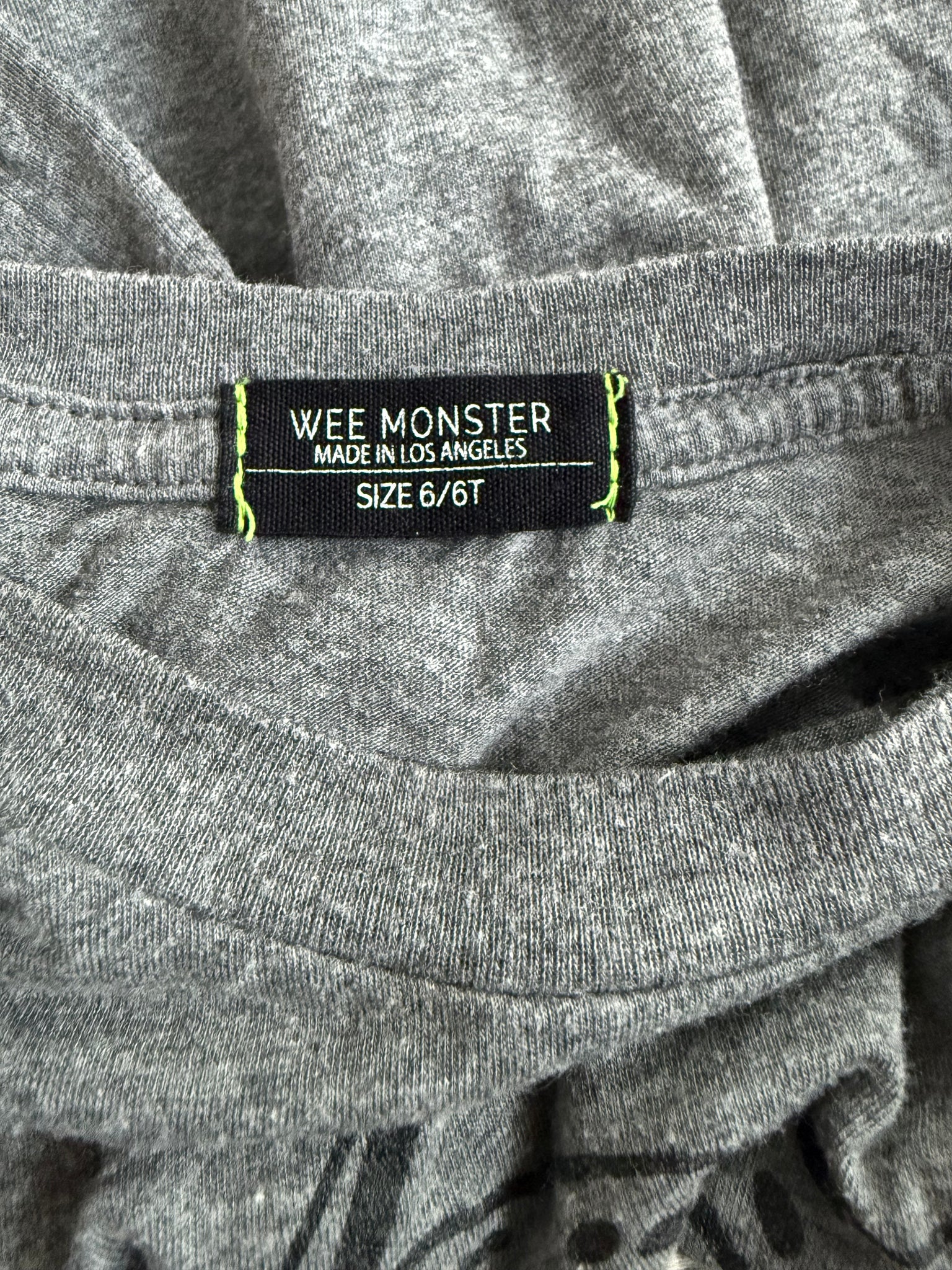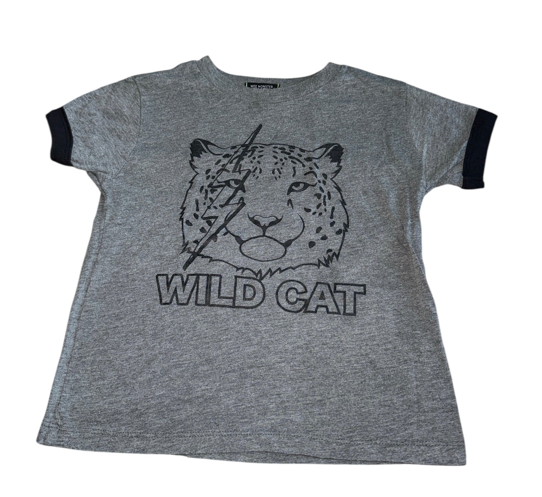 Wee Monster boys super soft heather gray crew neck tee shirt with Wild Cat leopard graphic and black ringer sleeves, size 6/6T.