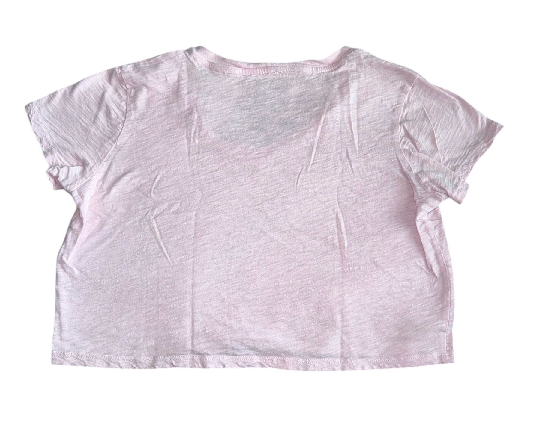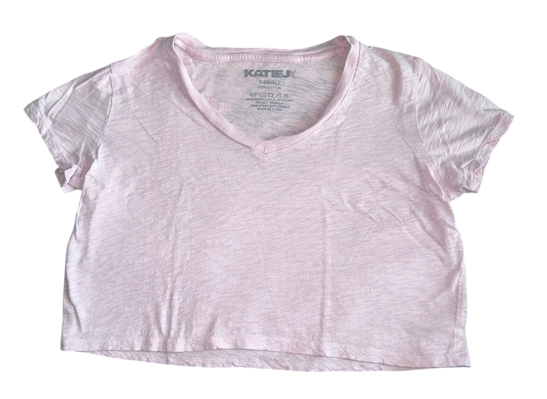 Katie J NYC junior women’s cropped slub cotton v neck tee in light pink, size XS.