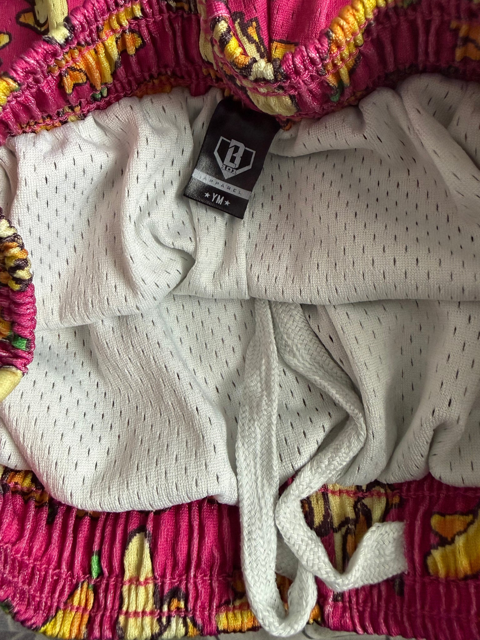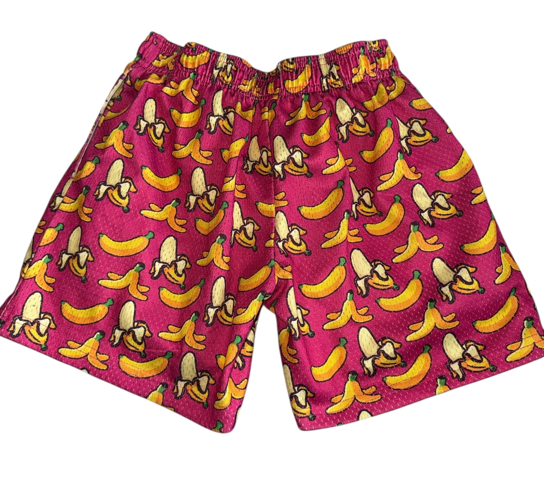 Baseball 101 Lifestyle boys fully-lined mesh shorts in pink with yellow banana graphic print and inner white draw cords, size YM.