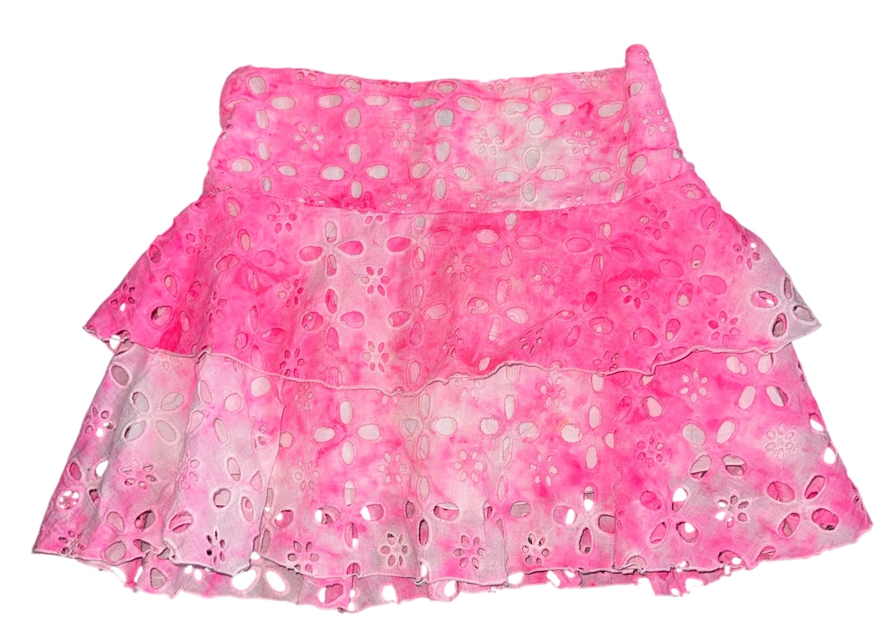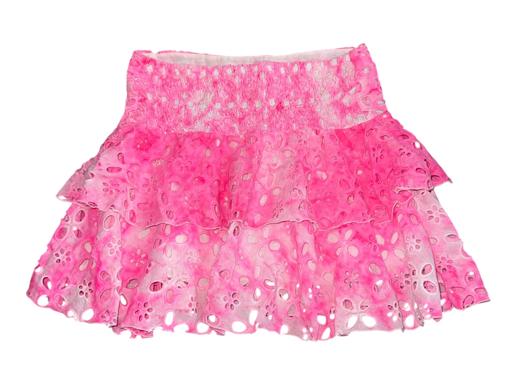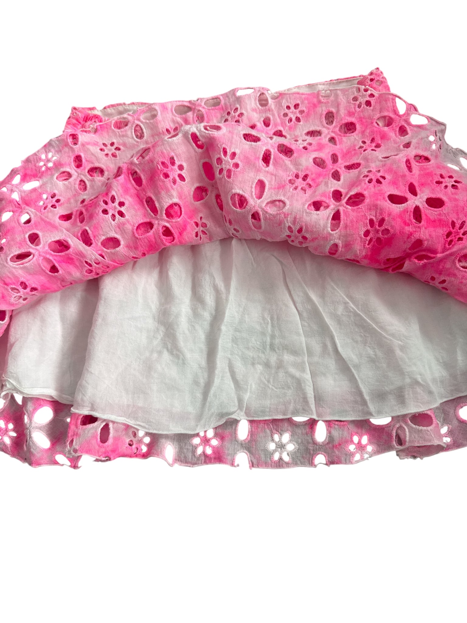 Flowers By Zoe girls neon pink and white tie dye eyelet skirt with little flower cutouts, tiered layers, stretchy smocking in back size XL(12-14).