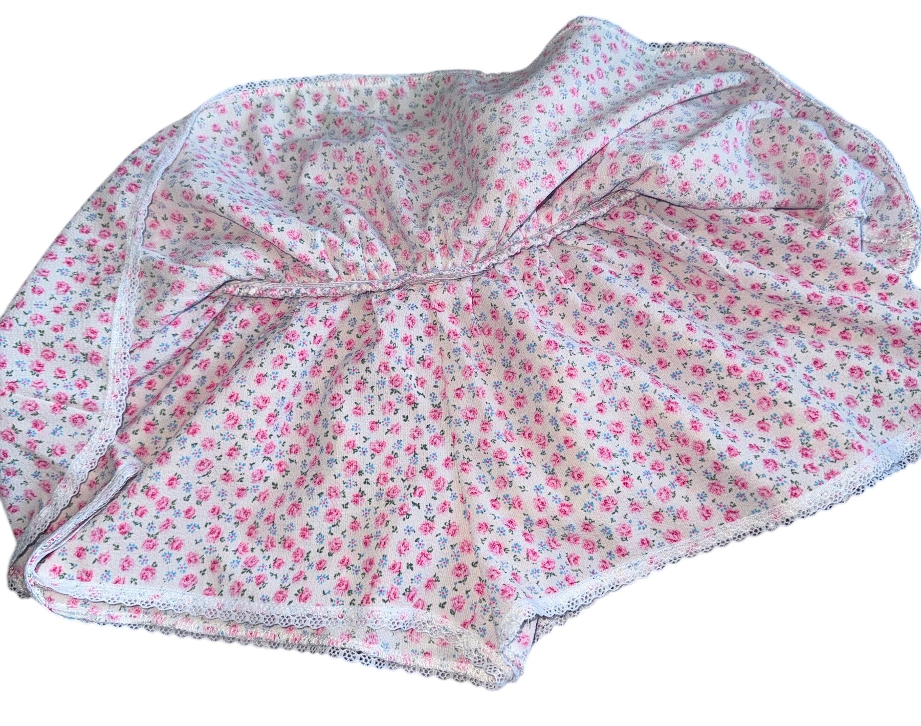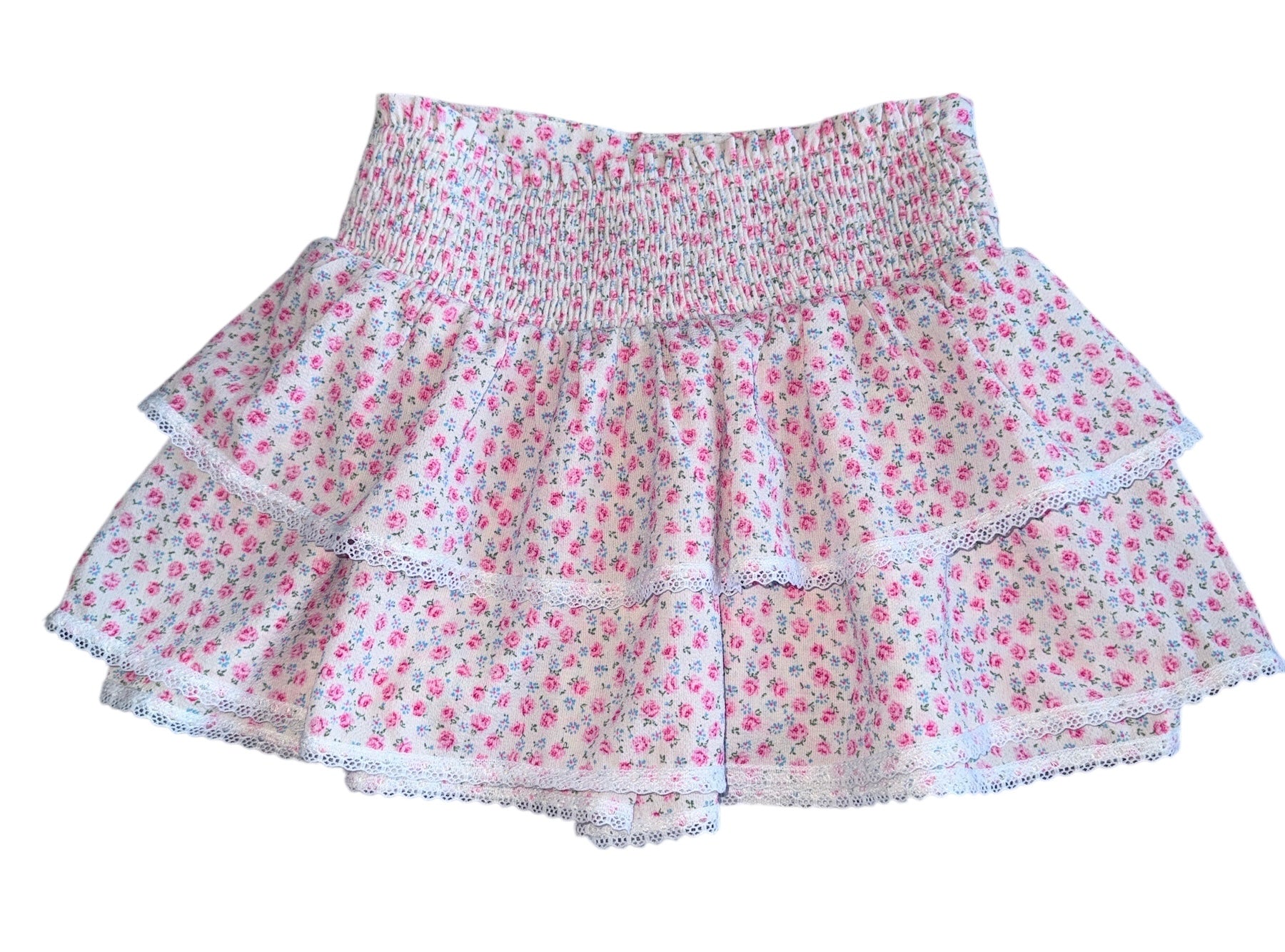 Katie J NYC tween girls pink ditsy floral Jordie skort with smocked back, lace trim, and button embellishments, size M(10).