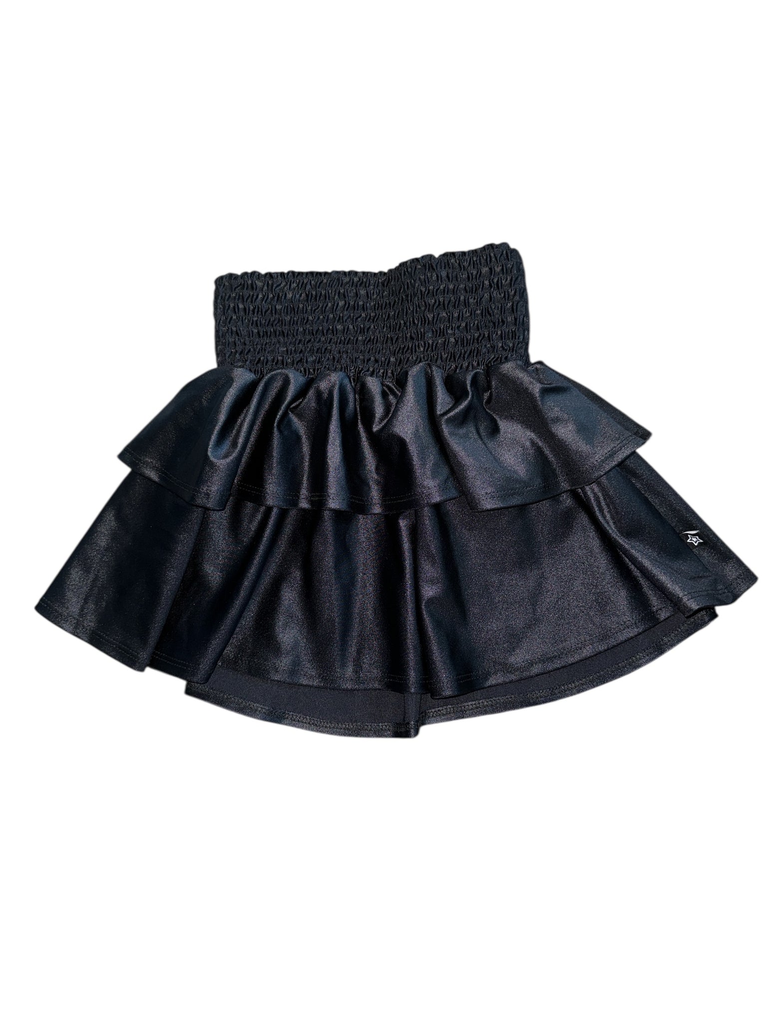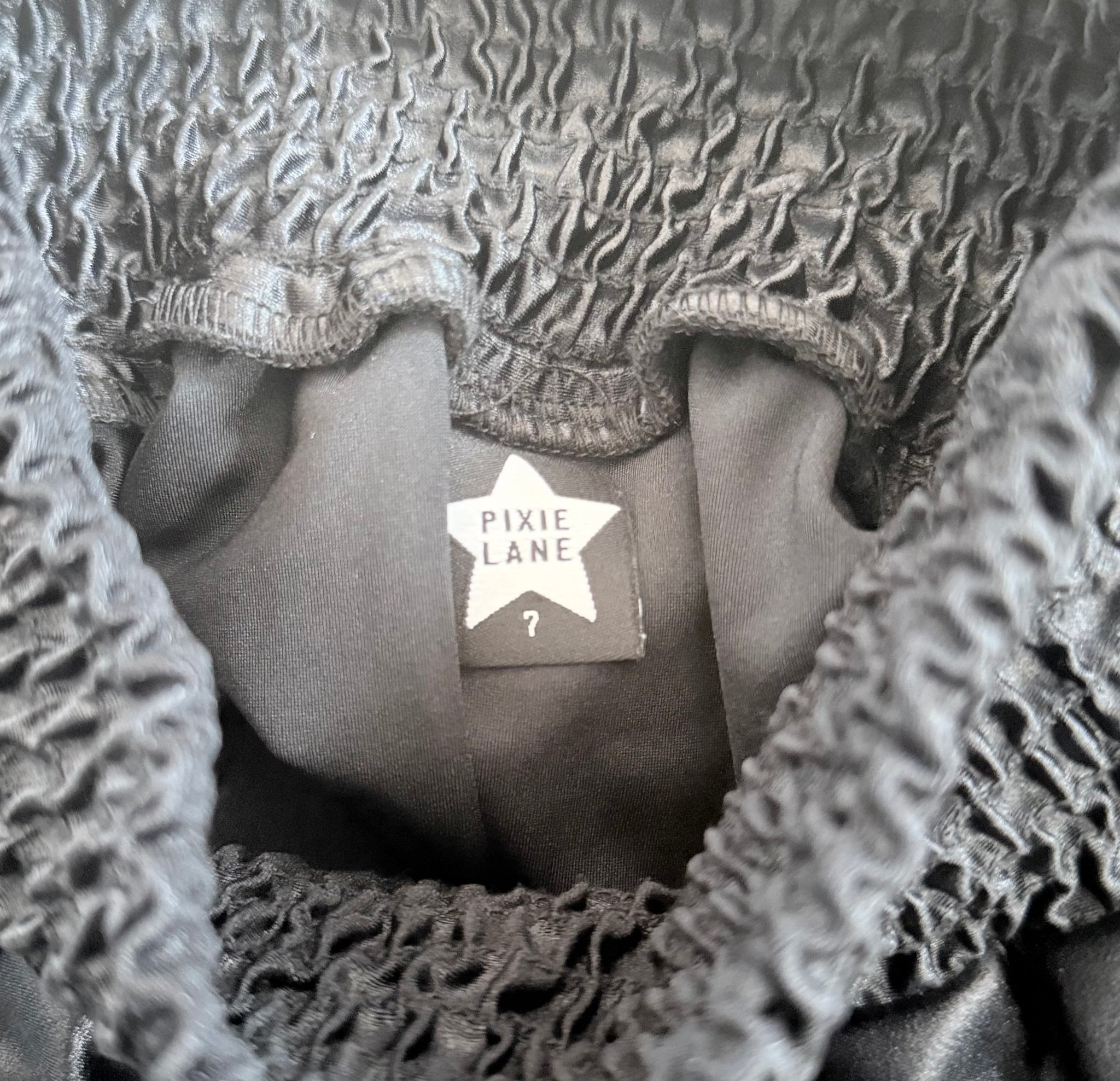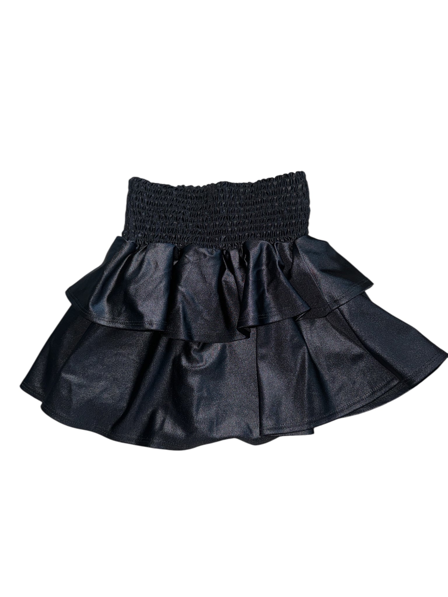 Pixie Lane girls black high shine ruffled mini skirt with smocked waistband, size 7.