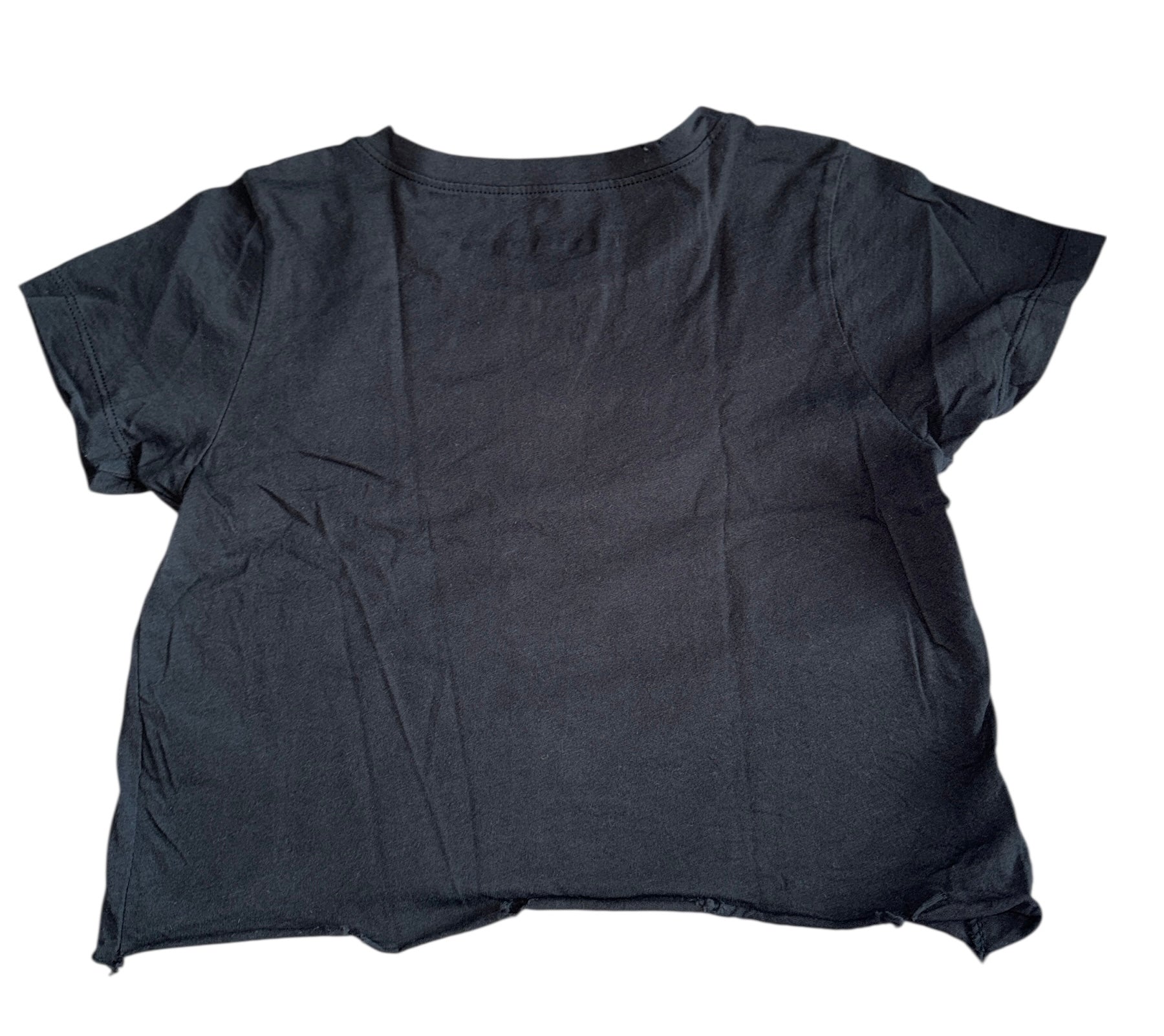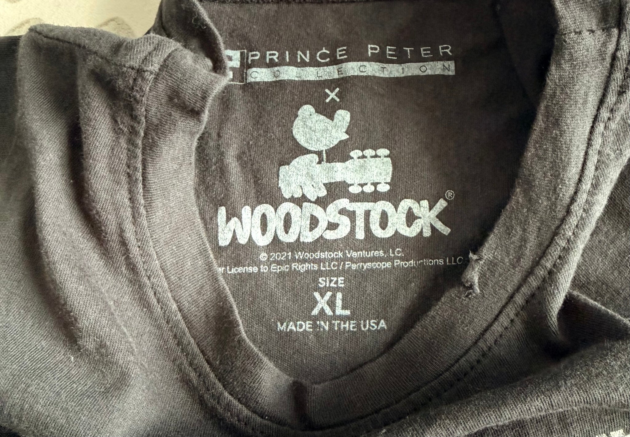 Prince Peter washed black boxy cropped tee shirt with distressed raw edges and Woodstock graphic size XS.