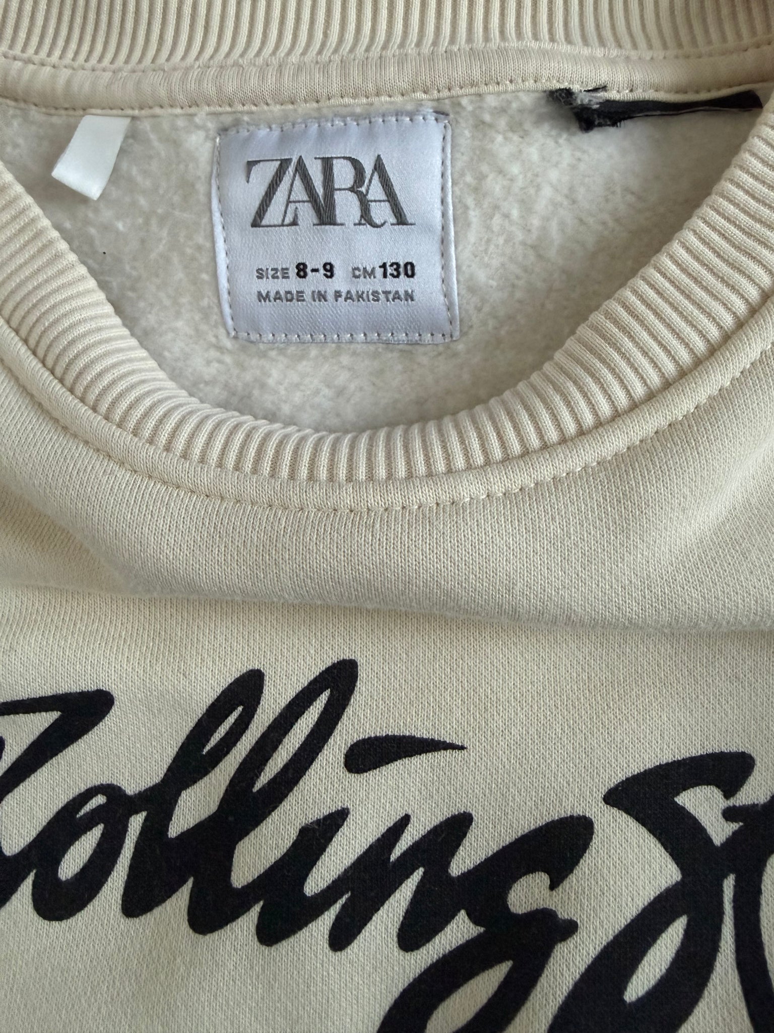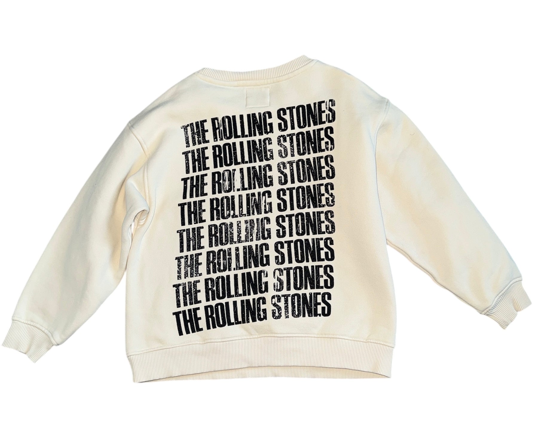 Zara girls soft fleece-lined cream pullover crew neck sweatshirt with leopard lips and Rolling Stones graphic on front and back, size 8-9.