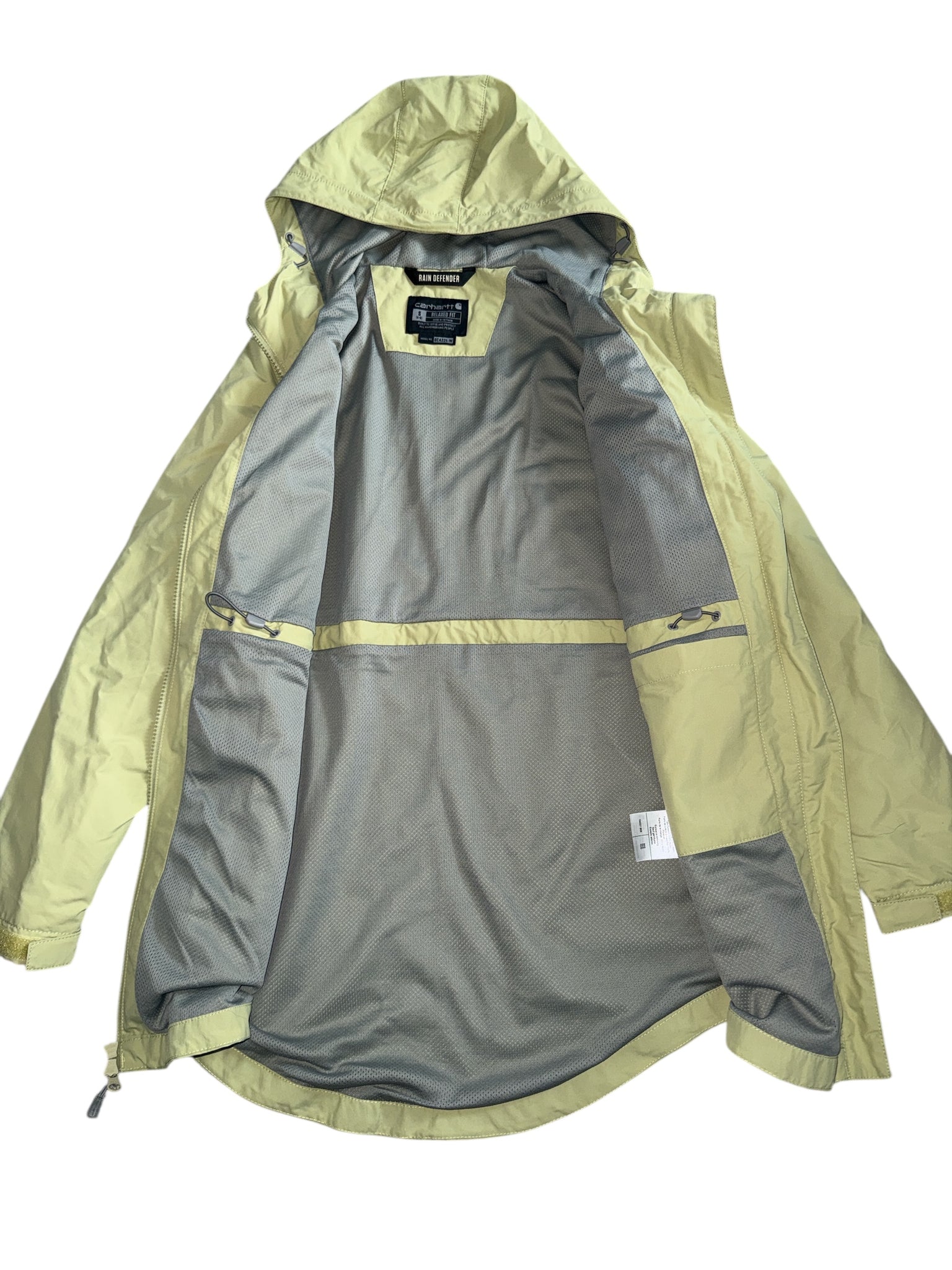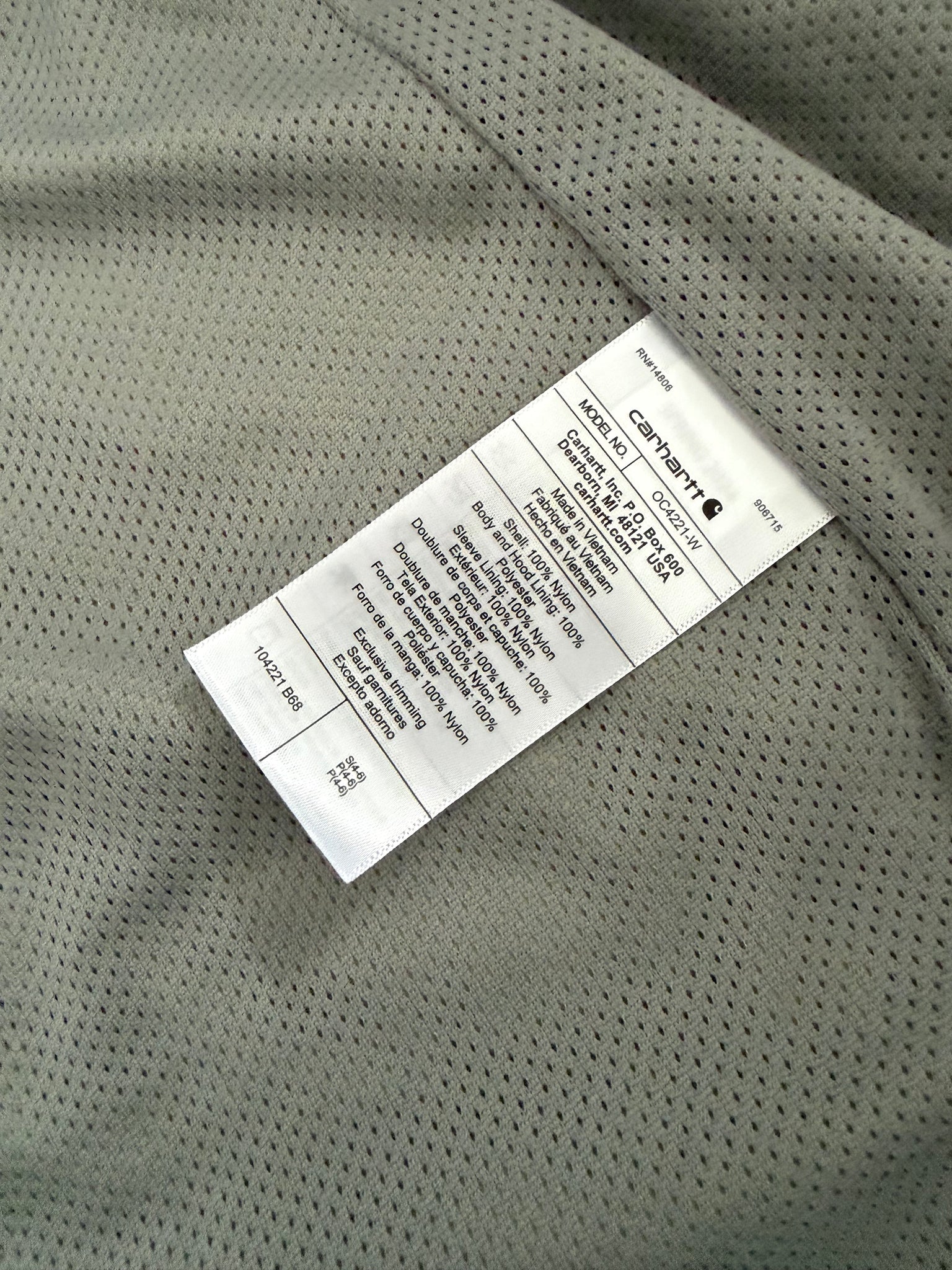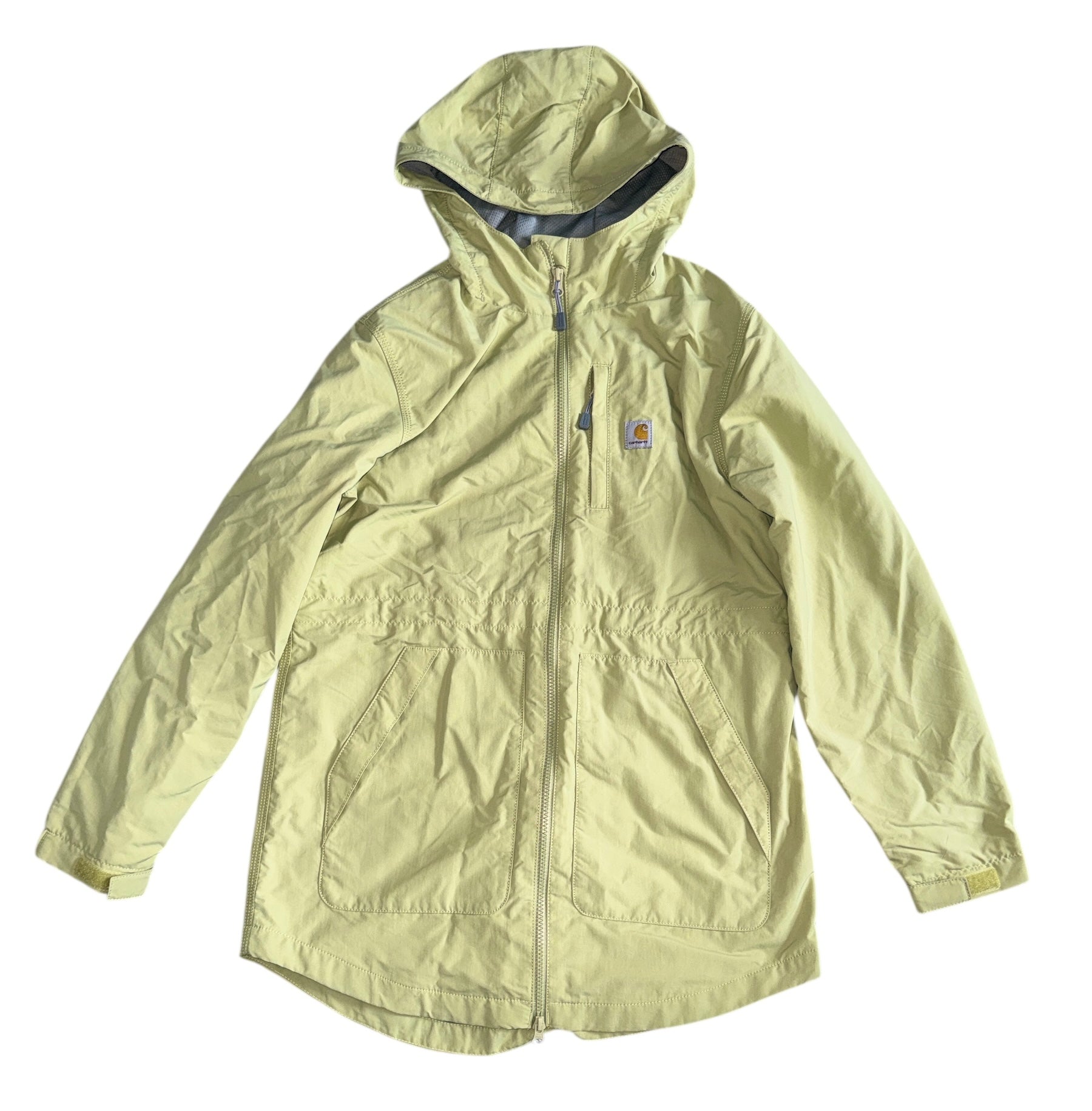 Carhartt women’s relaxed fit hooded Rain Defender zip up jacket with various zippered pockets and bungee cords to cinch for a better fit, size S(4-6).