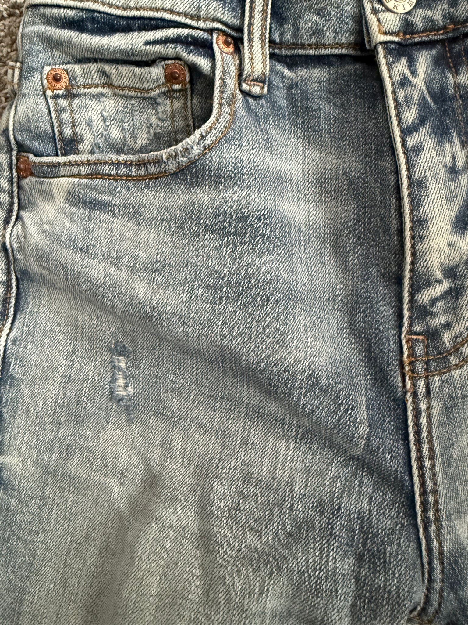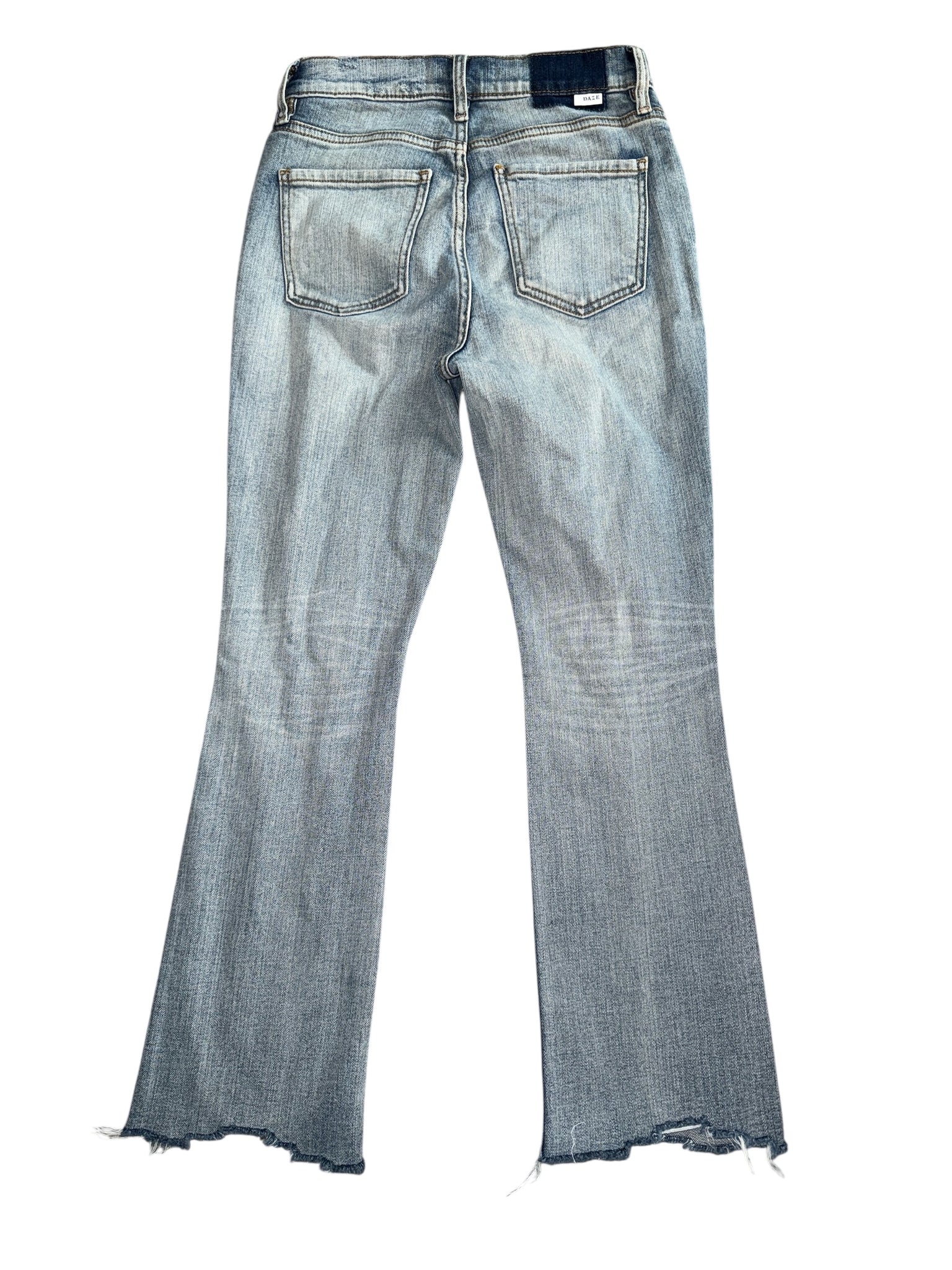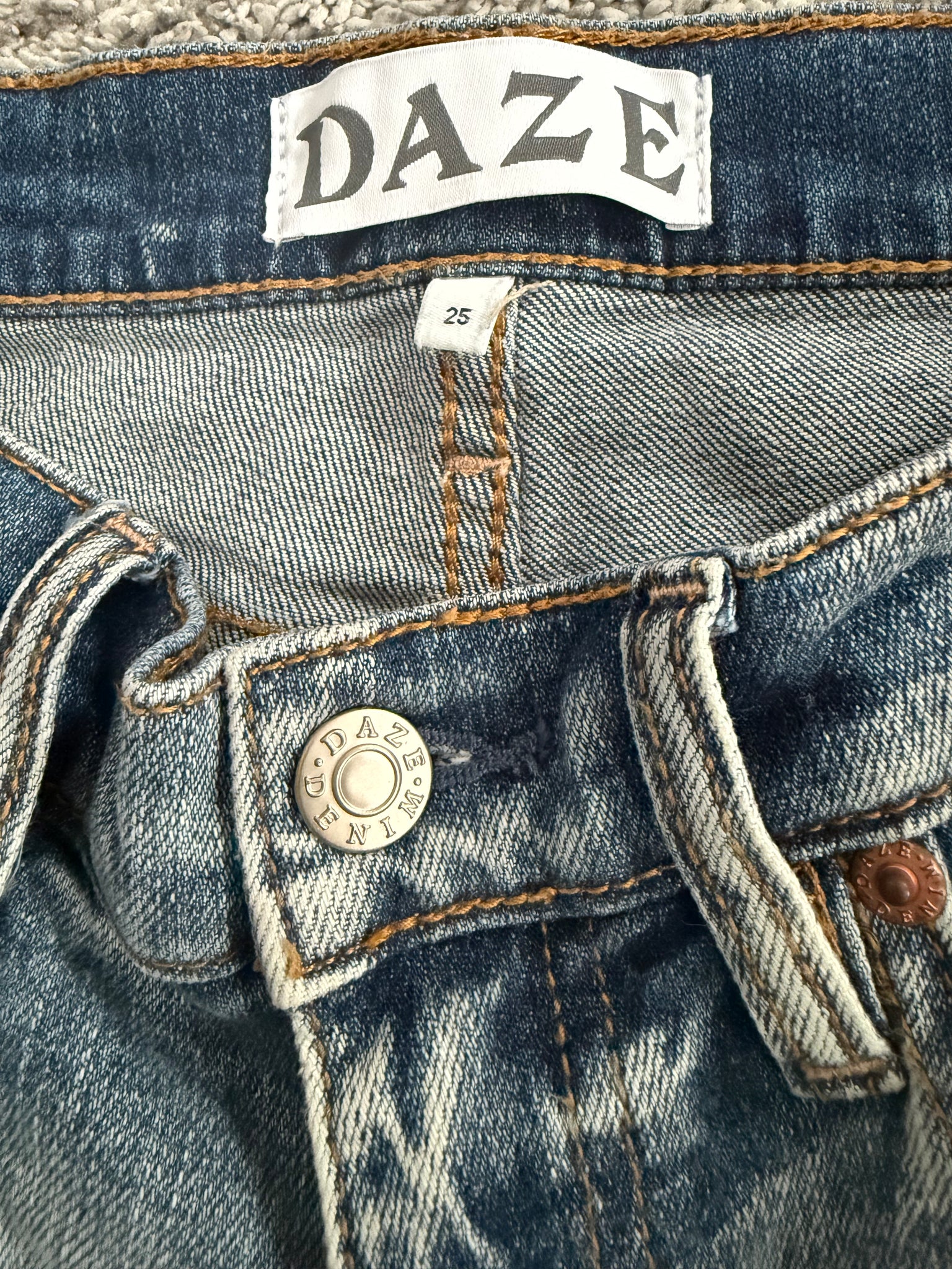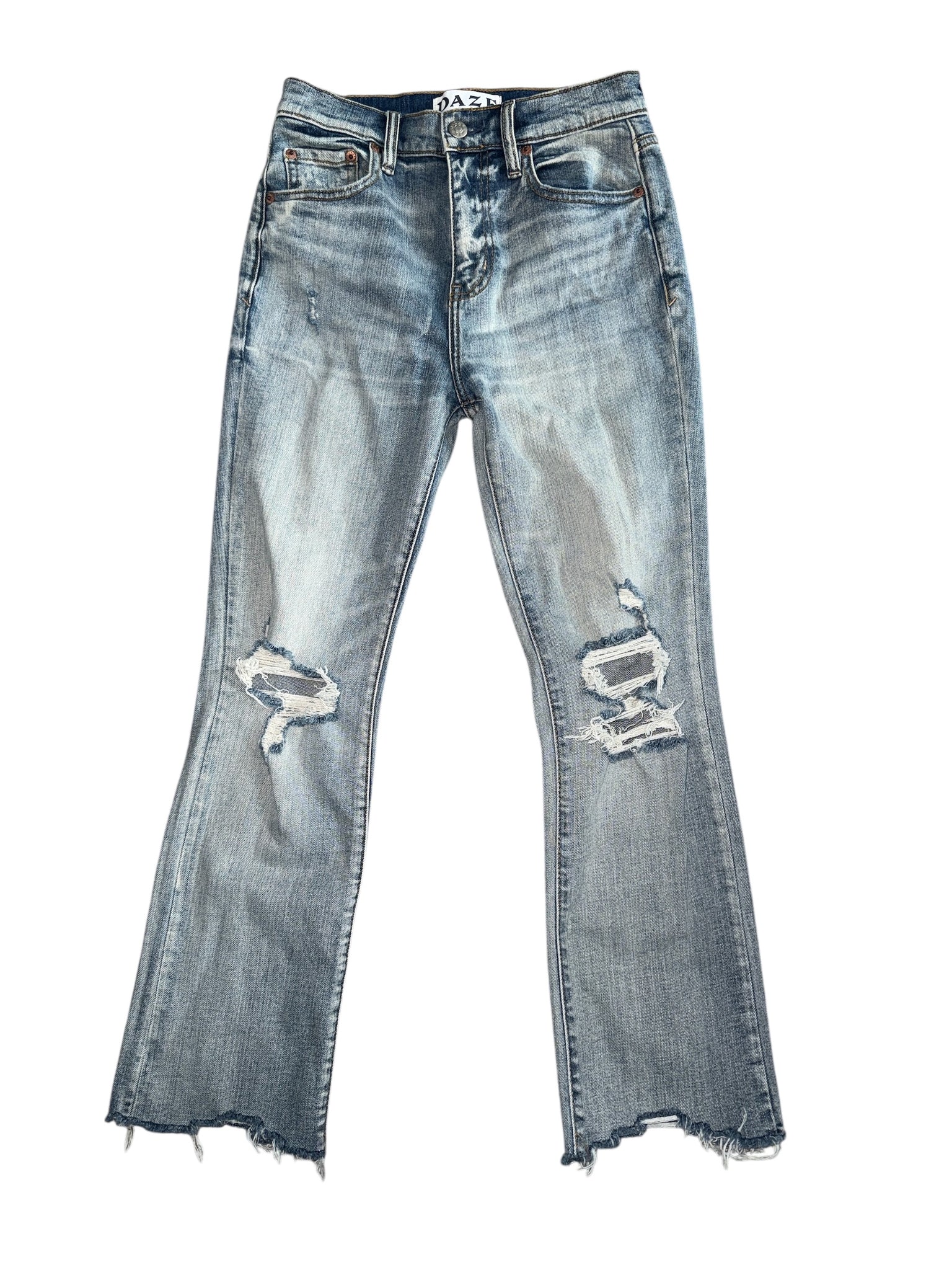 Daze Denim women’s light wash distressed cropped bootcut jeans with rips, size 25.